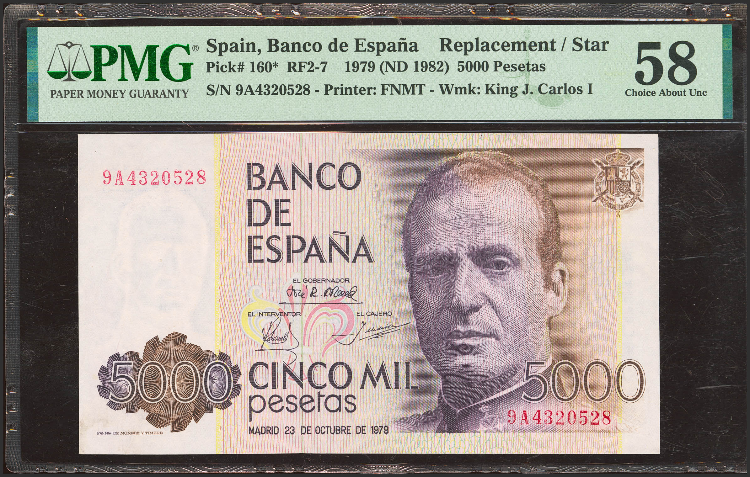 5000 Pesetas. October 23, 1979. Special Series 9A. (Edifil 2023: 478b, Pick: 160). Good Extremely Fine+. PMG58 encapsulation.