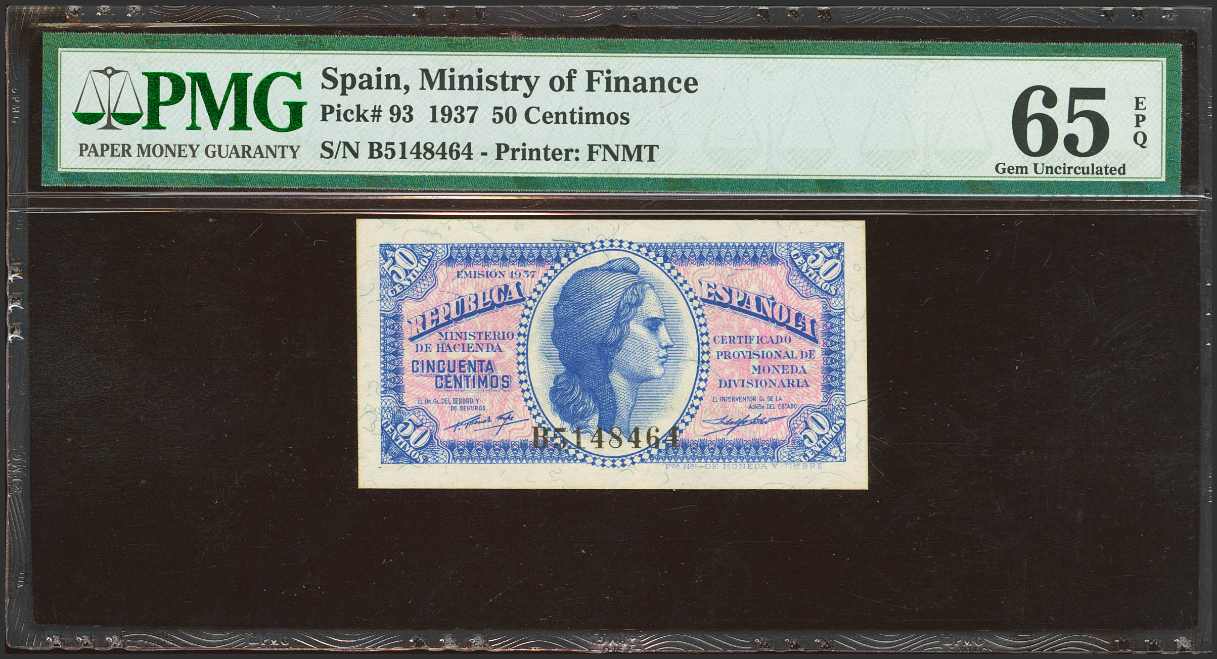 English 50 Cents. 1937. Ministry of Finance. Series B. (Edifil 2023: 391, Pick: 93). Original size. Uncirculated. PMG65EPQ encapsulation.