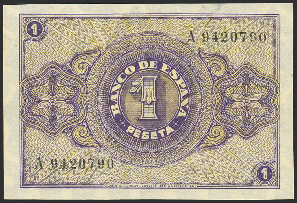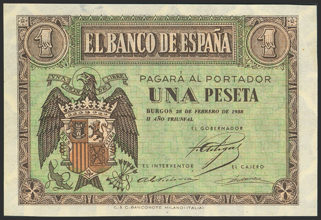 English 1 Peseta. April 30, 1938. Series A. (Edifil 2023: 428). Original size. Uncirculated-.