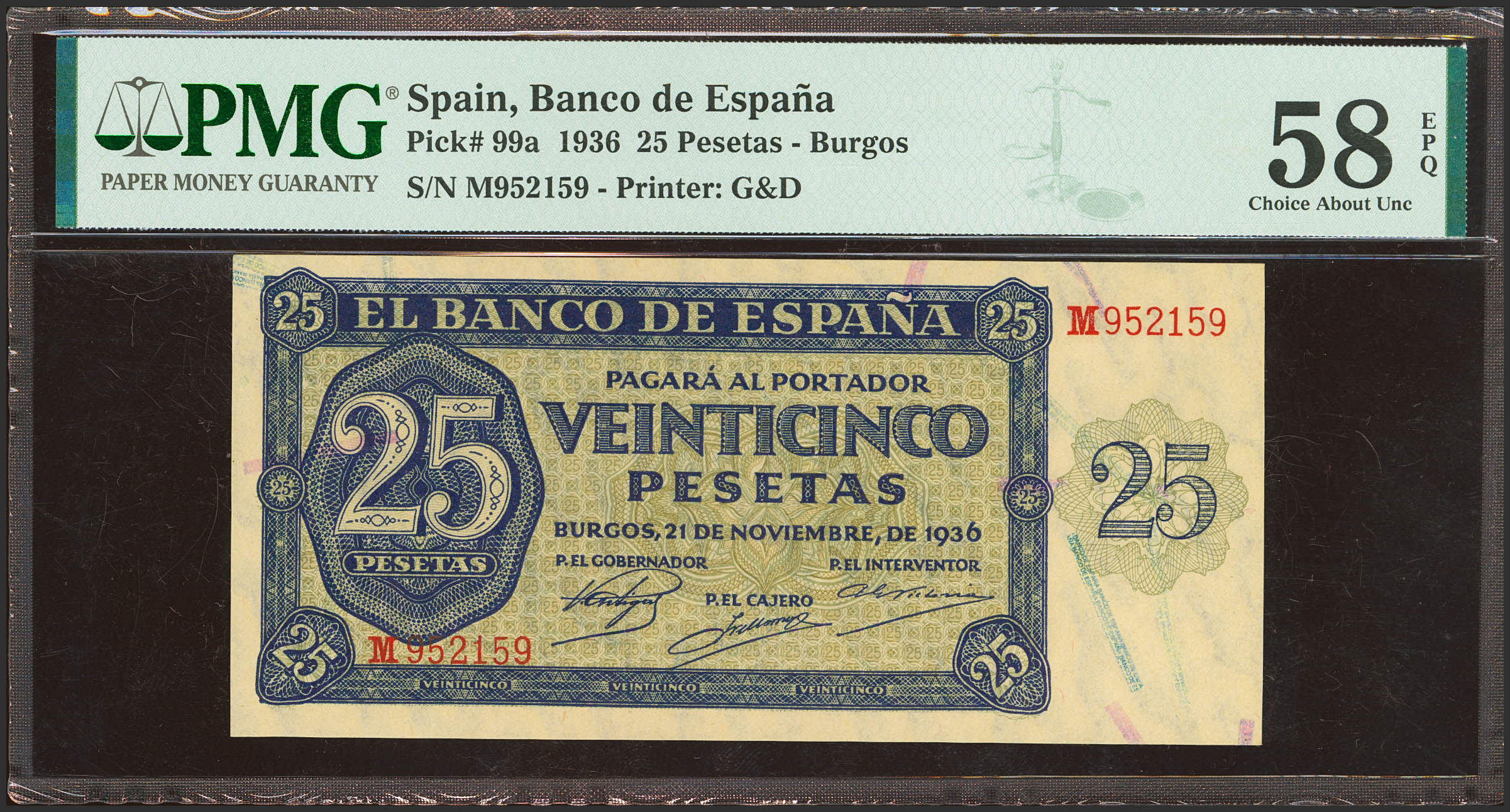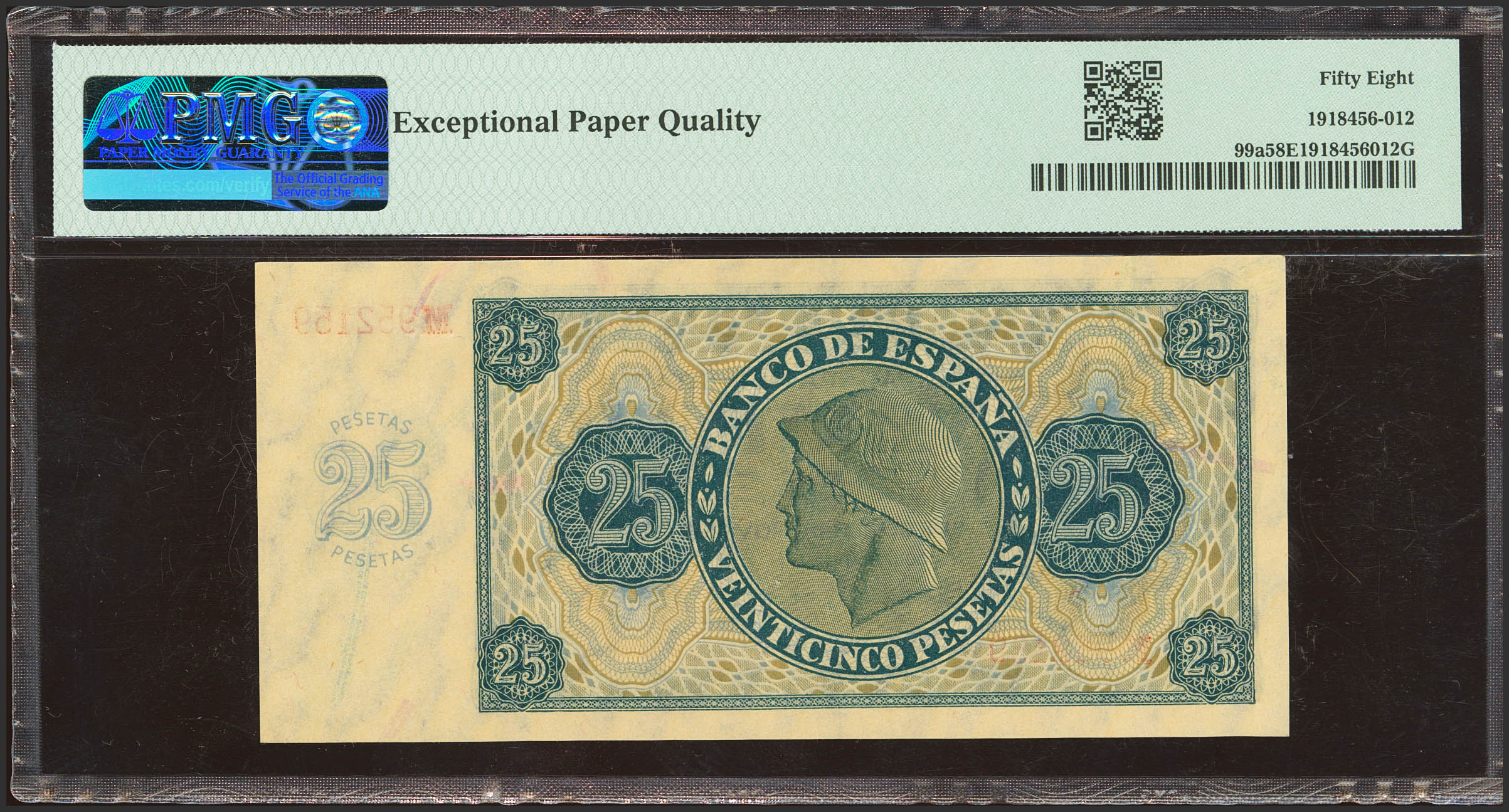 25 Pesetas. November 21, 1936. Series M. (Edifil 2023: 419a, Pick: 99a). Original size. Good Extremely Fine++. Encapsulated PMG58EPQ.