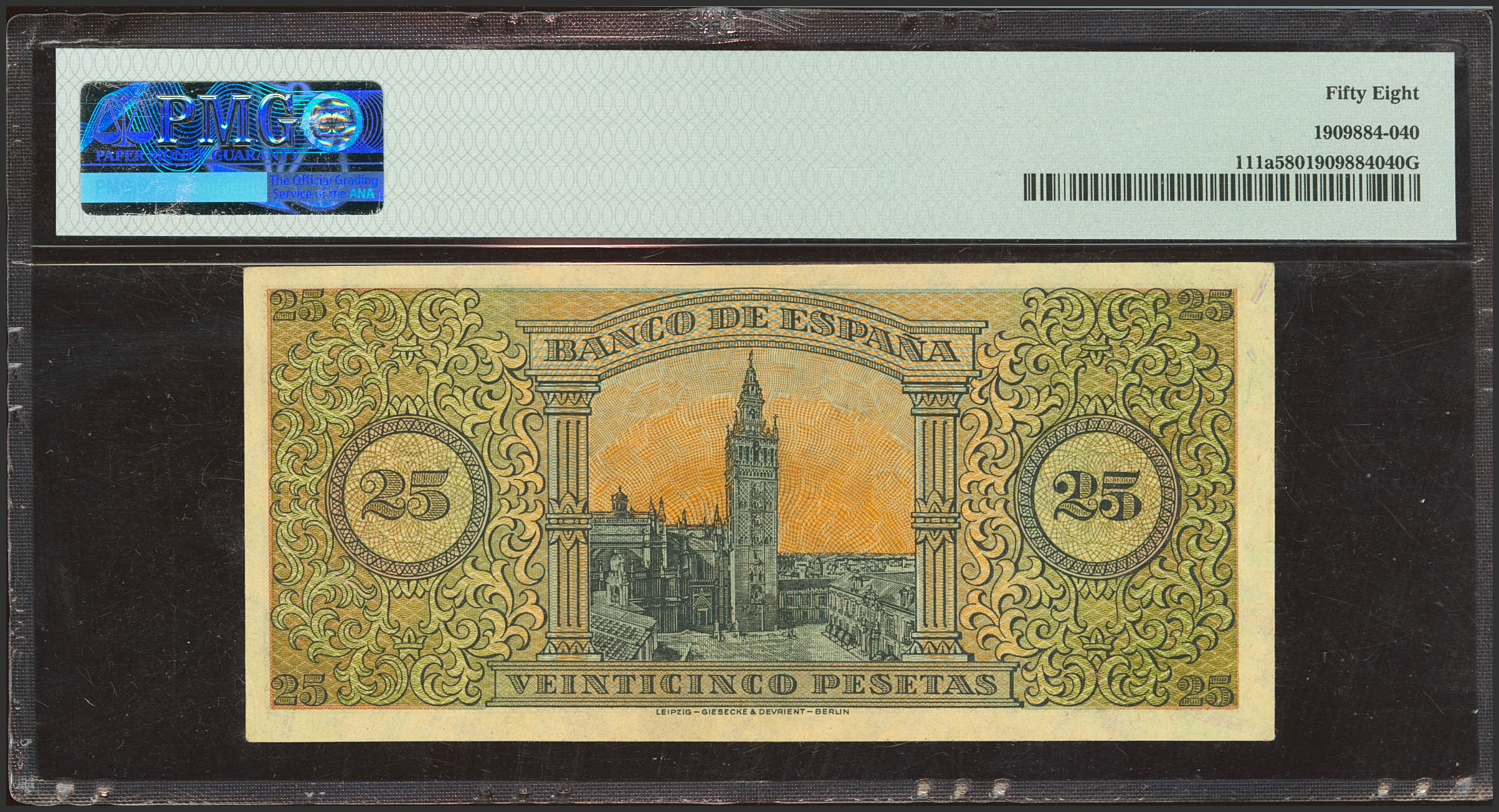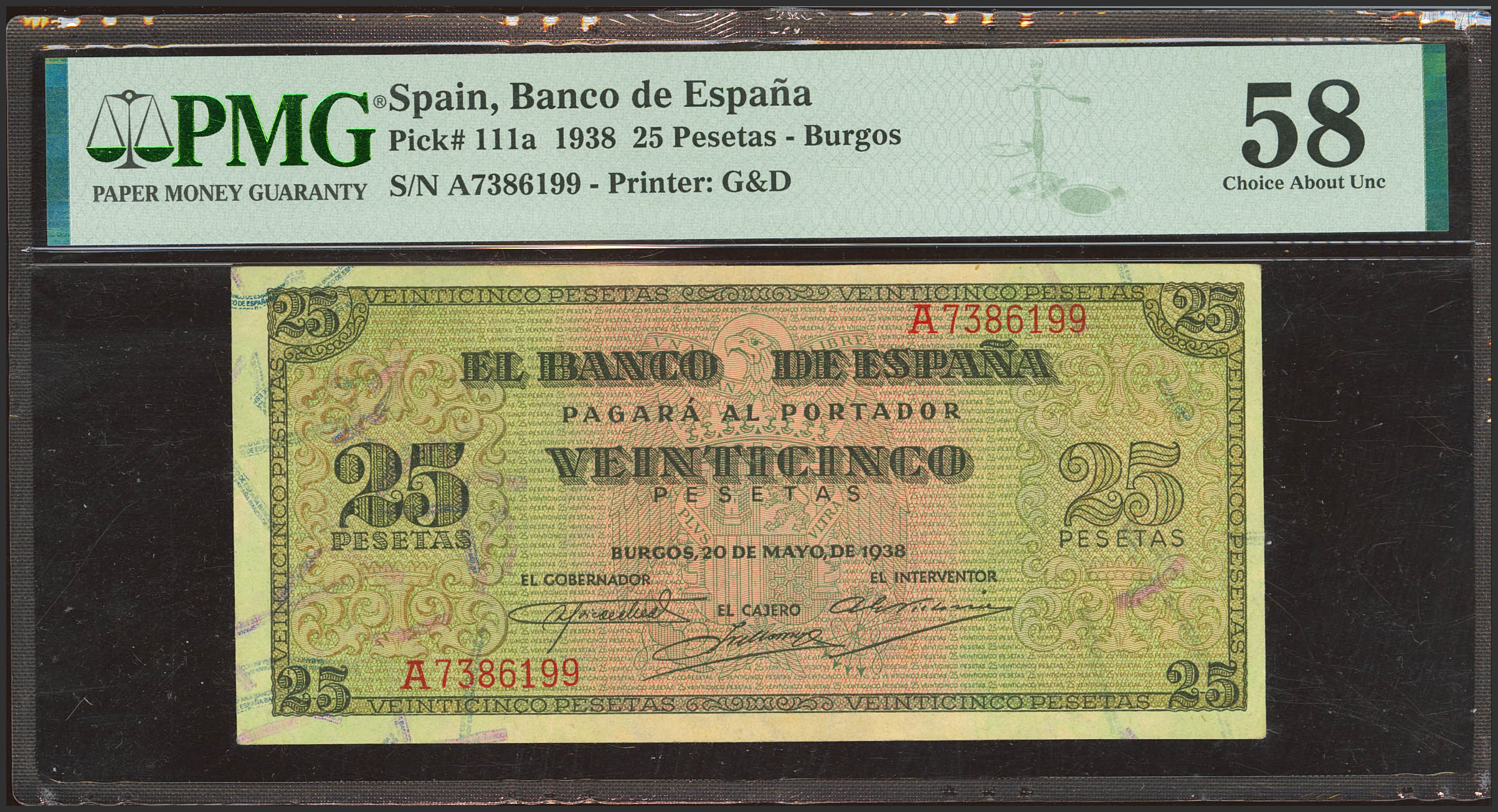 English 25 Pesetas. May 20, 1938. Series A. (Edifil 2023: 430, Pick: 111a). Good Extremely Fine+. PMG58 package.