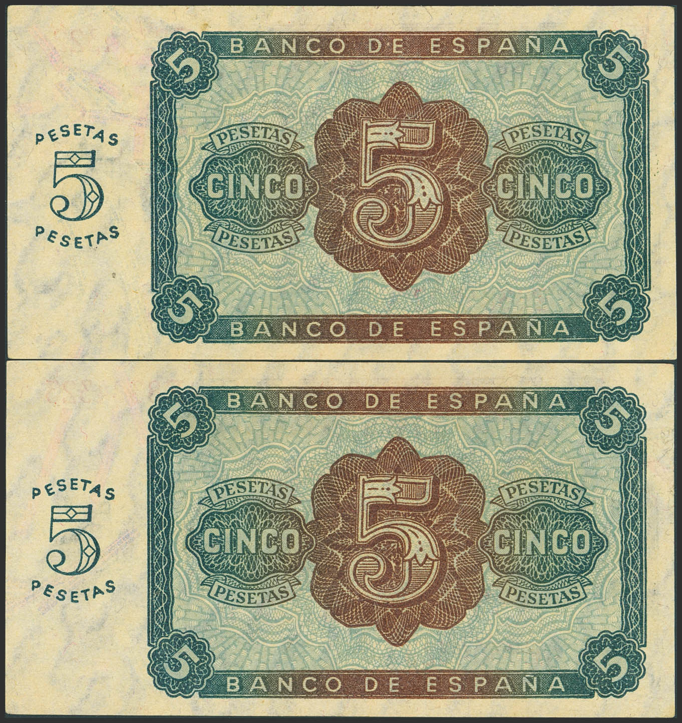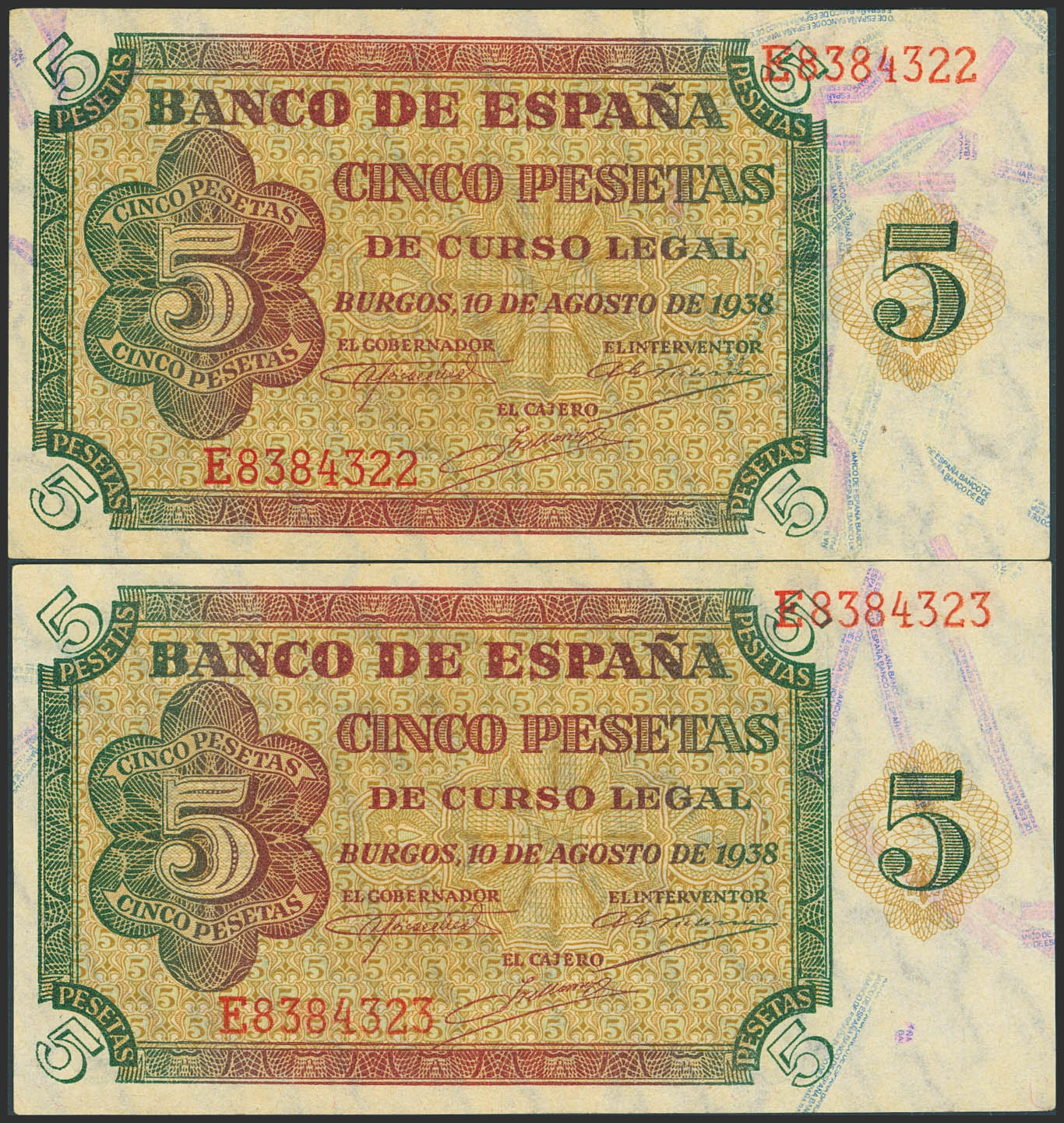 5 Pesetas. August 10, 1938. Corresponding pair. Series E. (Edifil 2023: 435a). Some of their original size is retained. Extremely Fine.