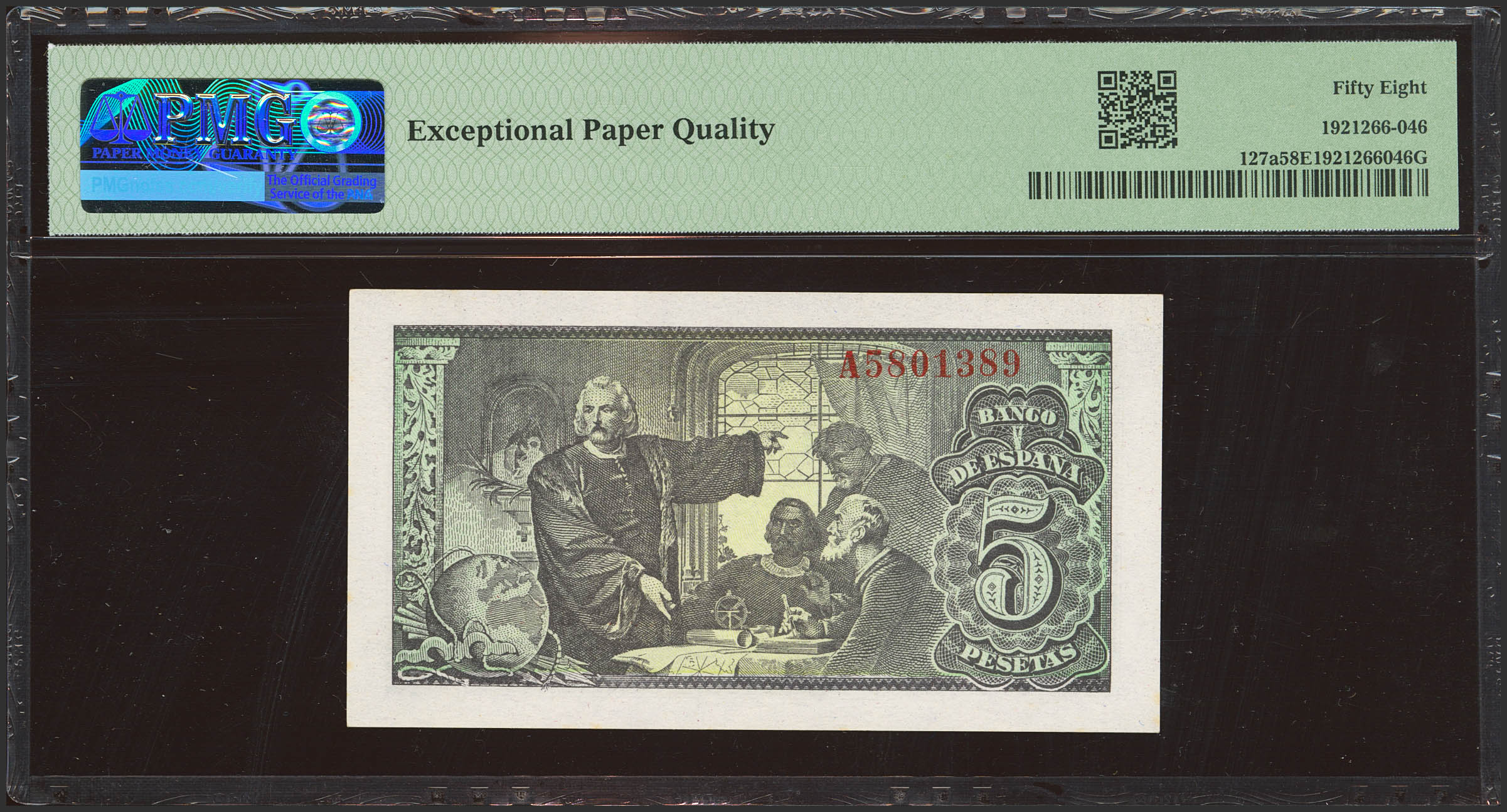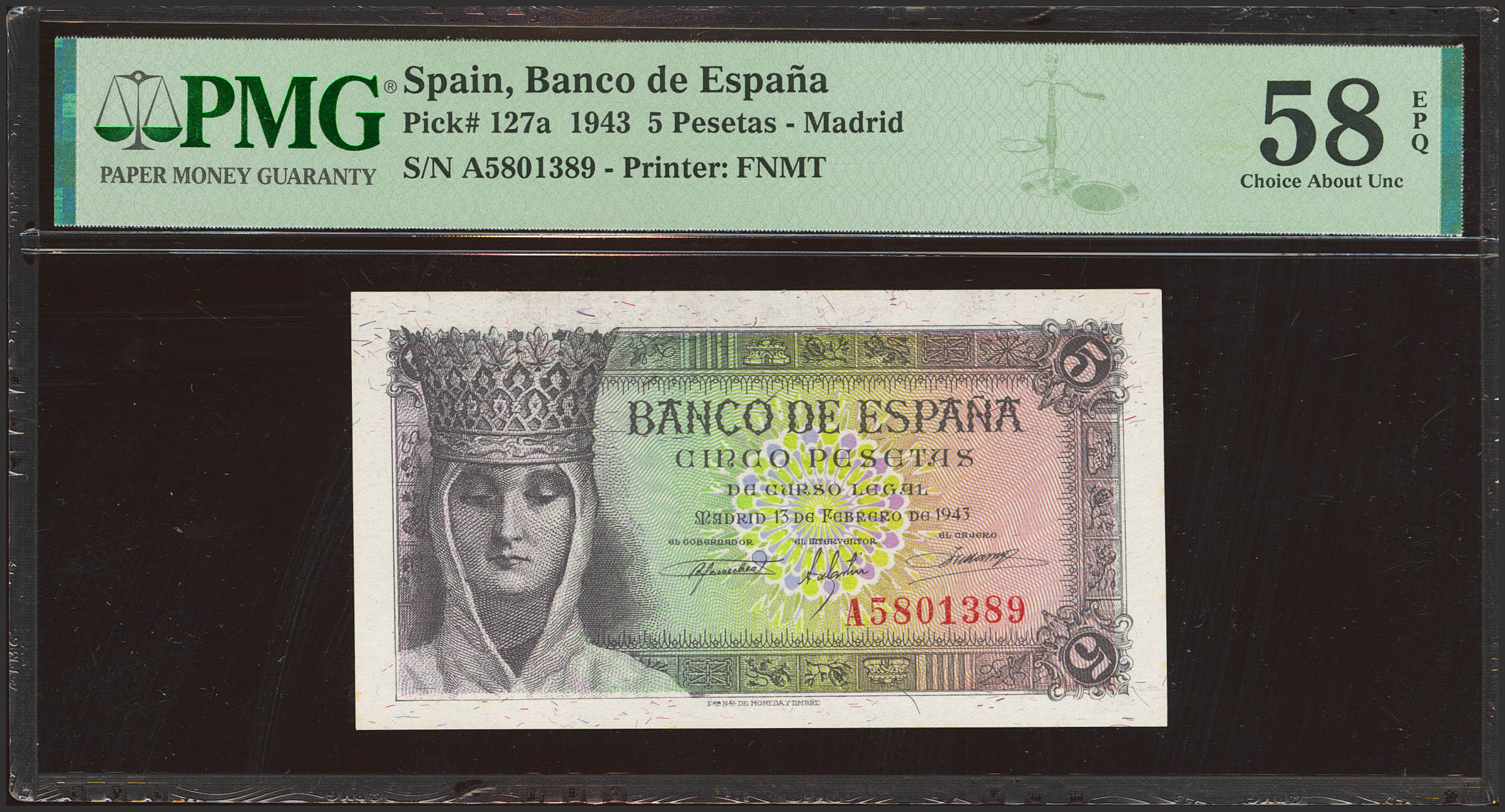 5 Pesetas. February 13, 1943. Series A. (Edifil 2023: 446a, Pick: 127a). Original size. Uncirculated. Encapsulated PMG58EPQ.
