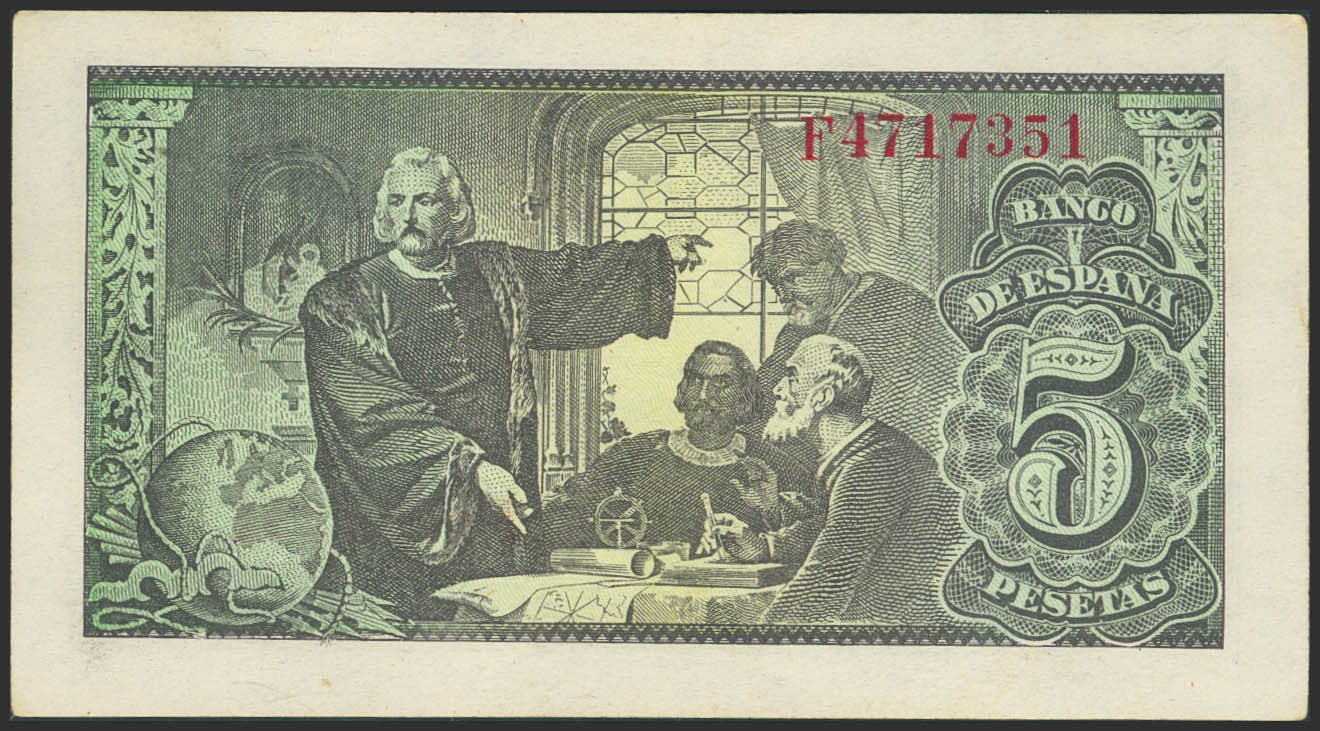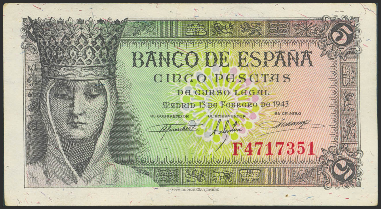5 Pesetas. February 13, 1943. Series F. (Edifil 2023: 446a). Original size. Uncirculated--.