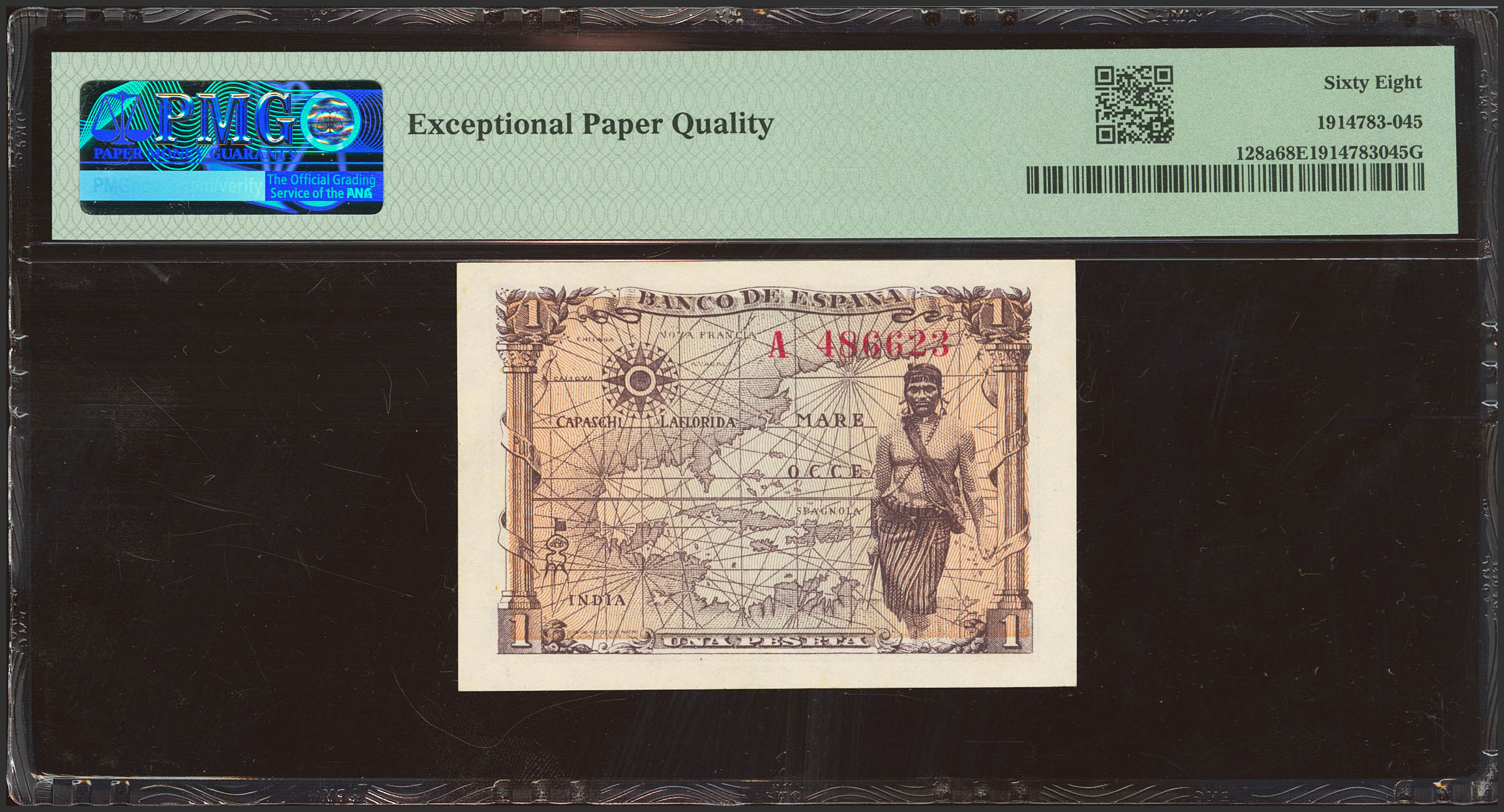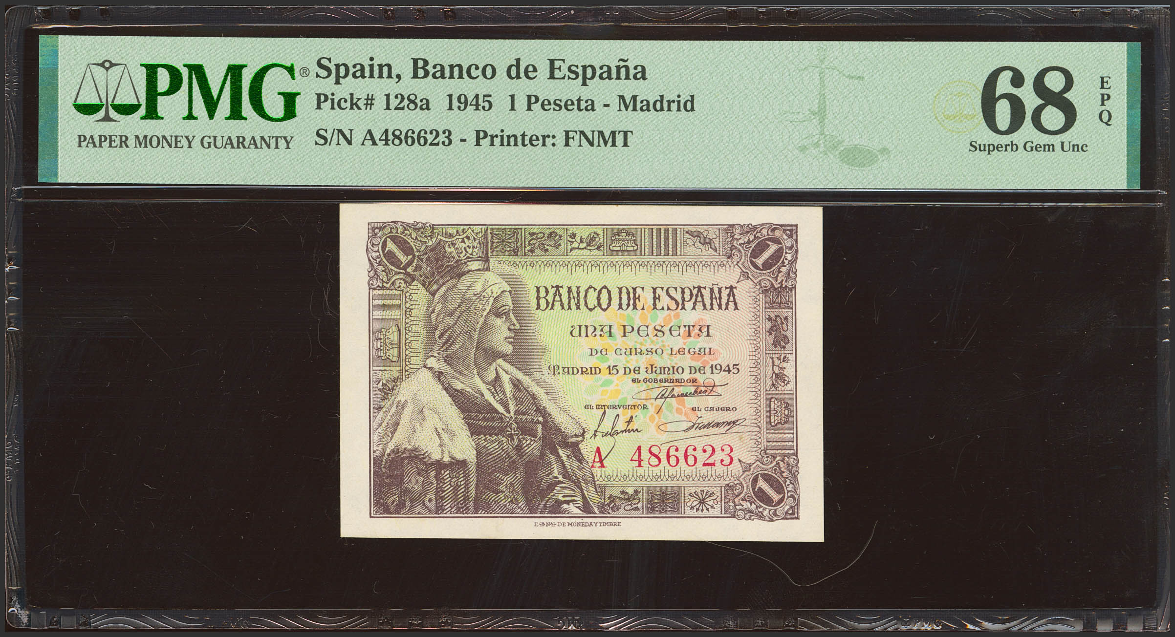 English 1 Peseta. June 15, 1945. Series A. (Edifil 2023: 448a). Original size. Uncirculated. Encapsulated PMG68EPQ.