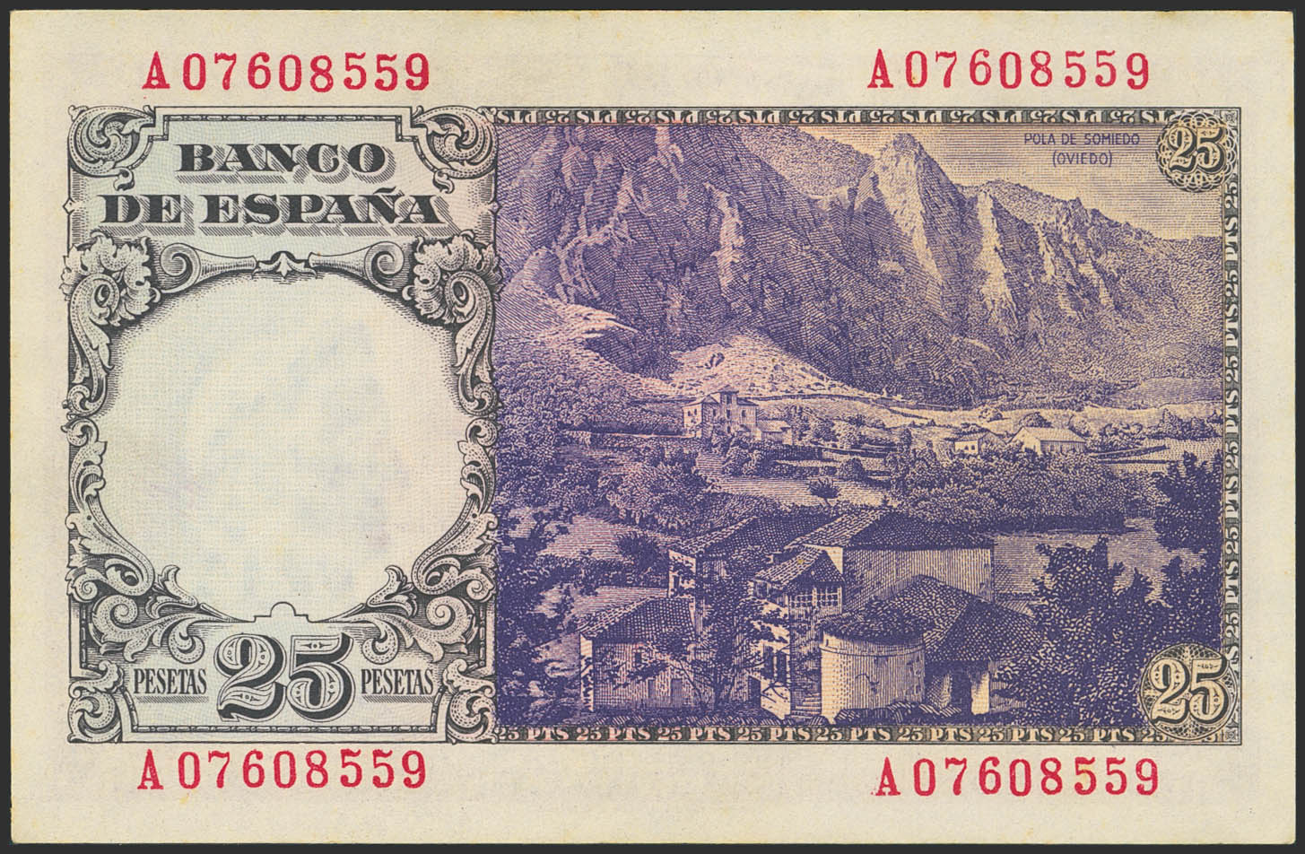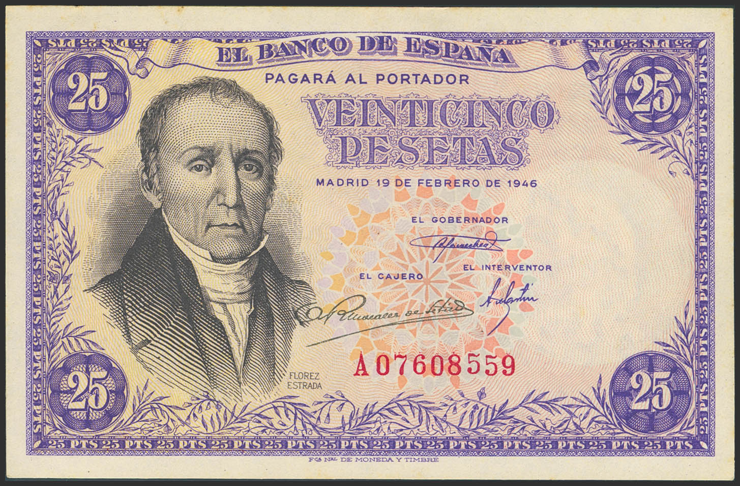 English 25 Pesetas. February 19, 1946. Series A. (Edifil 2023: 450a). Original size. Uncirculated-.