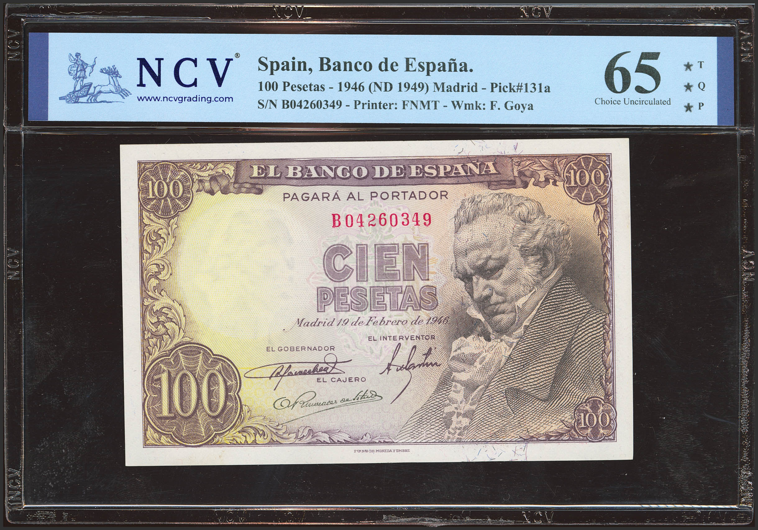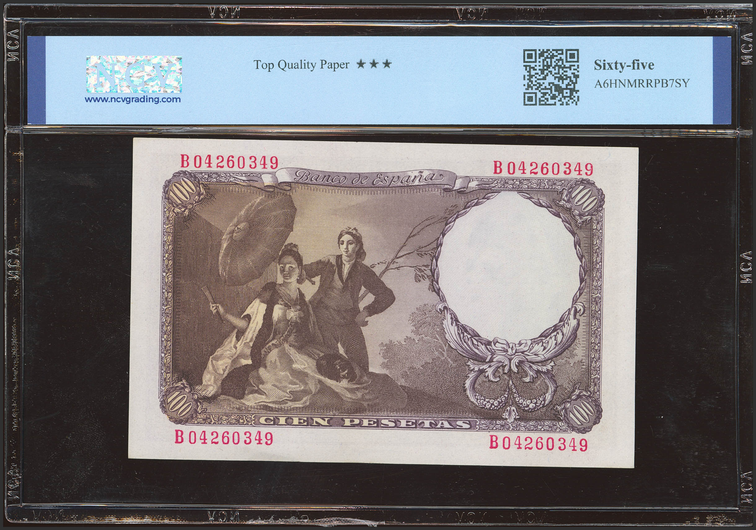 English 100 Pesetas. February 19, 1946. Series B. (Edifil 2021: 451b). Unusual in this quality, original sizing. Uncirculated. Encapsulated NCV65TQP.