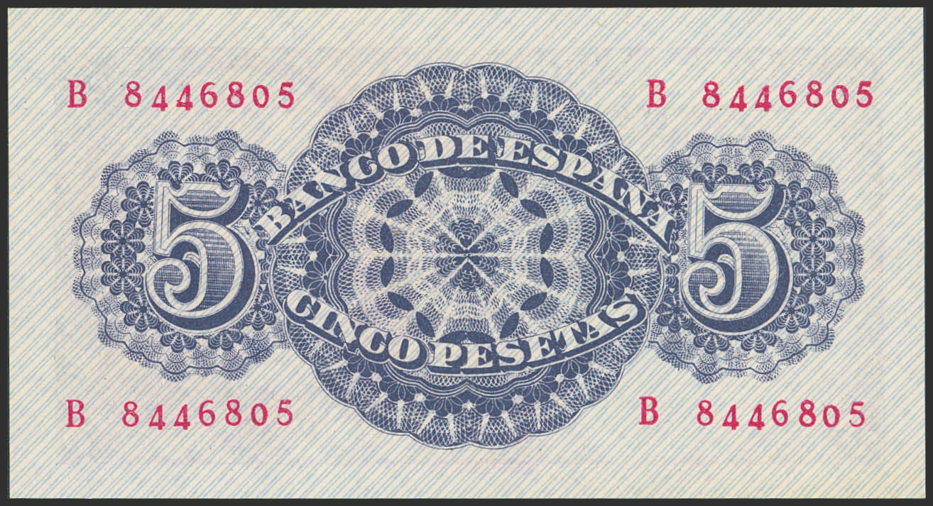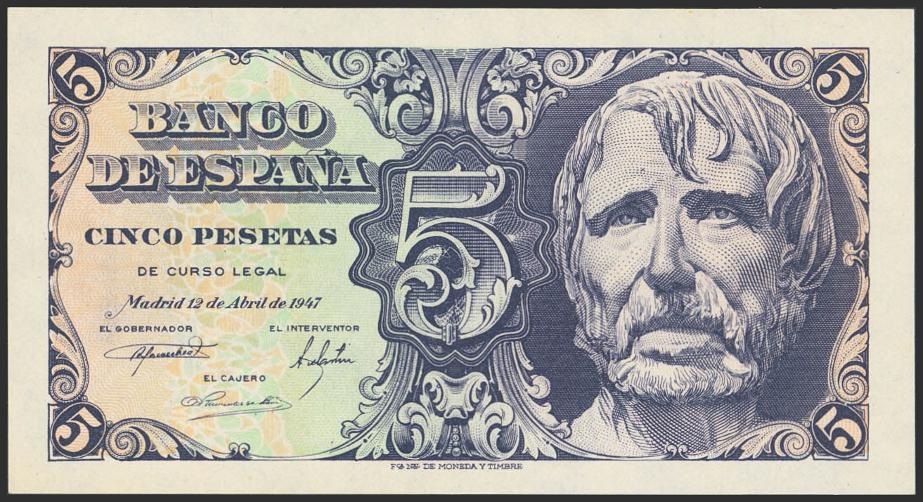 5 Pesetas. April 12, 1947. Series B. (Edifil 2023: 454a). Original size. Uncirculated.