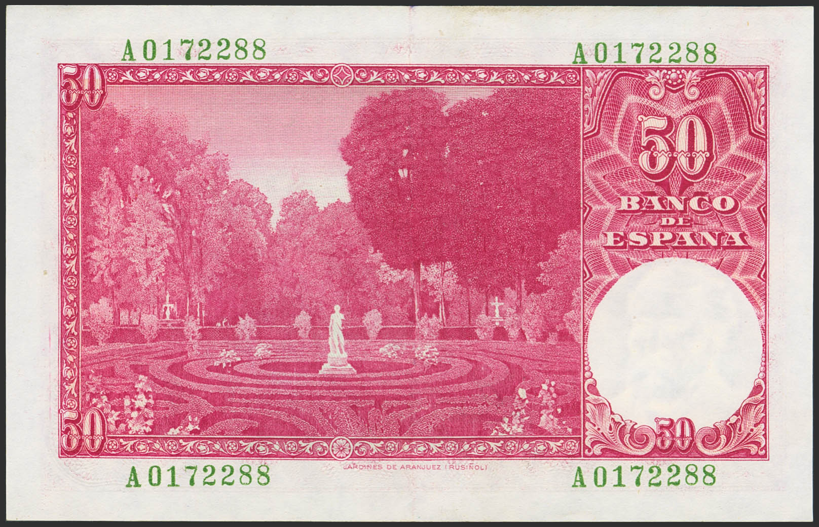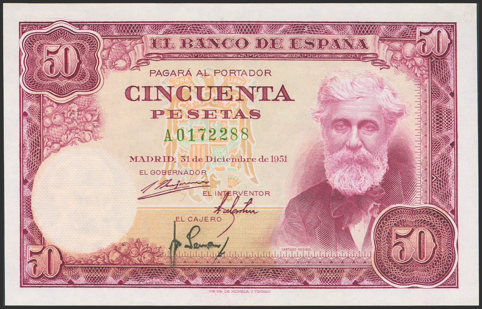 50 Pesetas. December 31, 1951. Series A. (Edifil 2023: 462a). It retains much of its original size. Good Extremely Fine.