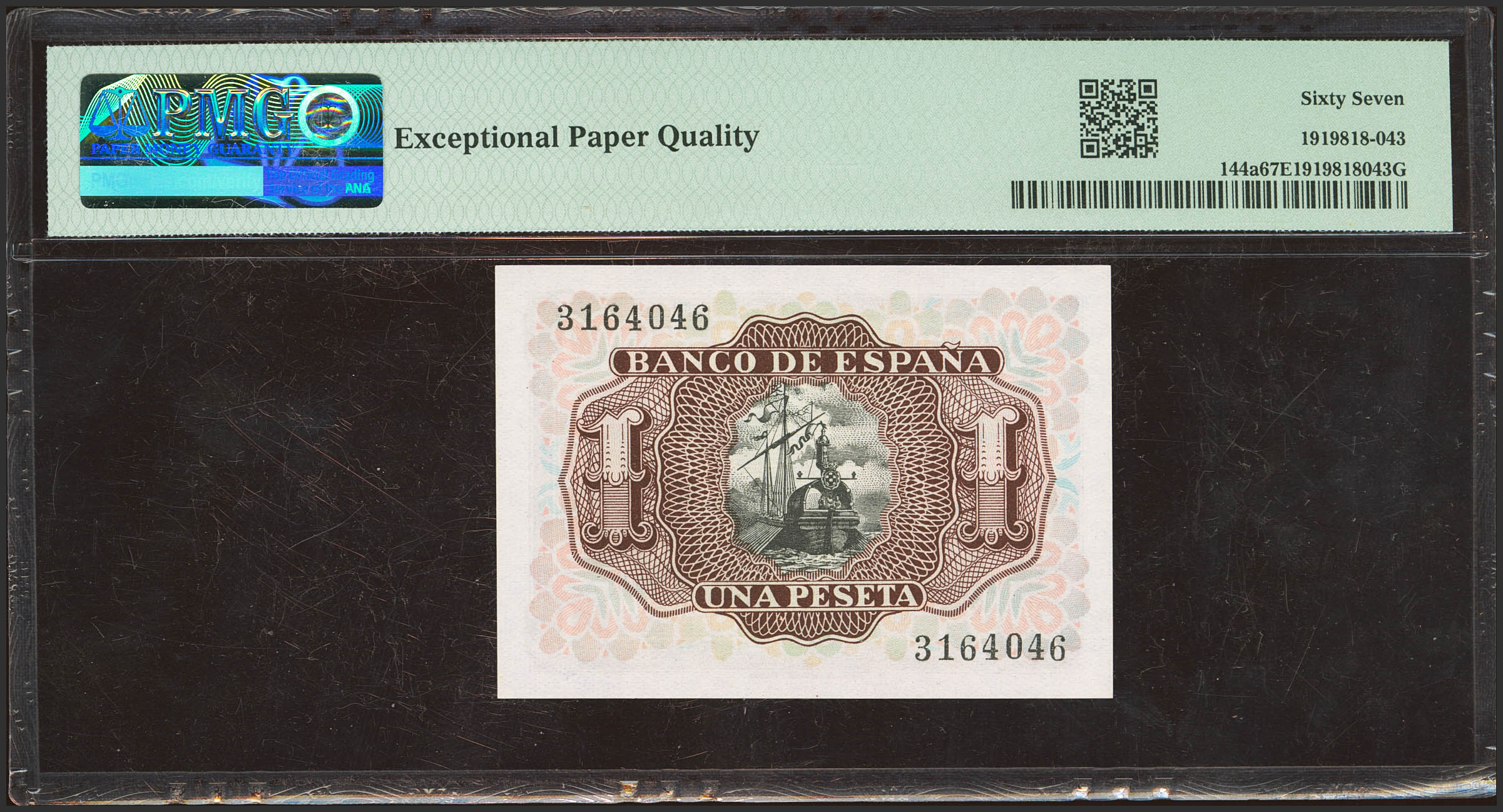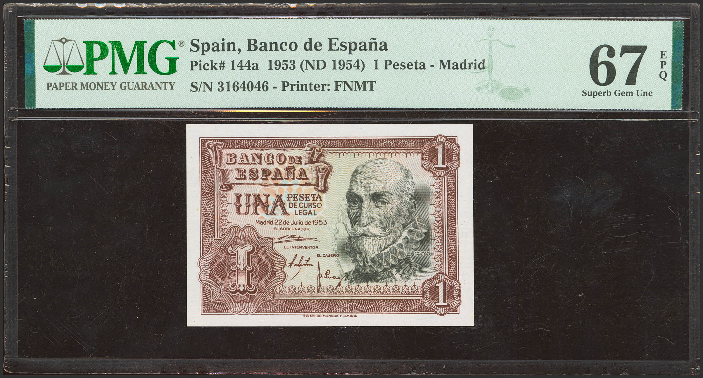 1 Peseta. July 22, 1953. No serial number. (Edifil 2023: 465, Pick: 144a). Original size. Unopened. PMG67EPQ encapsulation.