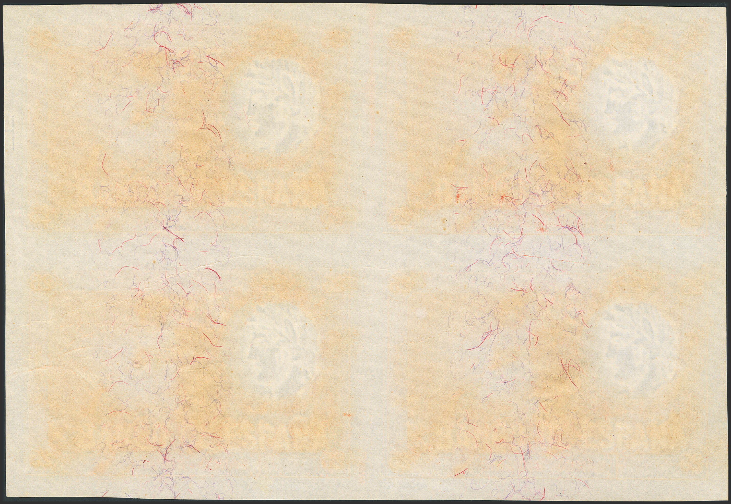 English Color proof of the reverse of the unissued 25 Pesetas in orange, in a block of four, from the December 1, 1908 issue. (Edifil 2023: NE14Pf). Extraordinarily rare in a block. Uncirculated.