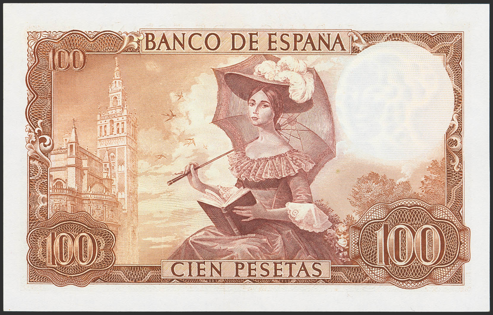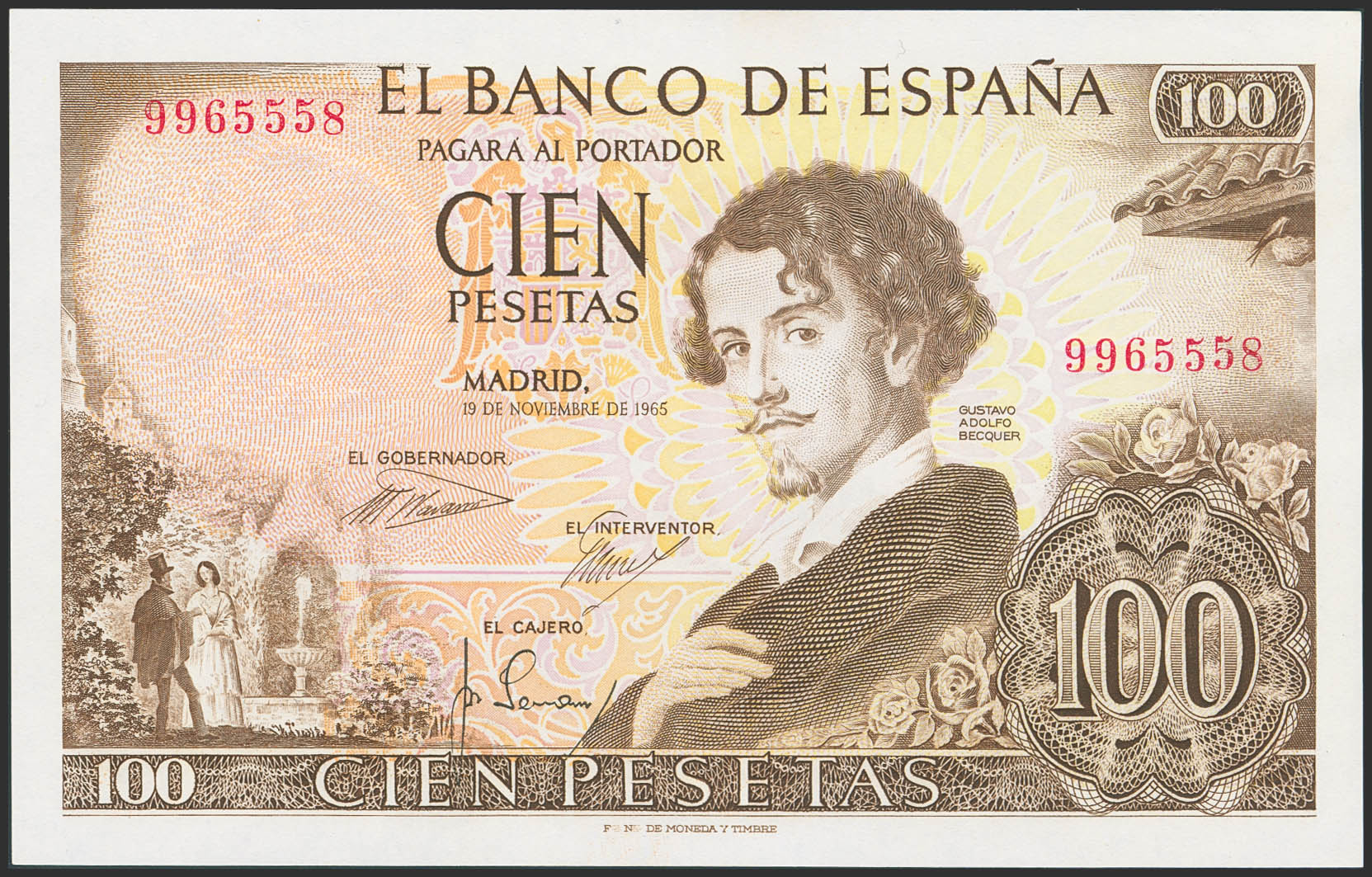 100 Pesetas. November 19, 1965. No series. (Edifil 2023: 470). Original size. Unused.