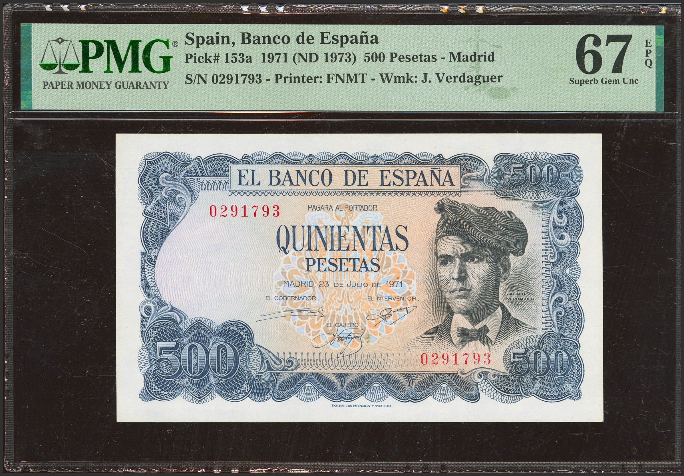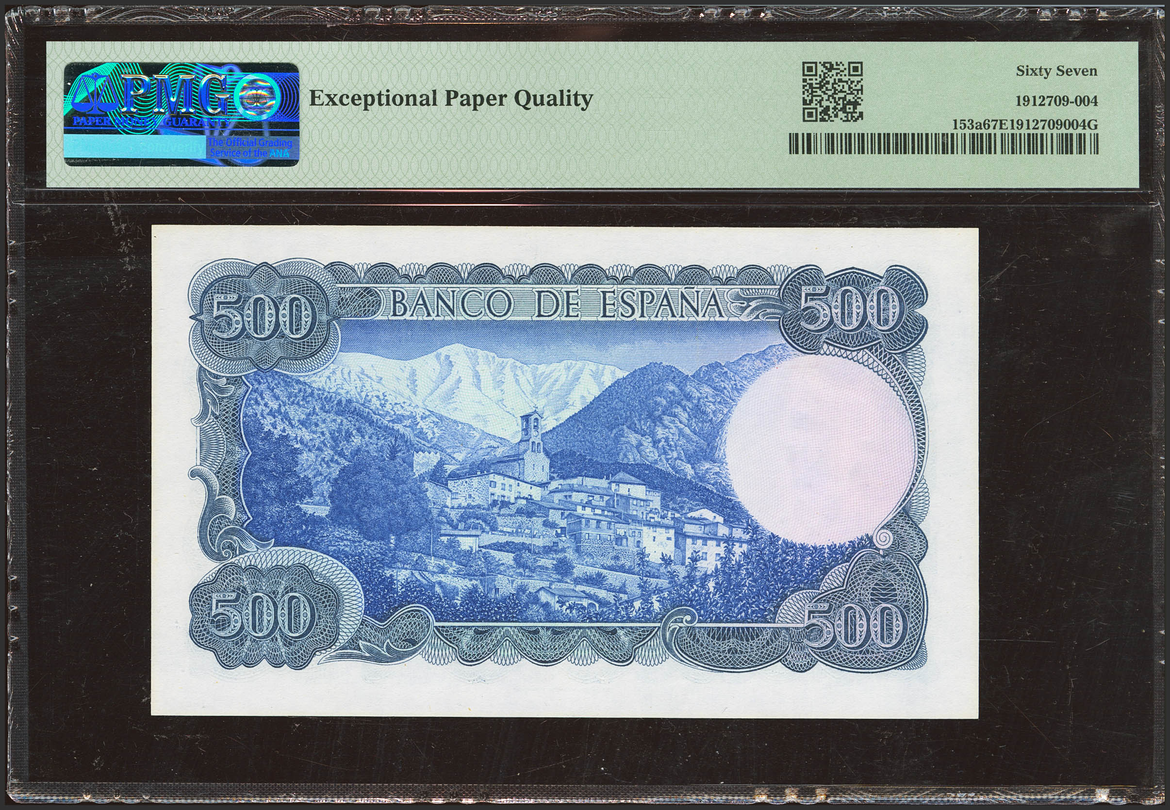 English 500 Pesetas. July 23, 1971. No serial number. (Edifil 2023: 473, Pick: 153a). Rare in this quality, original finish. Encapsulated PMG67EPQ.