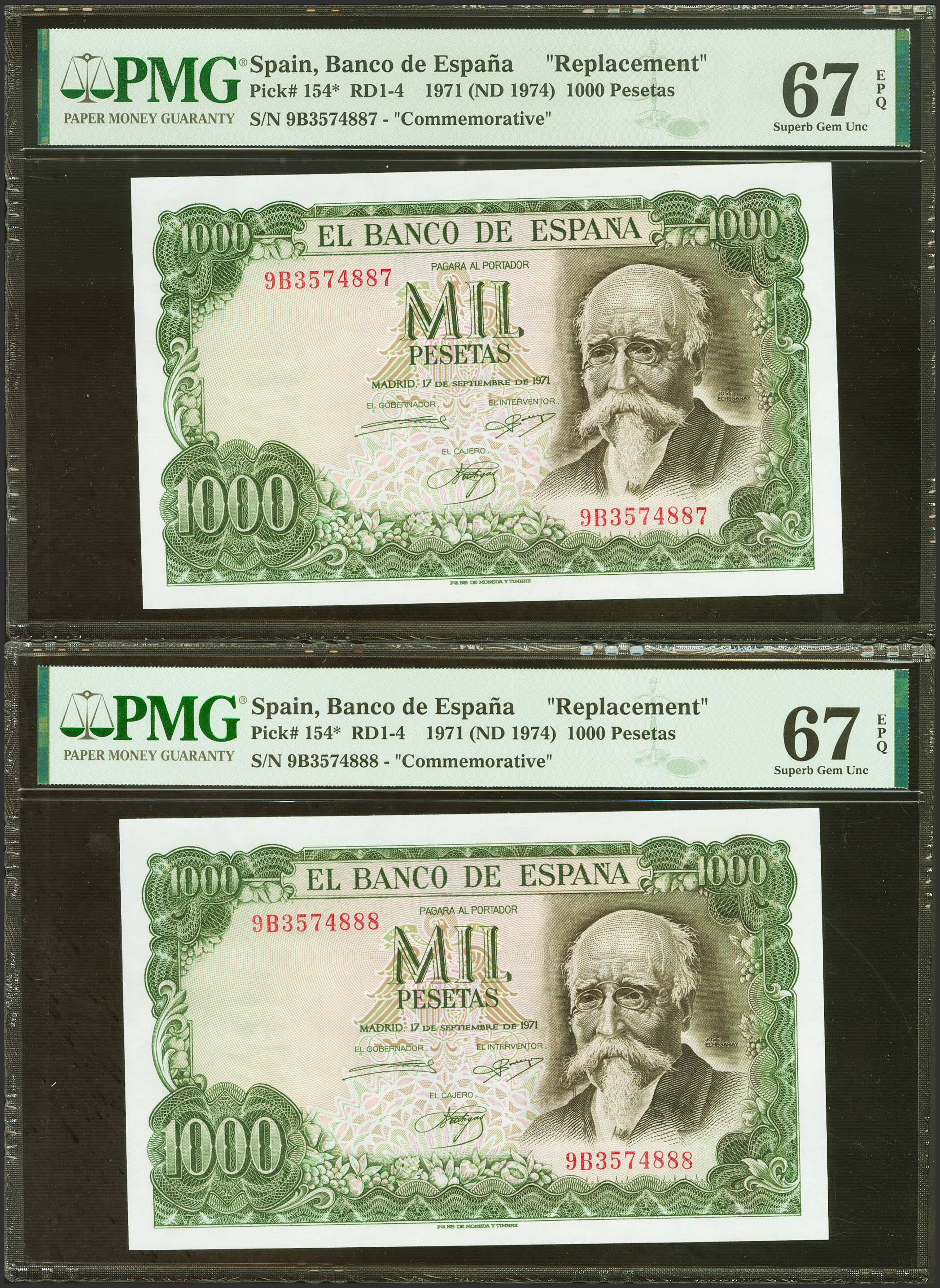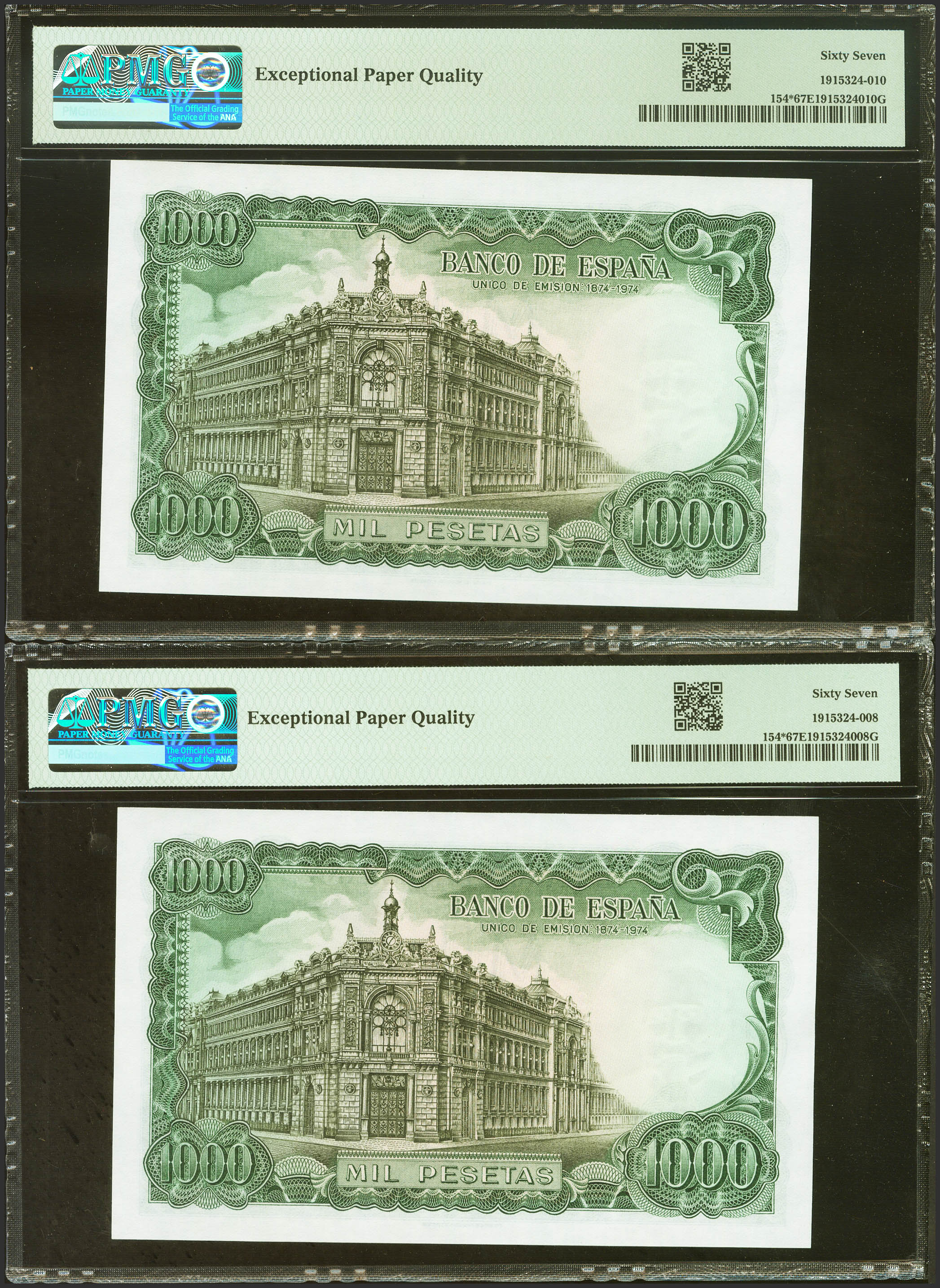 1000 Pesetas. September 17, 1971. Correlative pair. Special series 9B. (Edifil 2023: 474d, Pick: 154*). Very rare in this exceptional quality, even more so in a pair, original finish. Original unopened. Both encapsulated in PMG67EPQ.