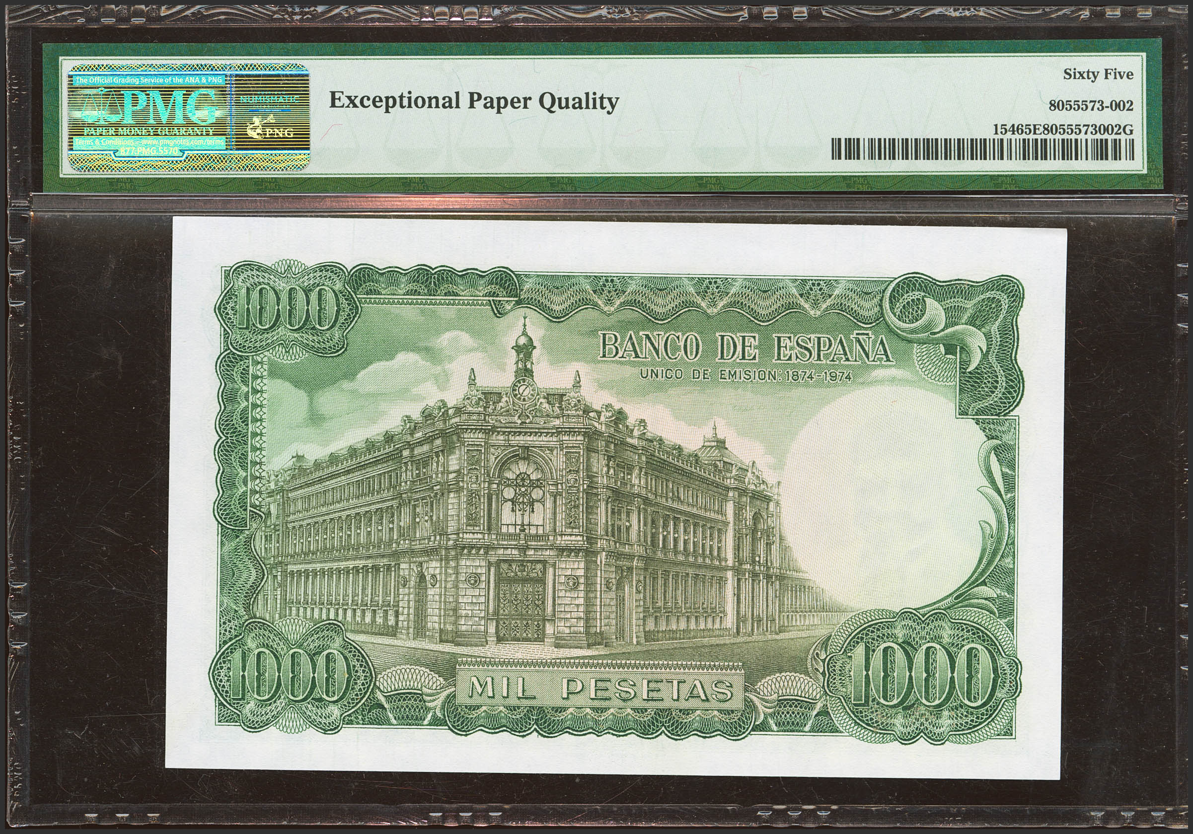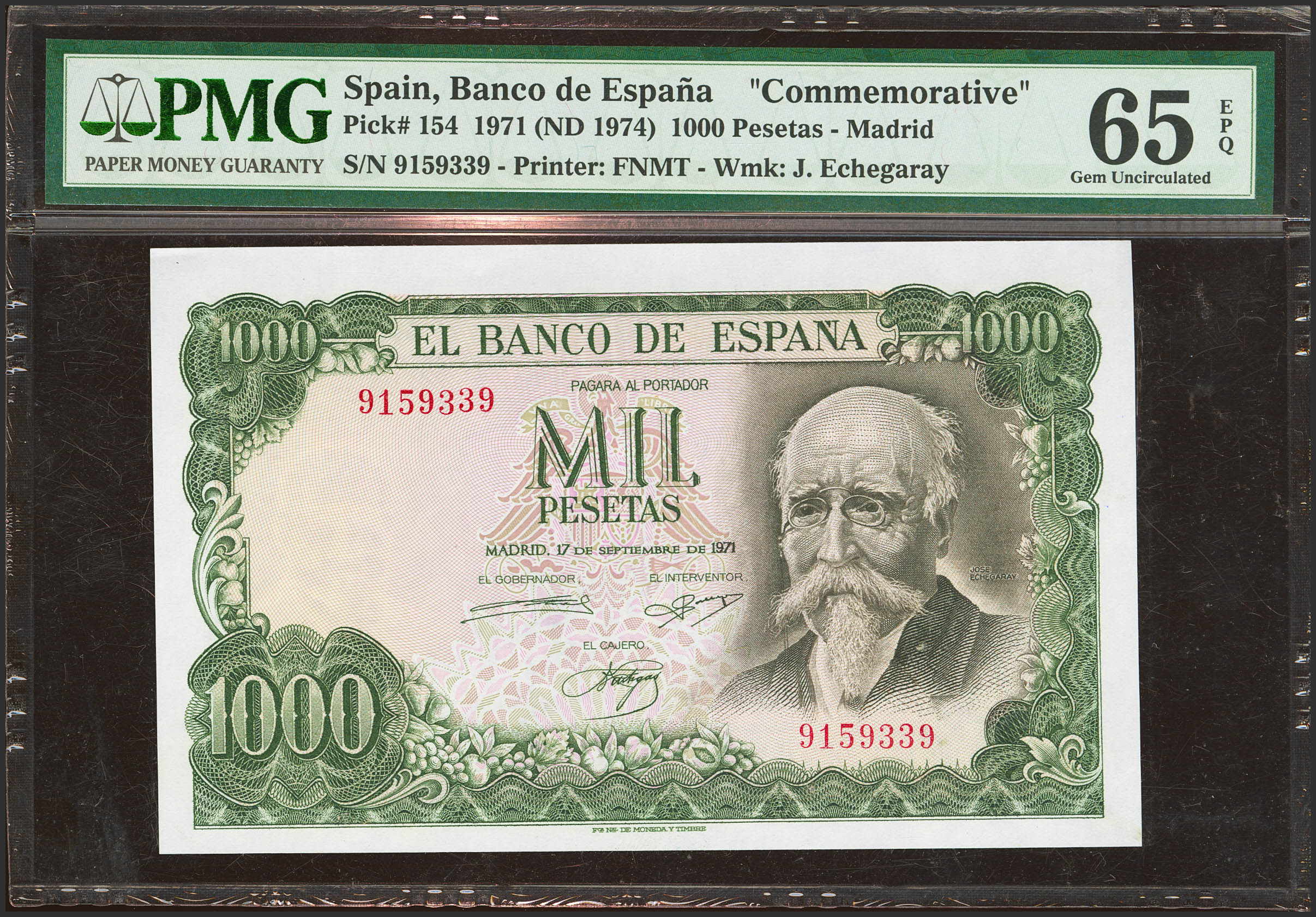 1000 Pesetas. September 17, 1971. No serial number. (Edifil 2023: 474, Pick: 154). Rare in this quality, original finish. Packaged PMG65EPQ.