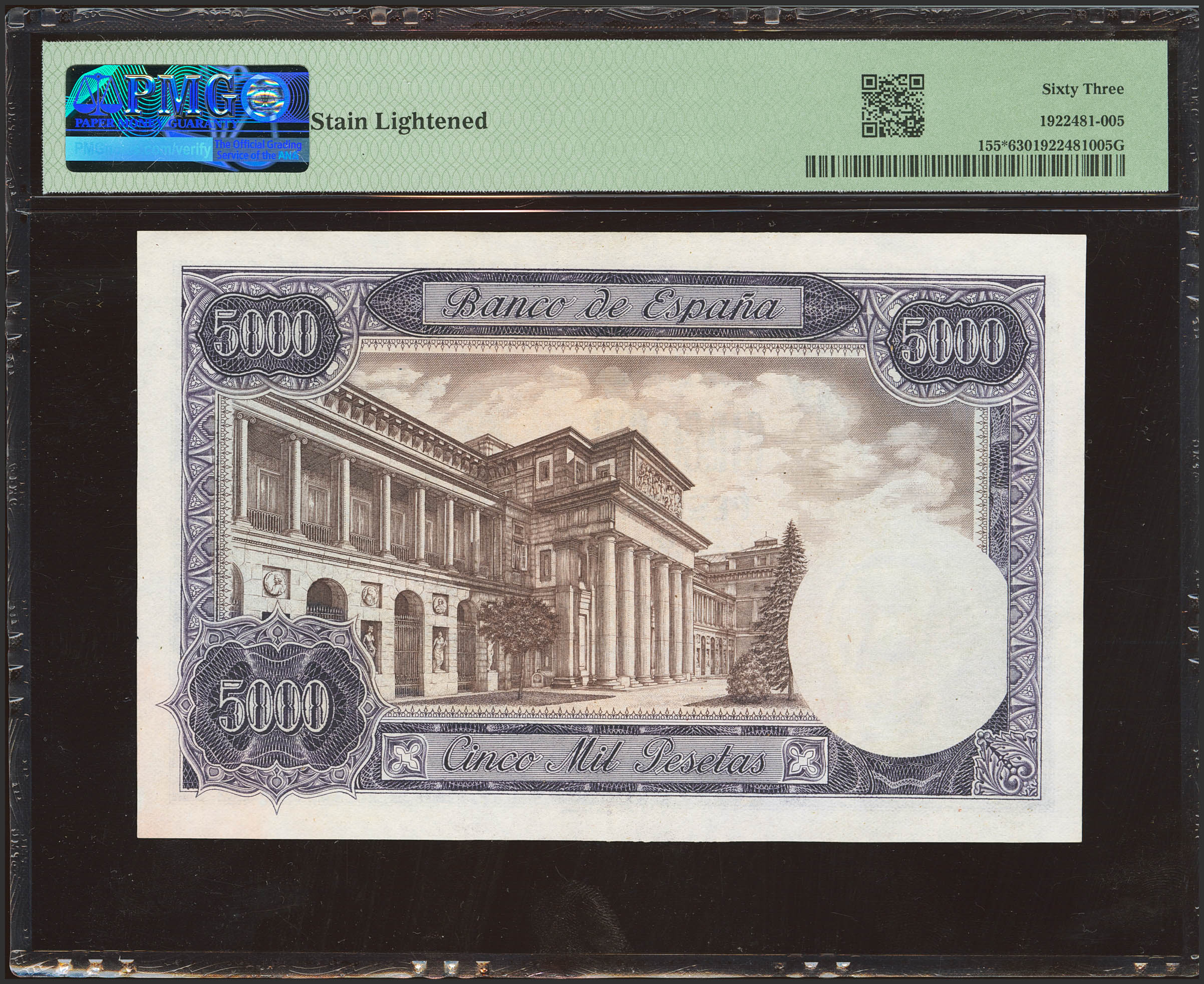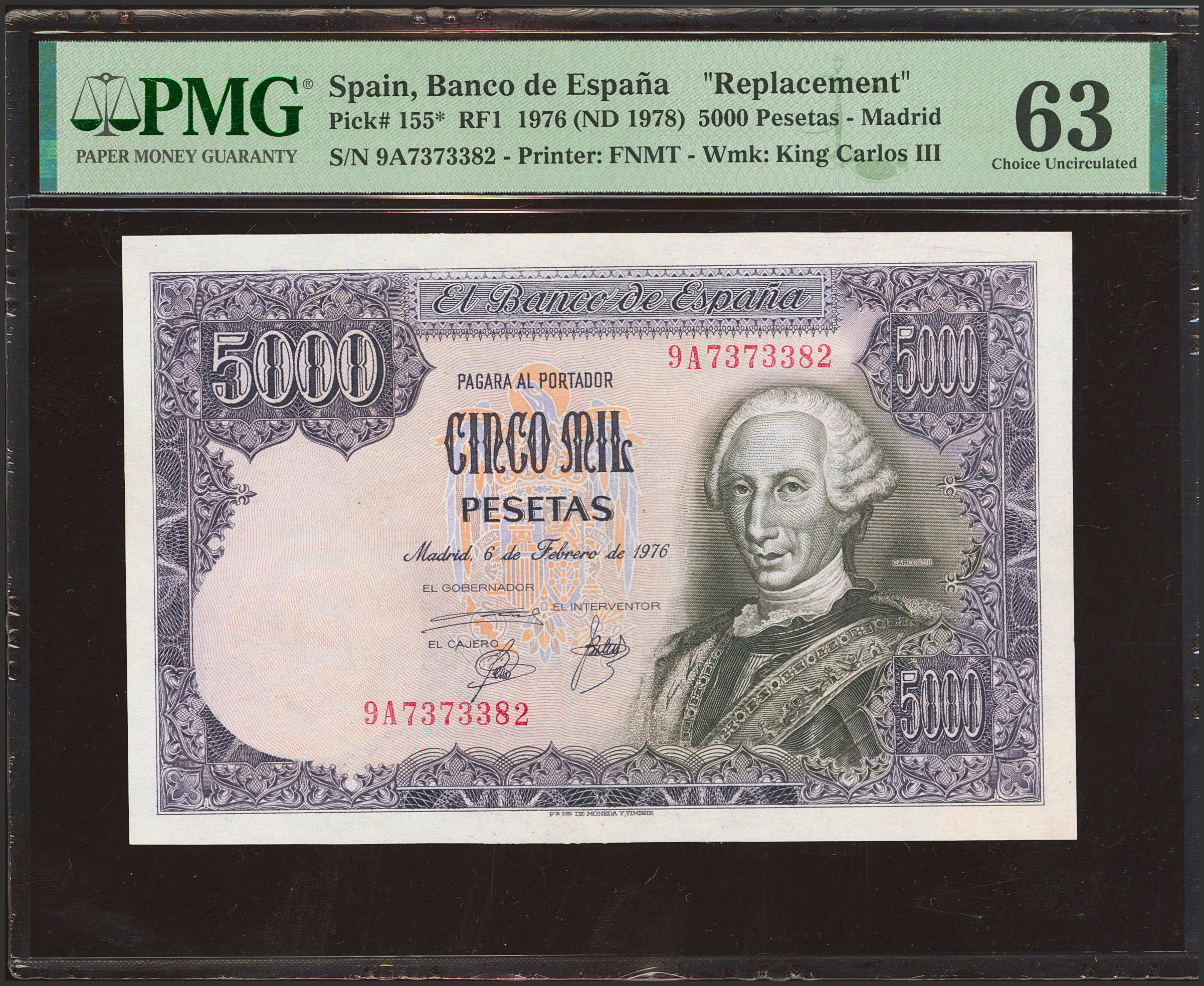 English 5000 Pesetas. February 6, 1976. Special Series 9A. (Edifil 2023: 475b, Pick: 155*). Extremely rare in this exceptional quality, original finish. Unused. PMG63 (stain lightened) case.
