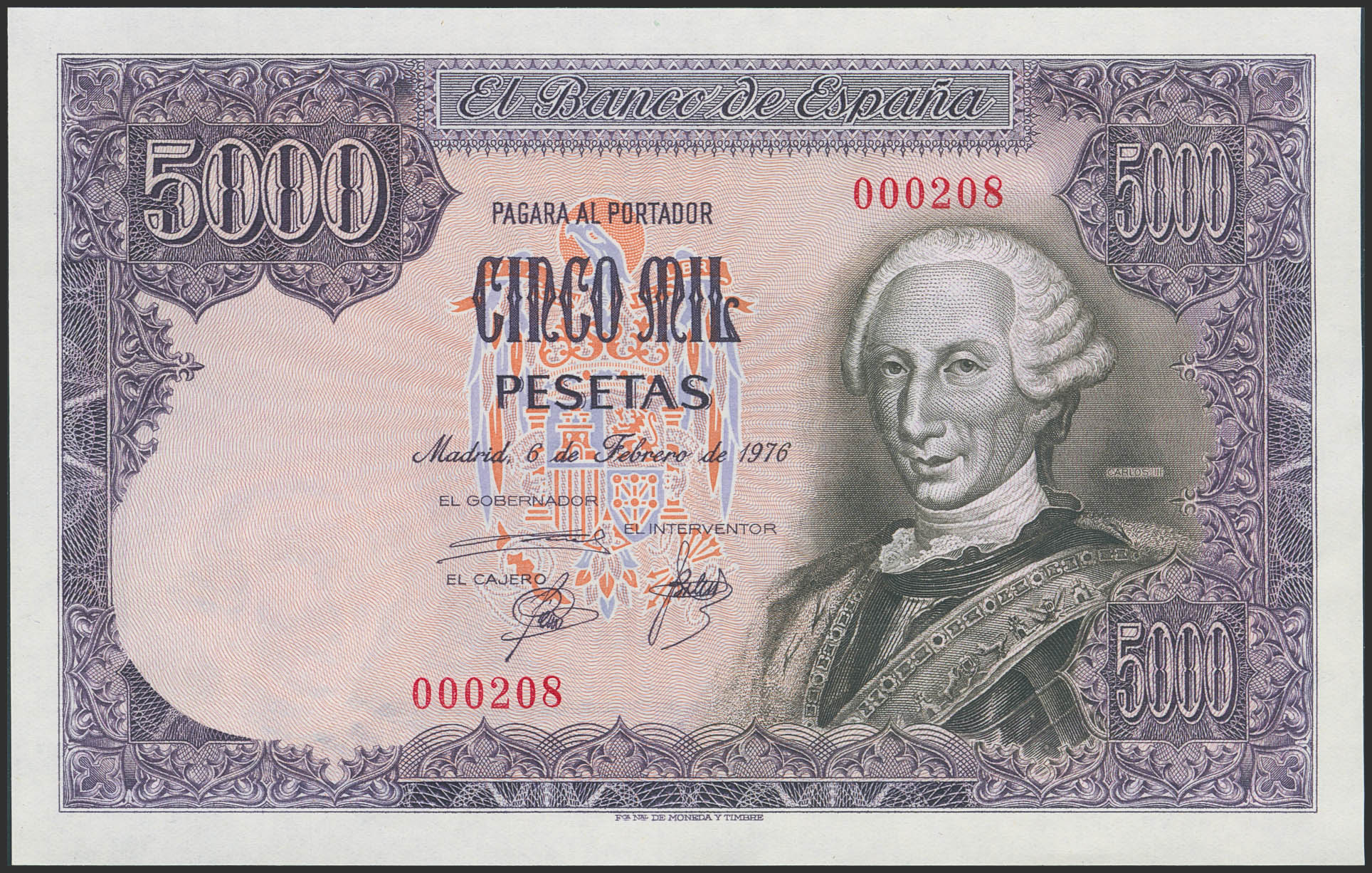 5000 Pesetas. February 6, 1976. No serial number and very low numbering (No. 000208). (Edifil 2023: 475). Rare. Unused.