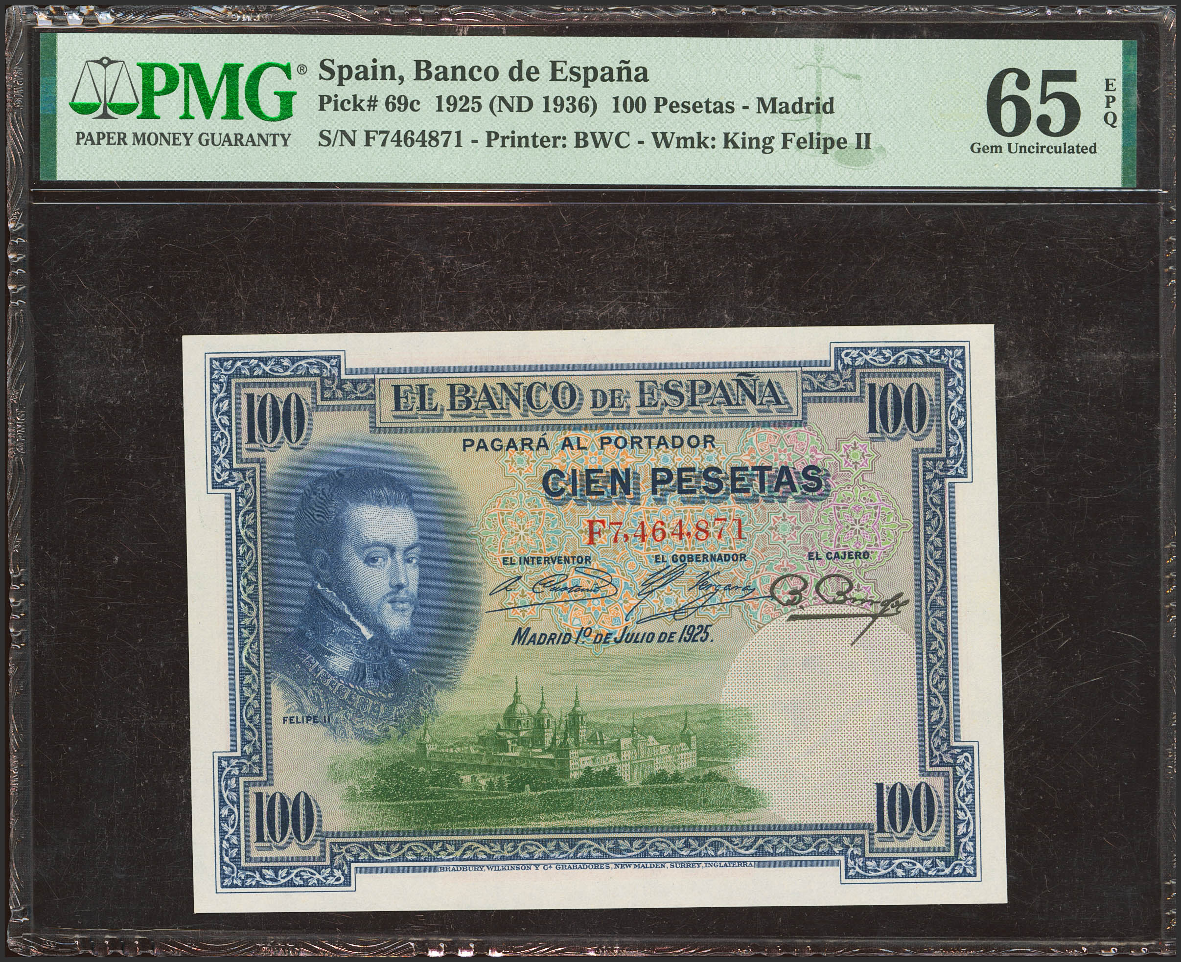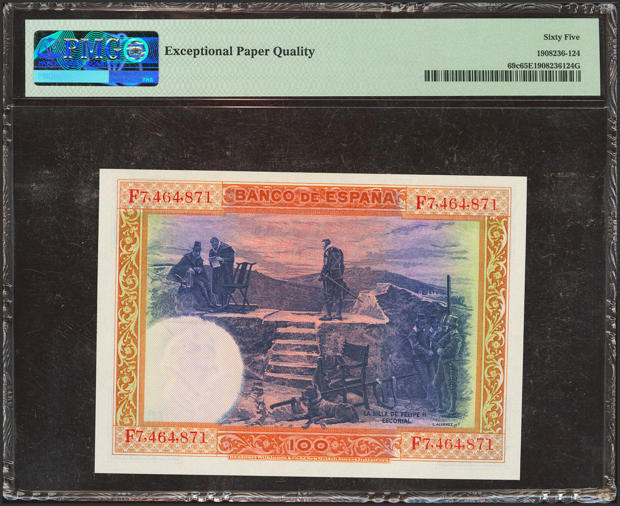 100 Pesetas. June 1, 1925. Series F. (Edifil 2021: 350, Pick: 69c). Original Uncirculated finish. PMG65EPQ encapsulation.