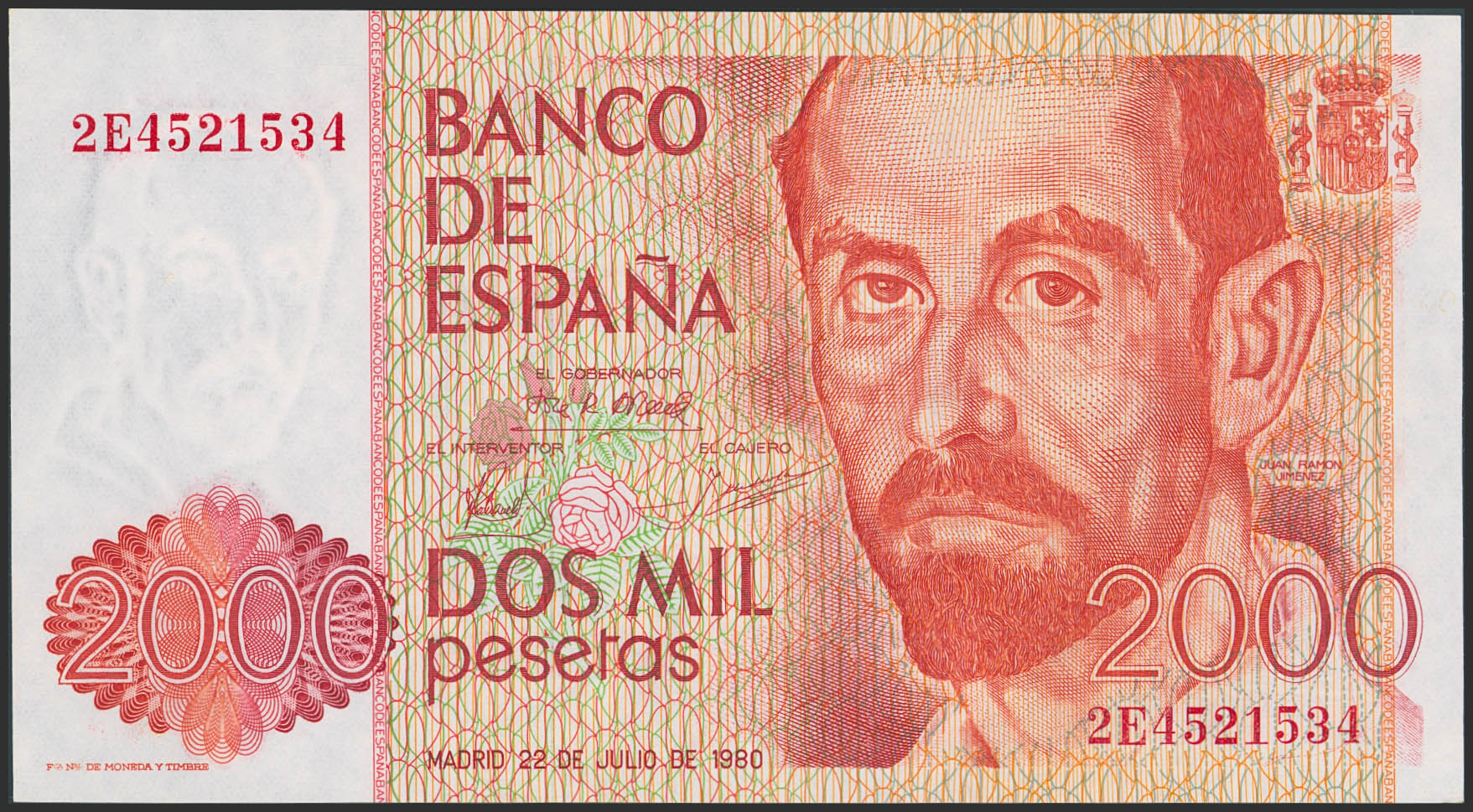 2000 Pesetas. July 22, 1980. Series 2E. (Edifil 2023: 479a). Uncirculated.