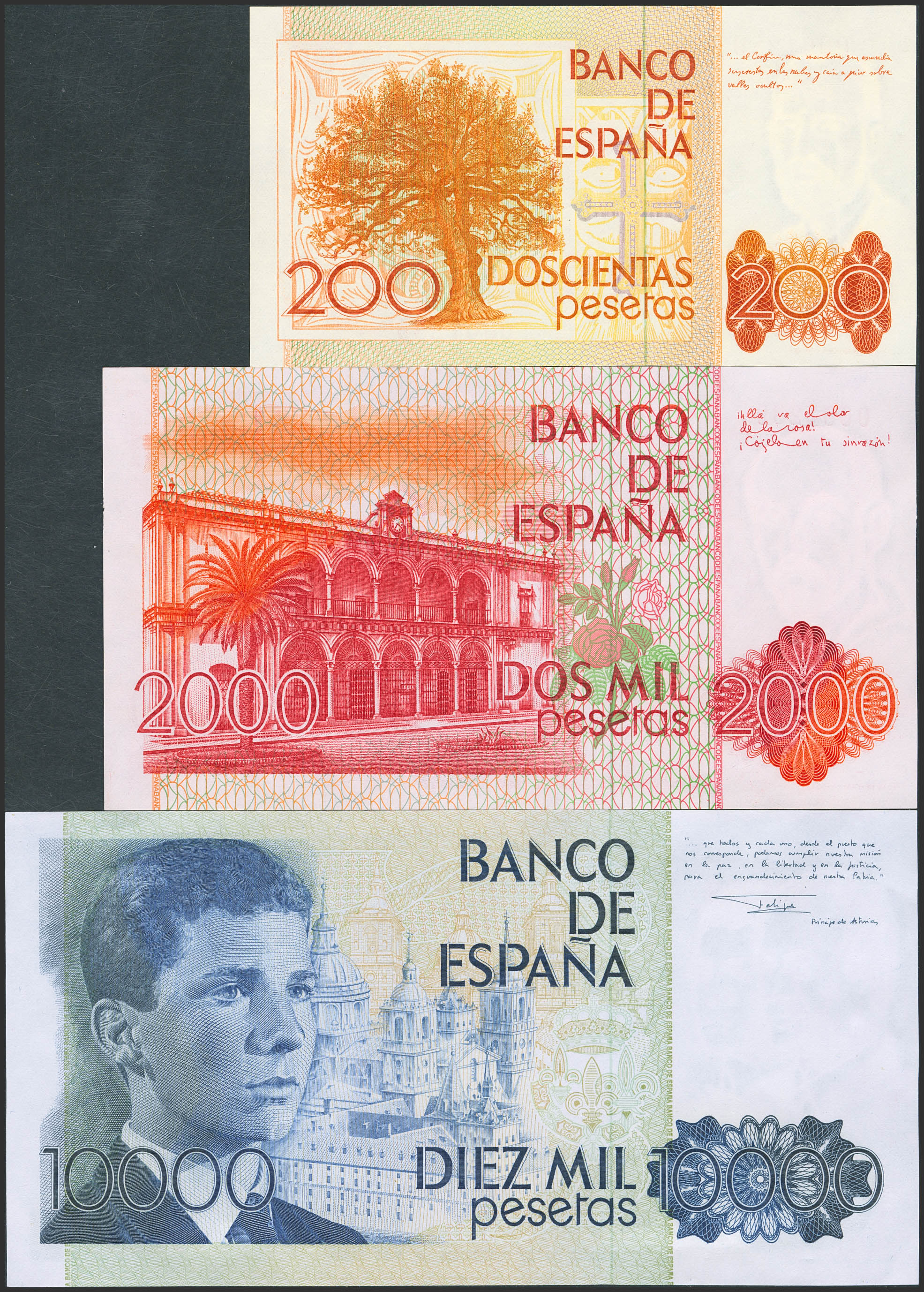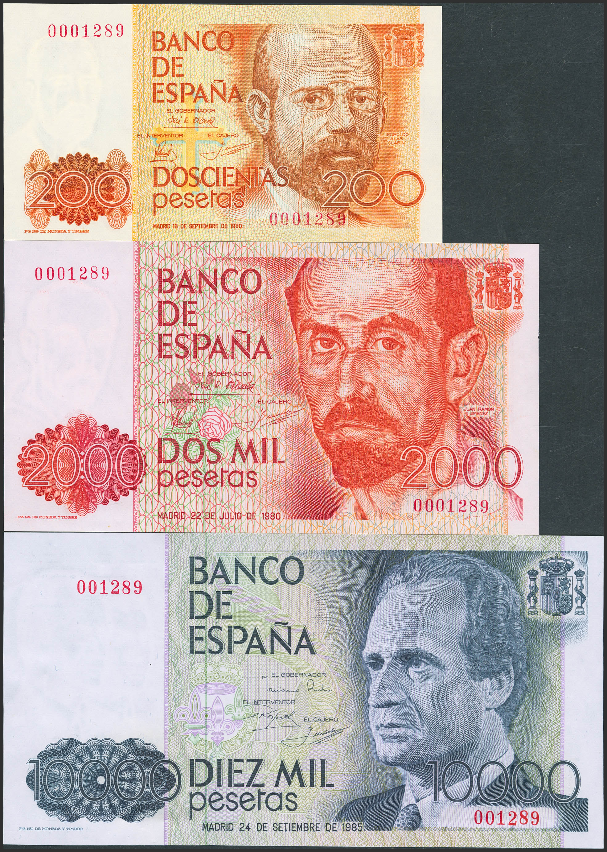 Set of 3 banknotes: 200 Pesetas, 2000 Pesetas, and 10000 Pesetas, all issued between 1979 and 1985, all without a series number and with the same low serial number 0001289. (Edifil 2023: 480, 479, 481). Uncirculated-