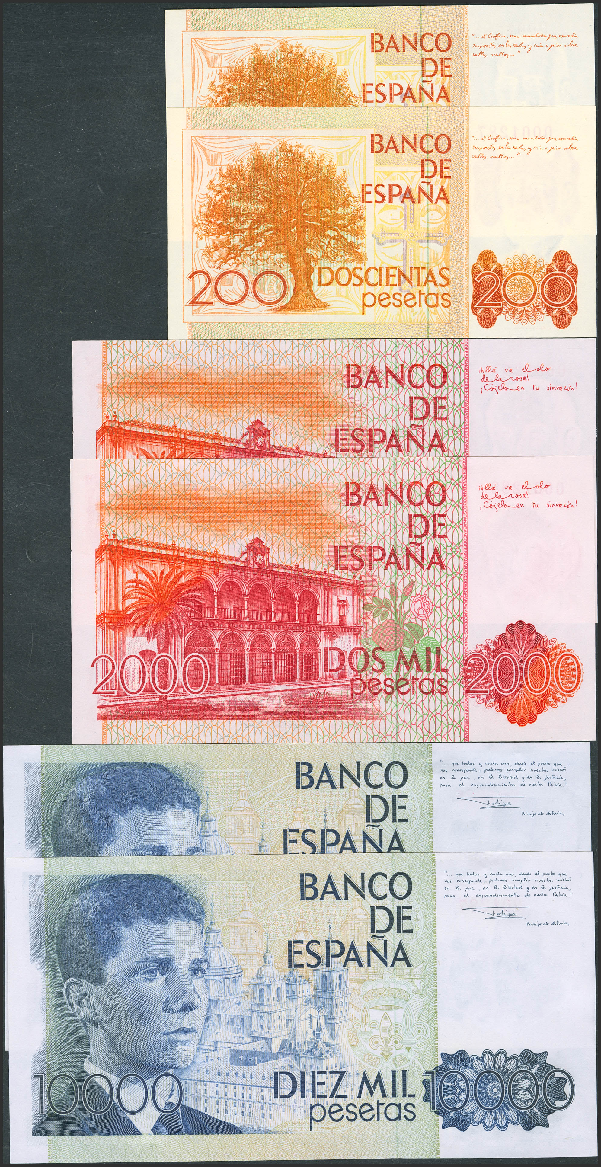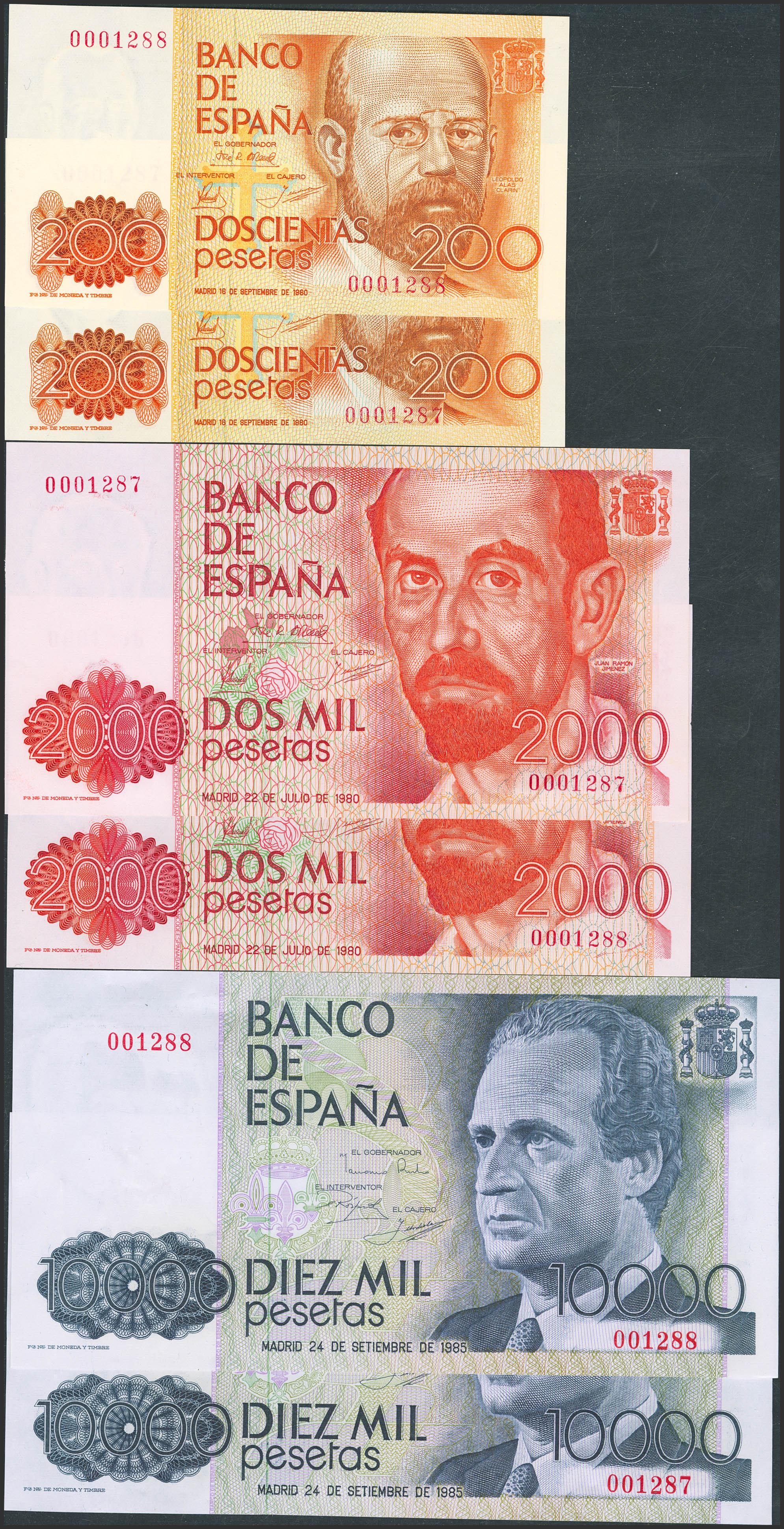 Set of 3 consecutive pairs of 200 Pesetas, 2000 Pesetas and 10000 Pesetas banknotes, all issued between 1979 and 1985, without series and with the same low numbering 0001287 and 0001288. (Edifil 2023: 480, 479, 481). Uncirculated-