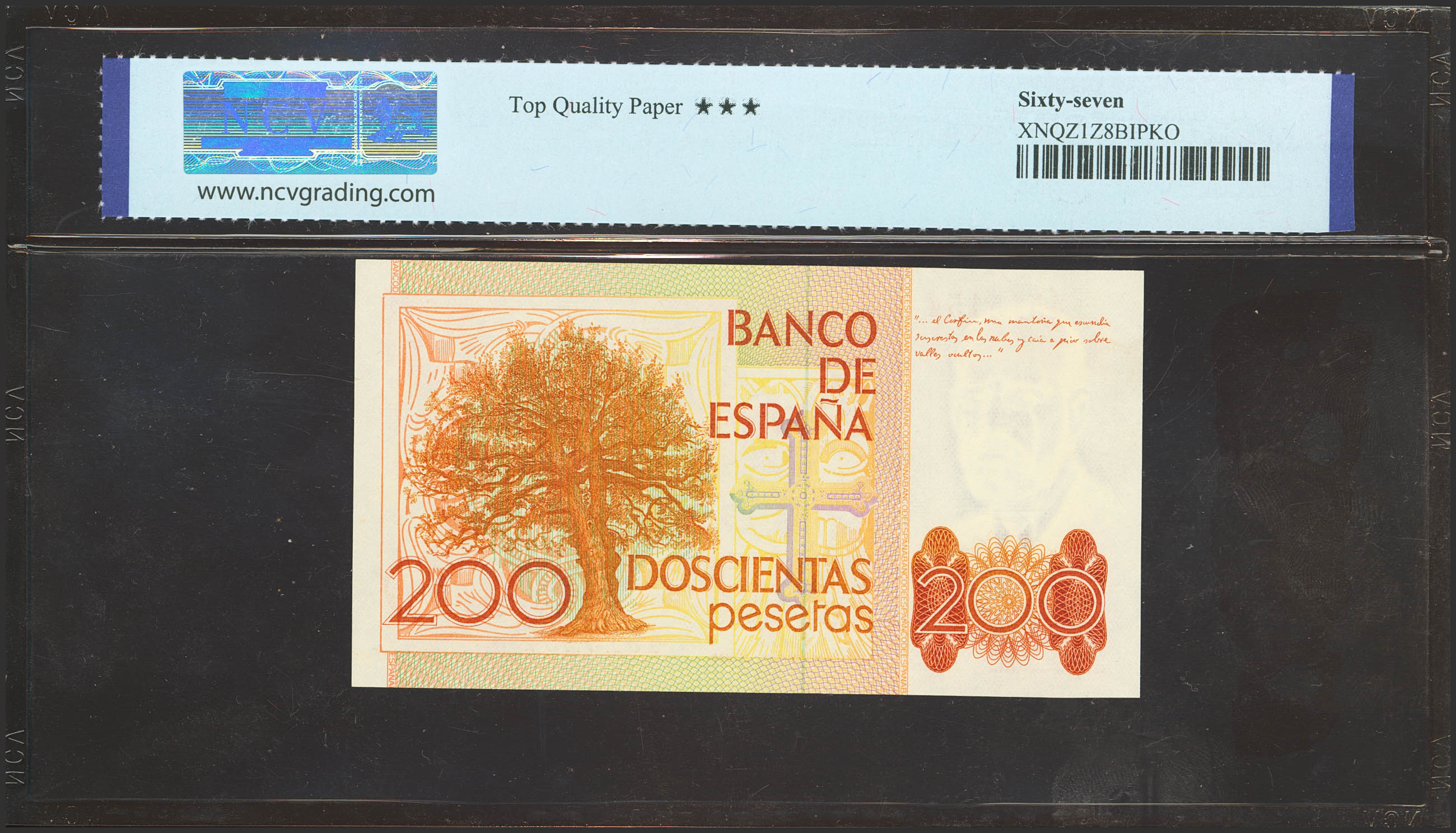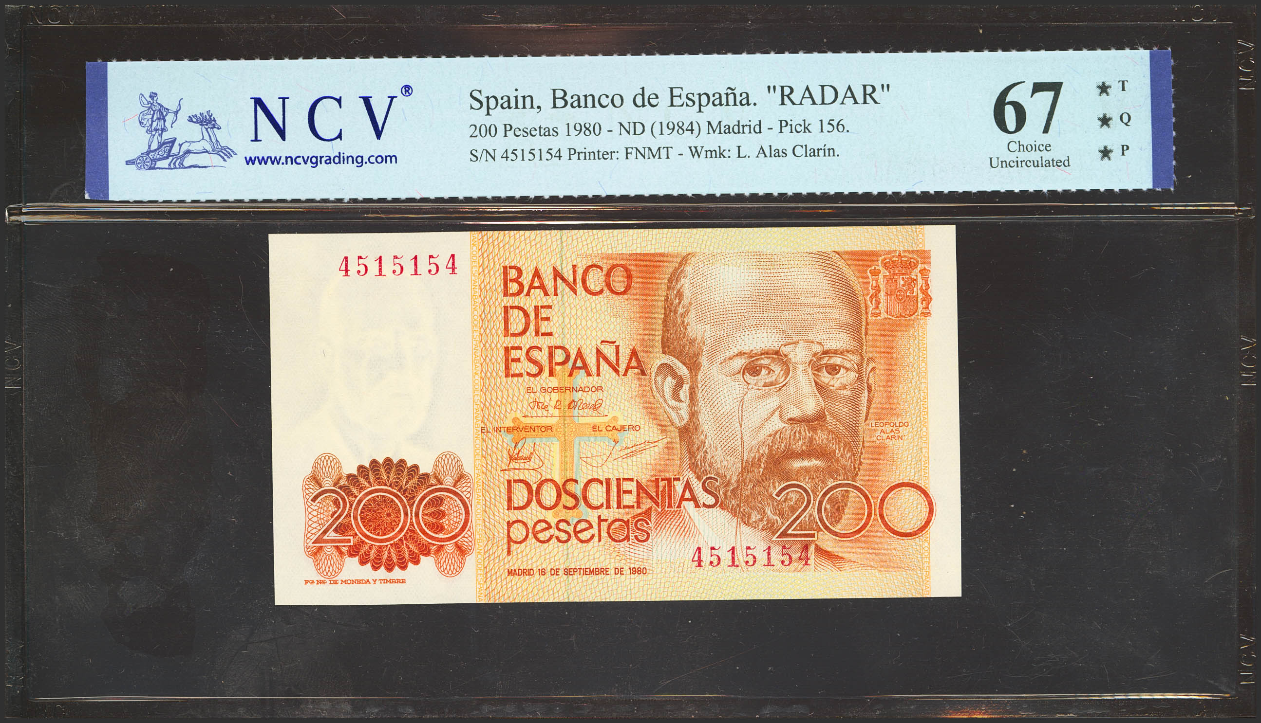 English 200 Pesetas. September 16, 1980. No series and palindrome numbering. (Edifil 2023: 480, Pick: 156). Uncirculated. Encapsulated NCV67TQP.