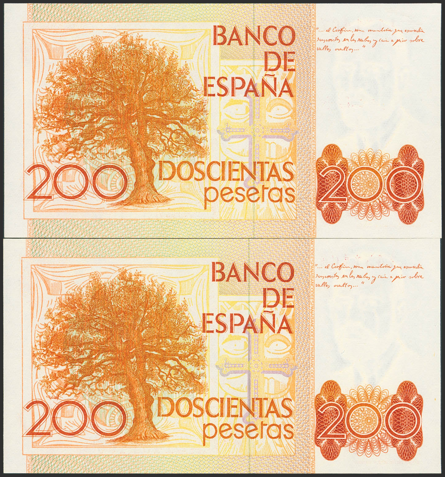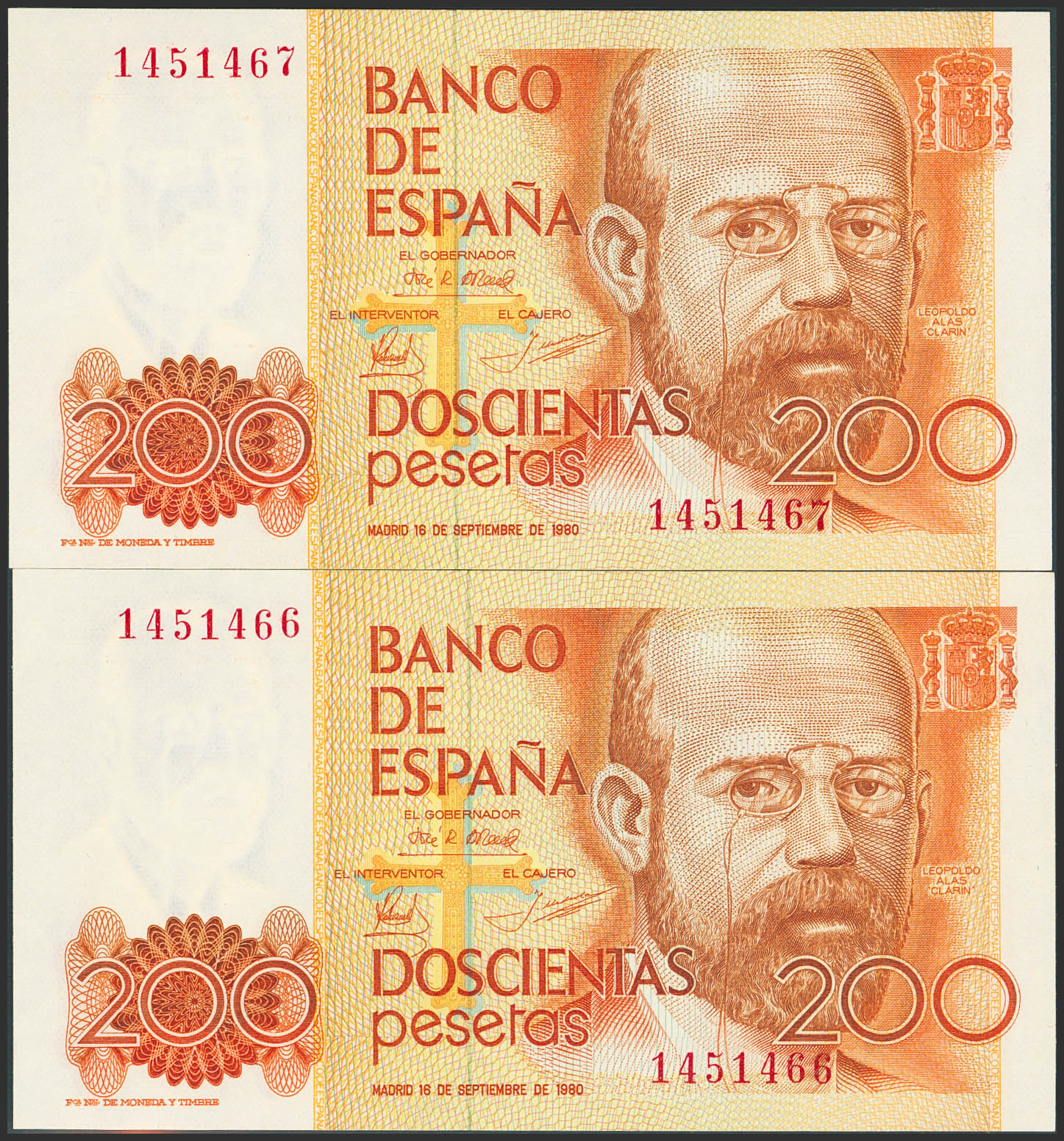 200 Pesetas. September 16, 1980. Corresponding pair. No series. (Edifil 2021: 480). Uncirculated.