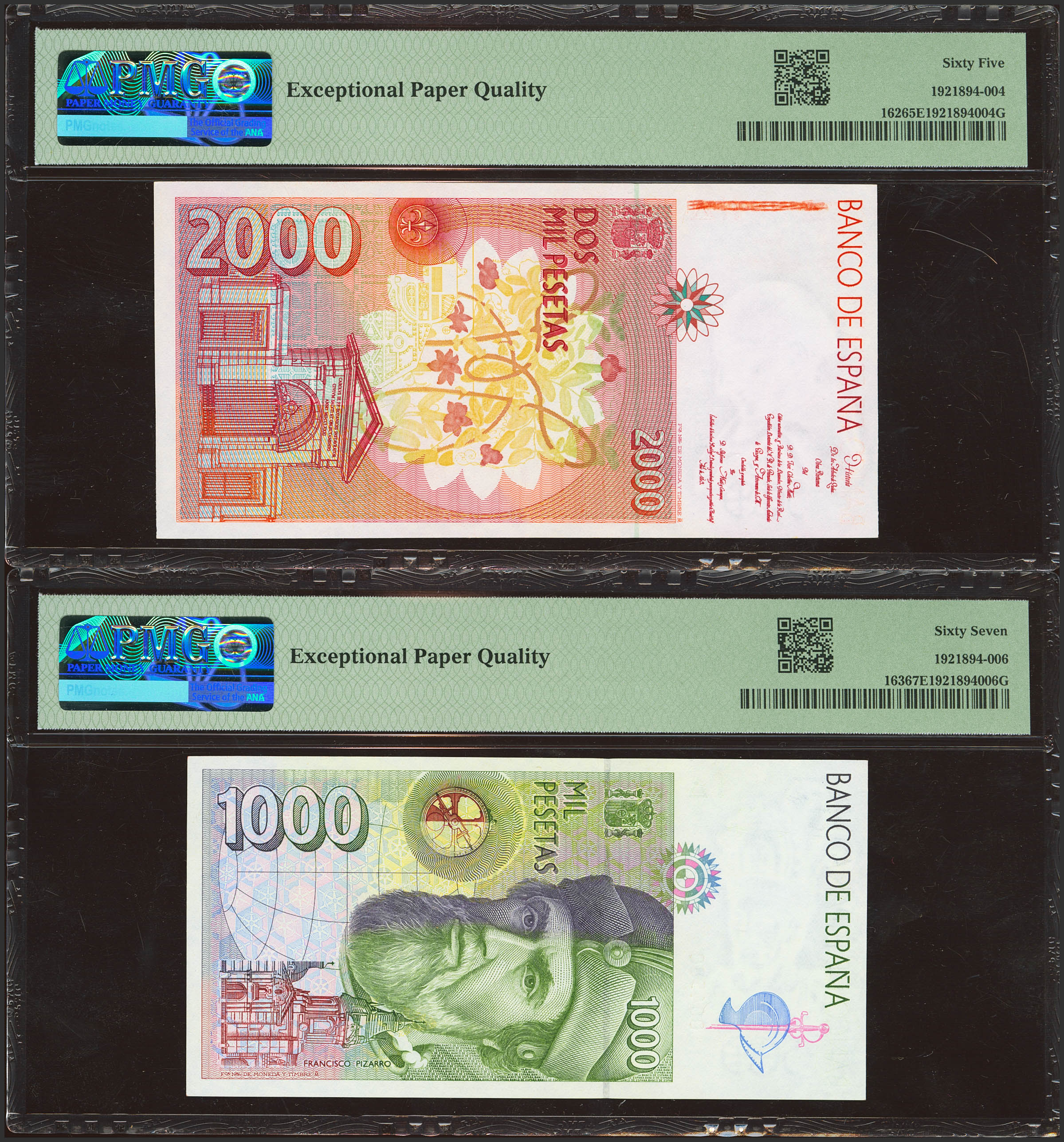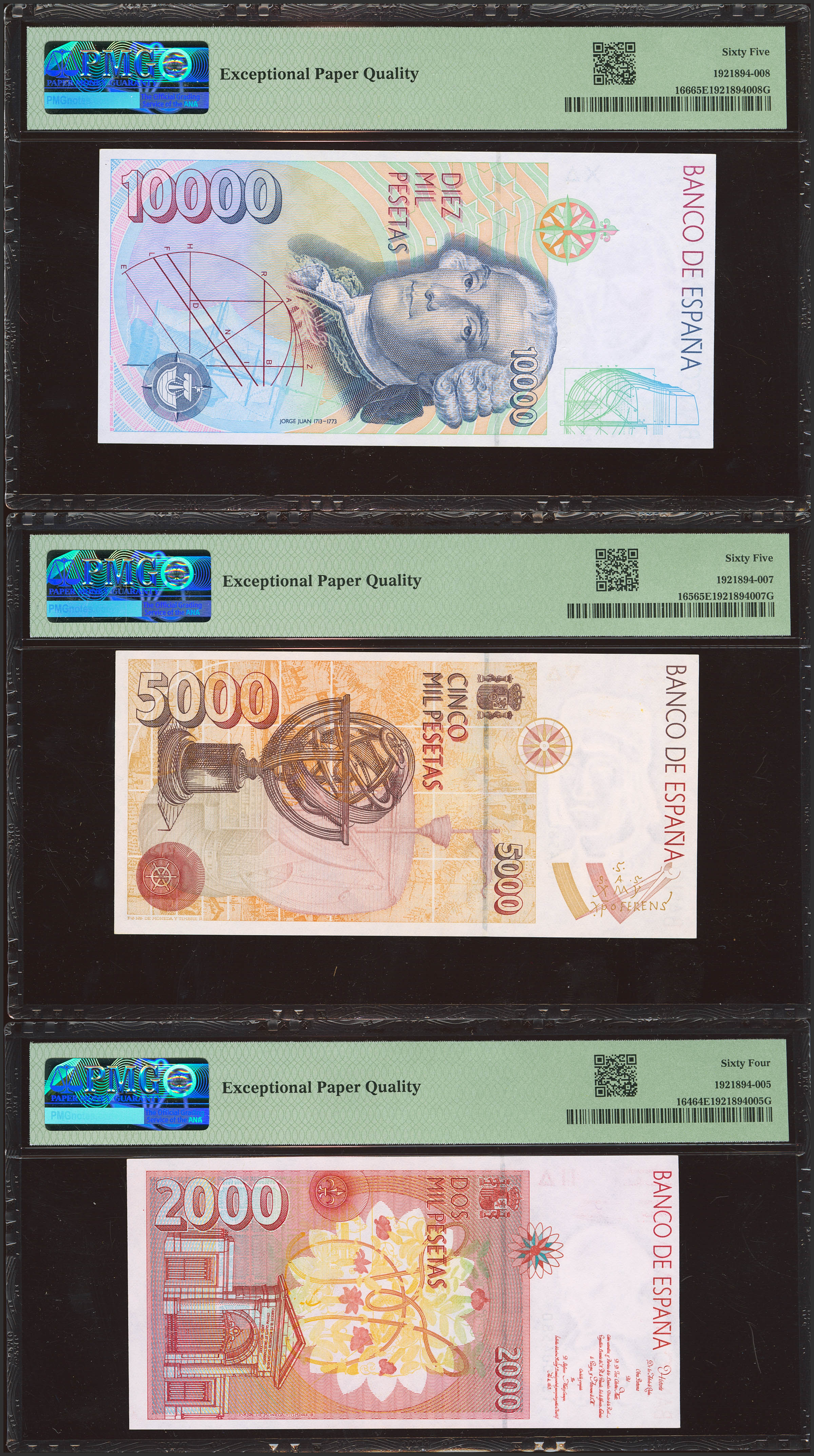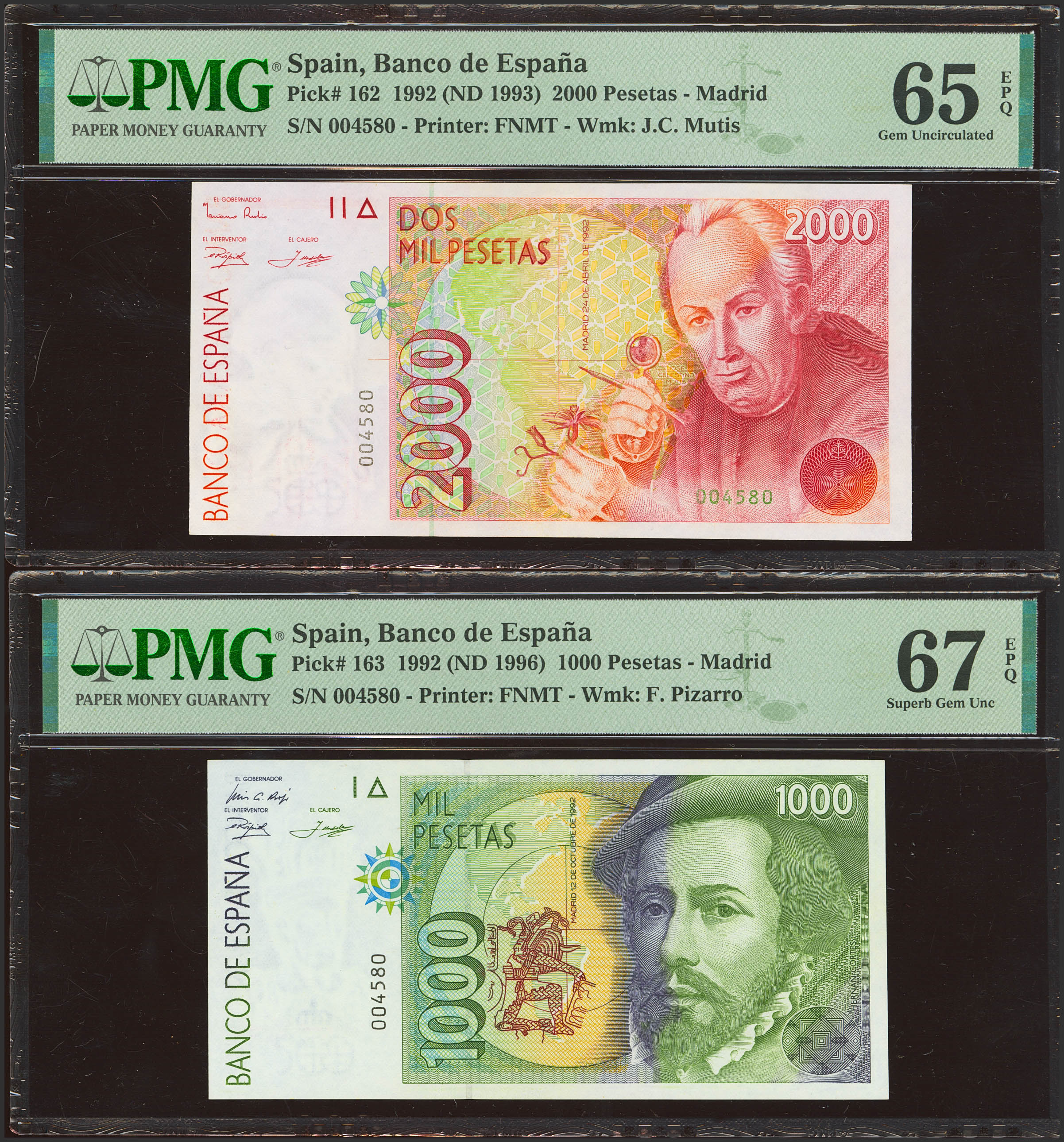 English Series of 1000, 2000 (plus another with the serial number 1S), 5000 and 10000 Peseta banknotes issued in 1992, all with the same serial number Nº004580. (Edifil 2021: 482/85, 482A). Rare set. Encapsulated PMG67EPQ, 65EPQ, 64EPQ, 65EPQ, 65EPQ.