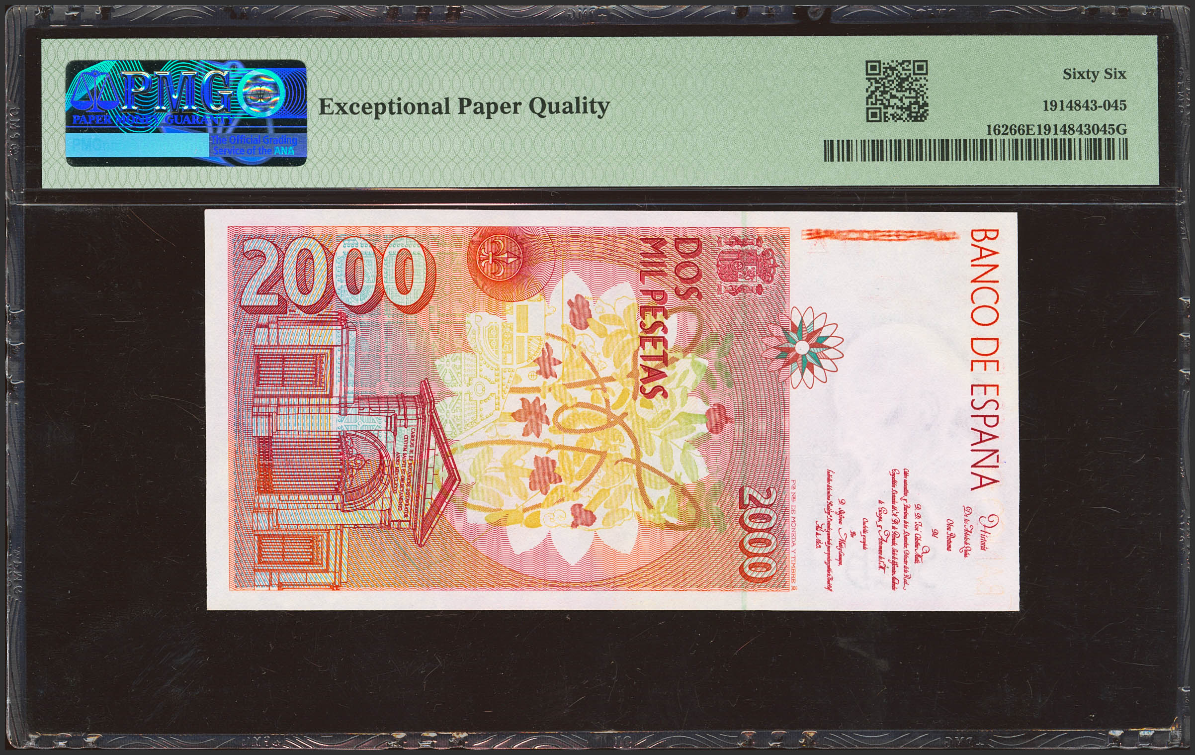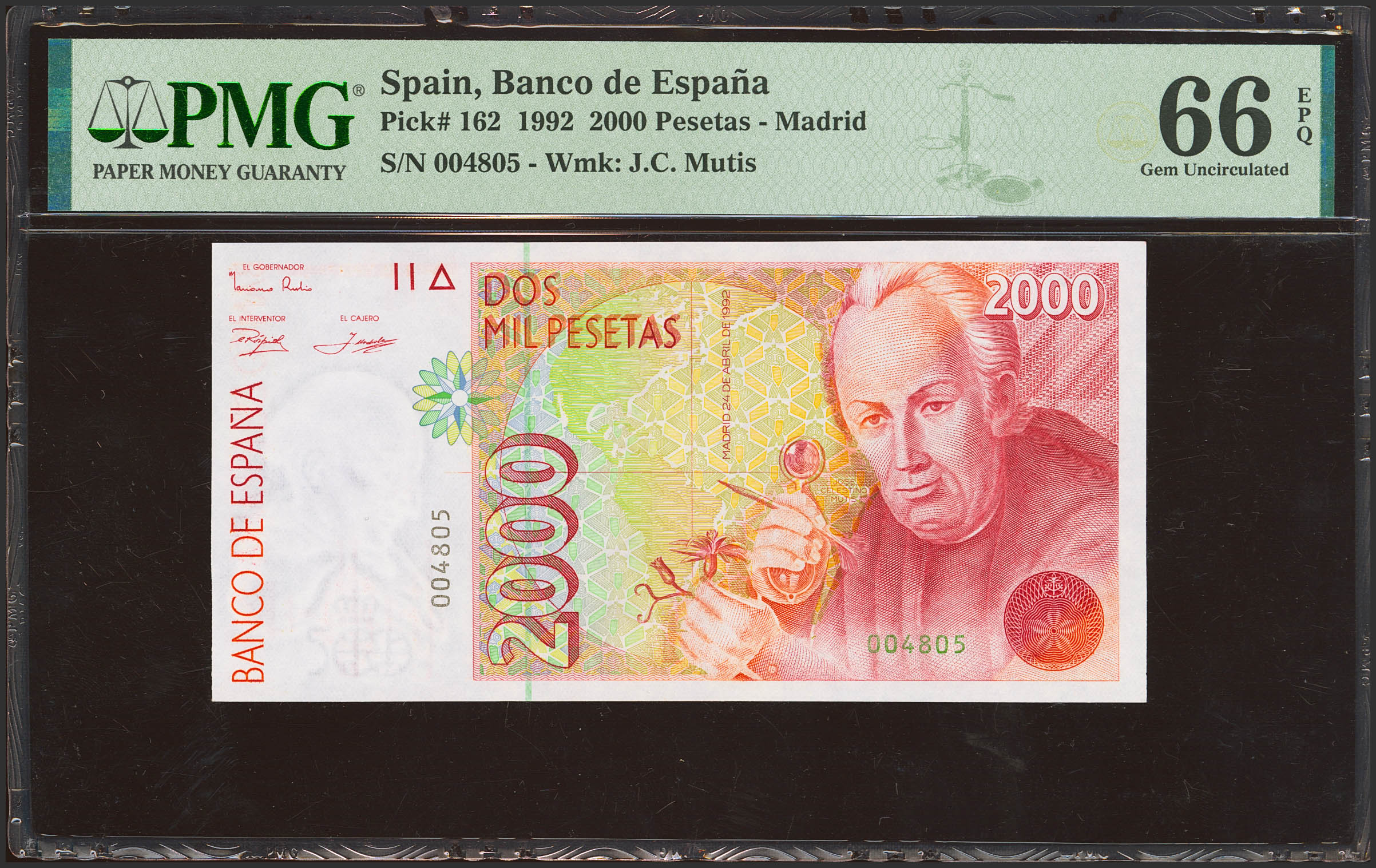 2000 Pesetas. April 24, 1992. No serial number and very low numbering. (Edifil 2023: 482, Pick: 162). Uncirculated. PMG66EPQ encapsulation.