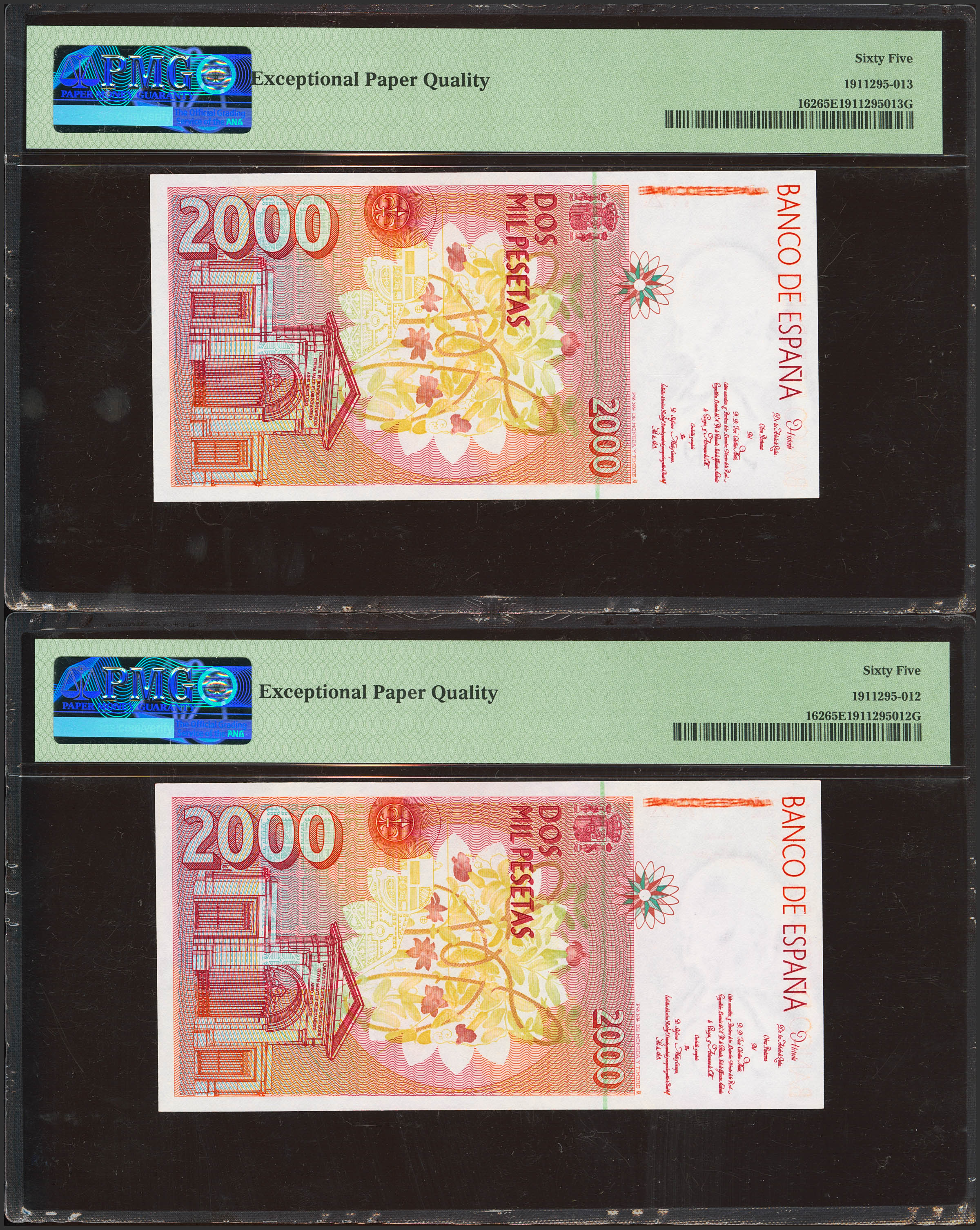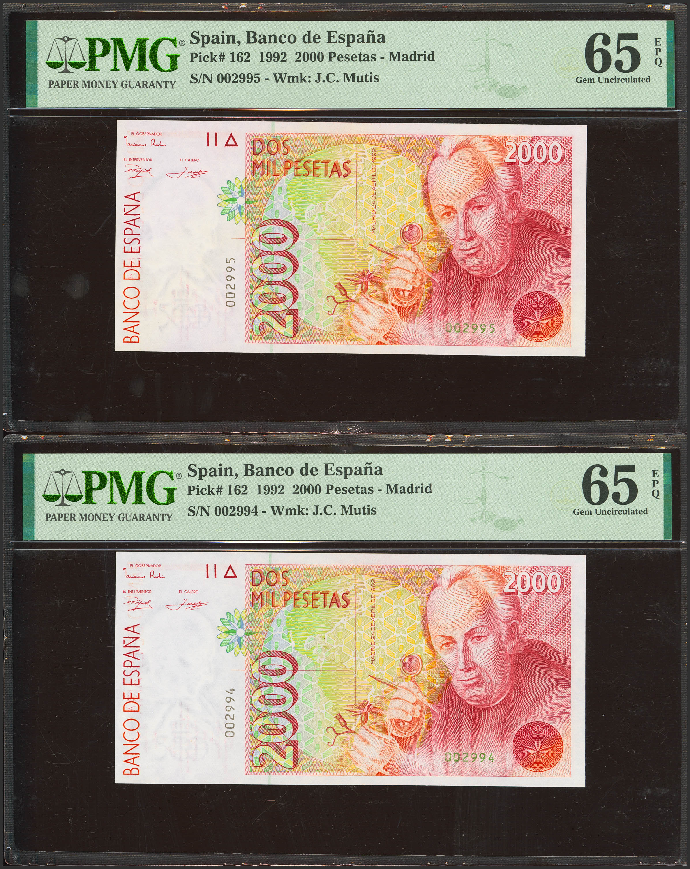 2000 Pesetas. April 24, 1992. Correlative pair. No serial number and very low numbering. (Edifil 2023: 482, Pick: 162). Uncirculated. Both encapsulated in PMG65EPQ.