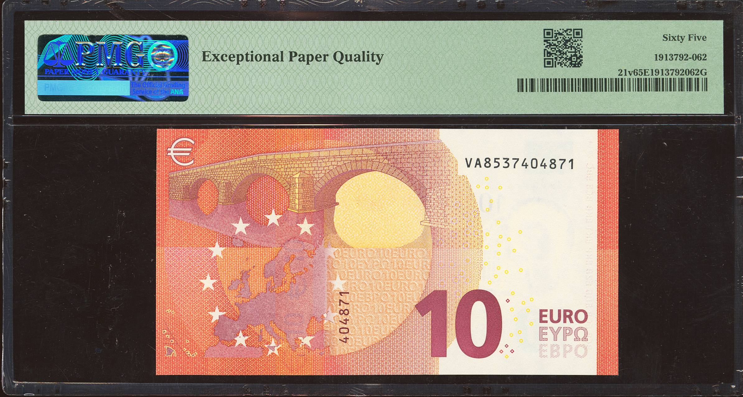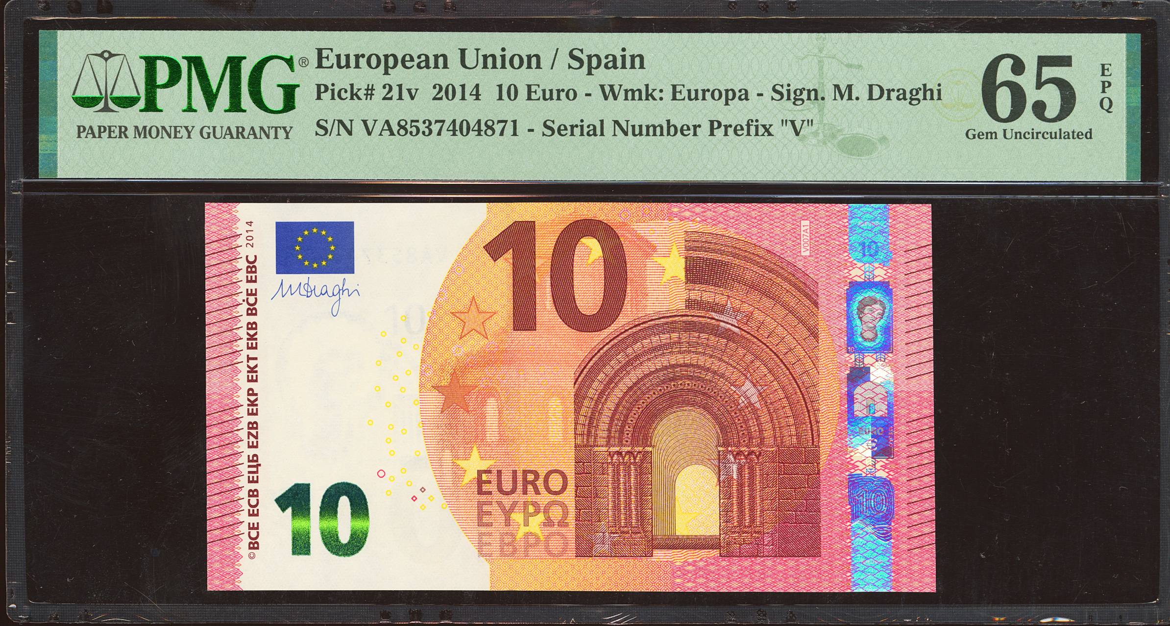 10 Euros. September 23, 2014. Signed by Draghi. Series VA (Spain). (Edifil 2023: 494, Pick: 21v). Uncirculated. PMG65EPQ encapsulation.