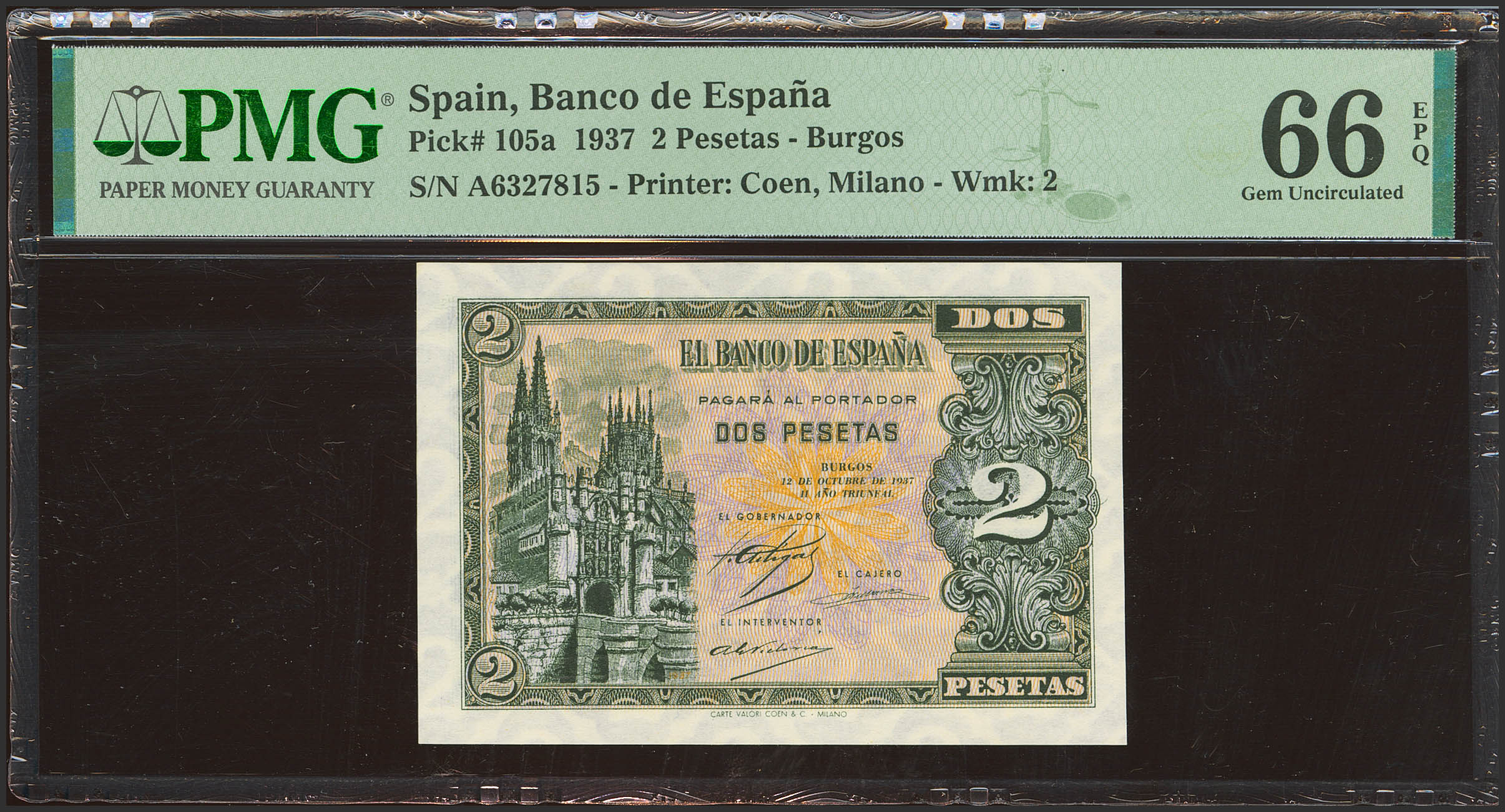 2 Pesetas. October 12, 1937. Series A. (Edifil 2023: 426, Pick: 105). Rare in this exceptional condition, original finish. Uncirculated. Encapsulated PMG66EPQ.