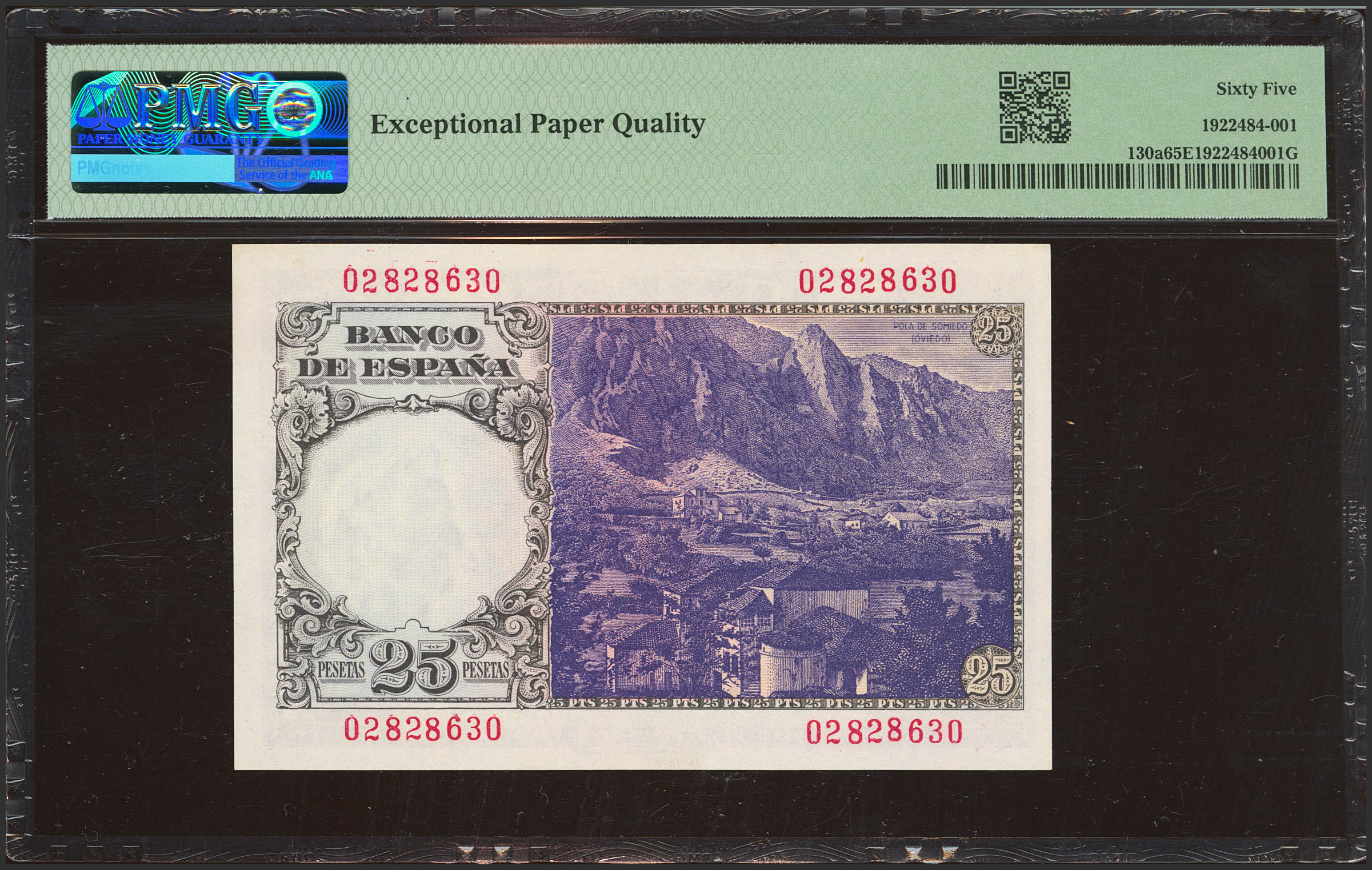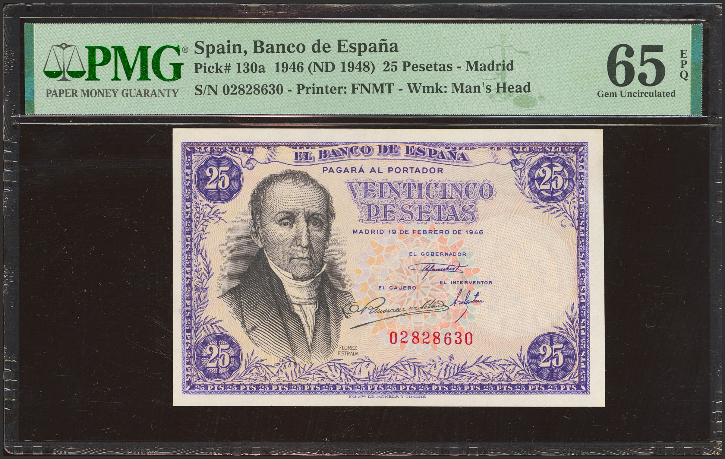 25 Pesetas. February 19, 1946. No serial number. (Edifil 2023: 450, Pick: 130a). Extremely rare in this condition, original finish. Uncirculated. PMG65EPQ capsule.