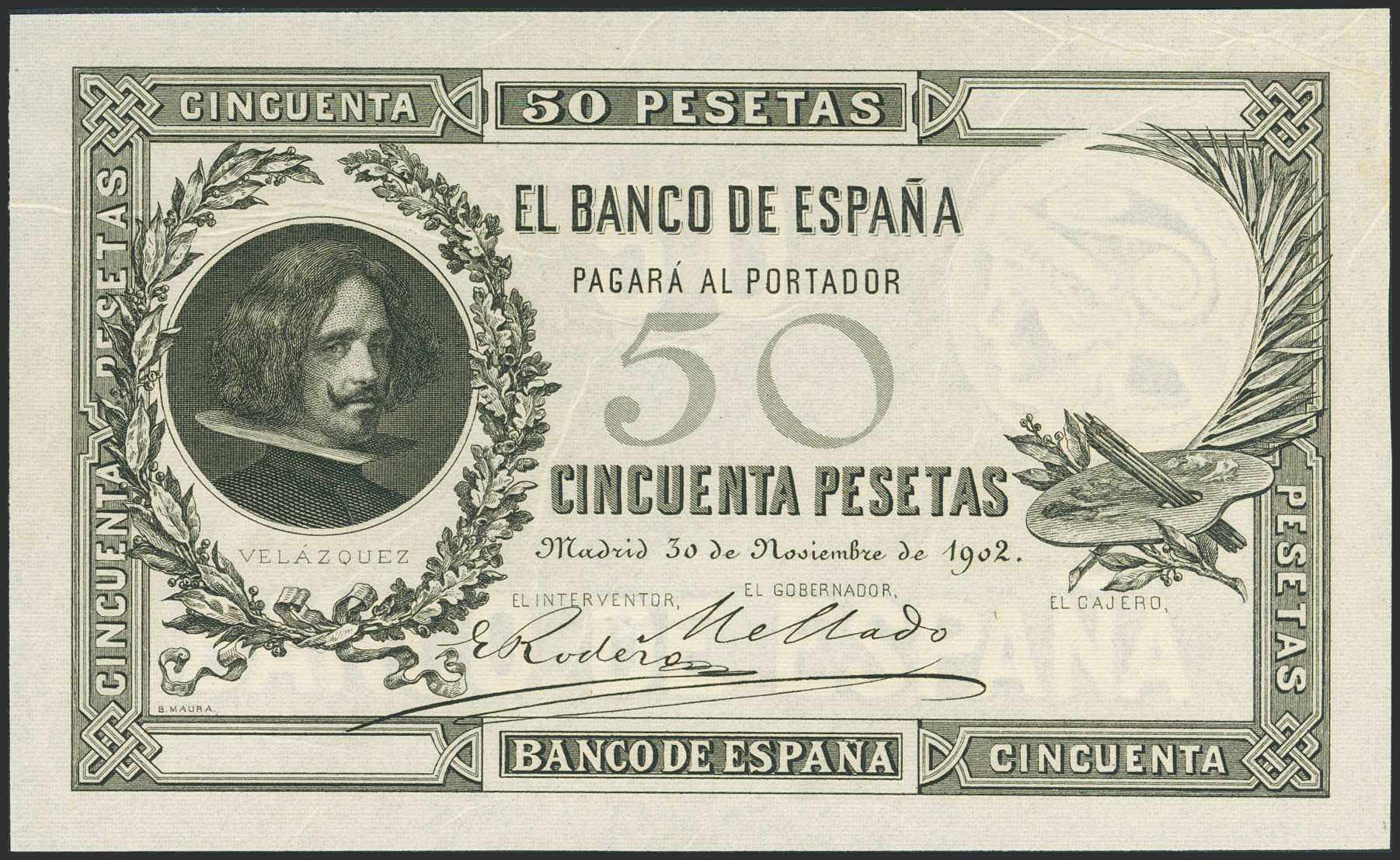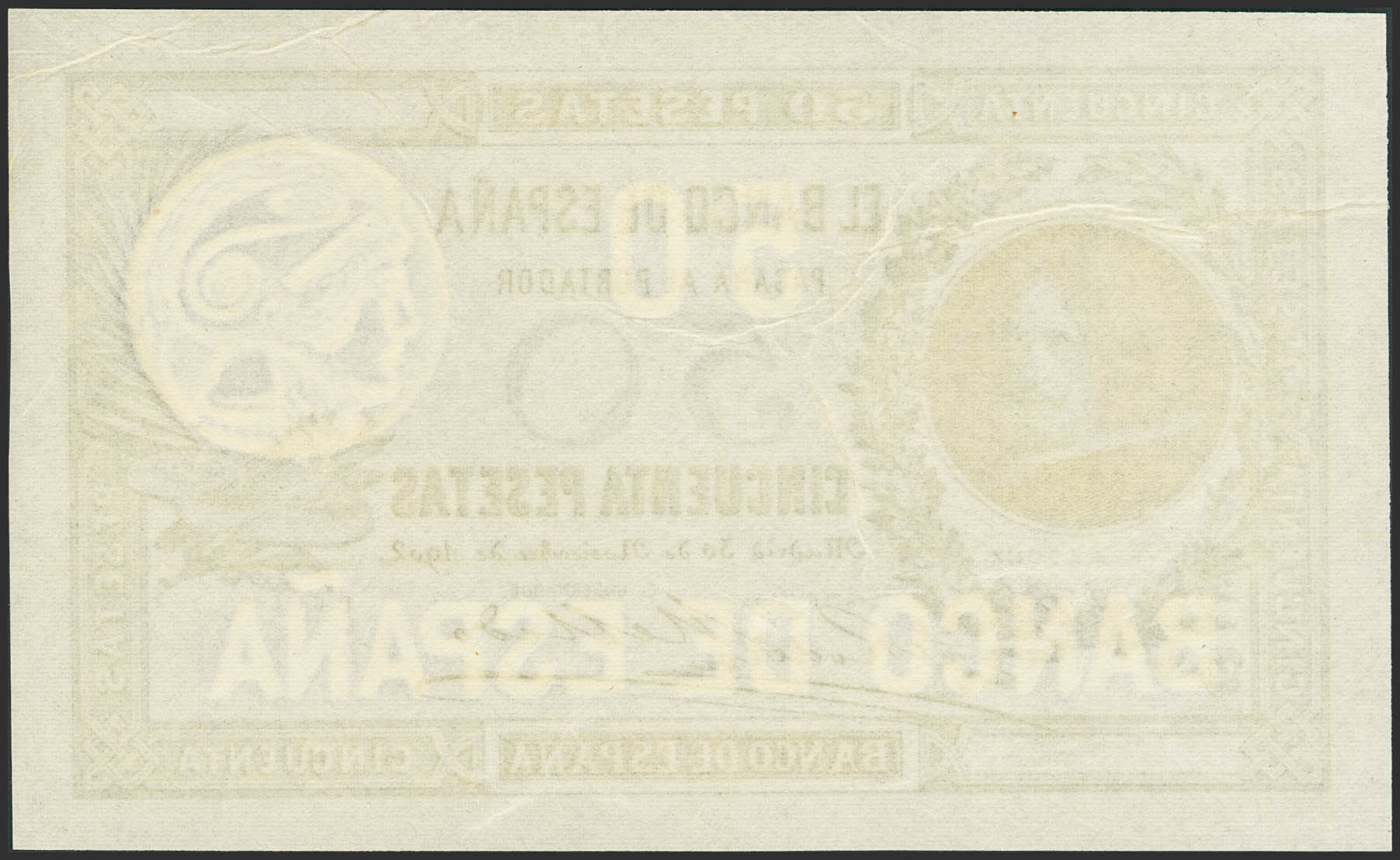 50 Pesetas. November 30, 1902. Proof on the front. (Edifil 2023: 309P). Very light original paper gussets. Uncirculated--.