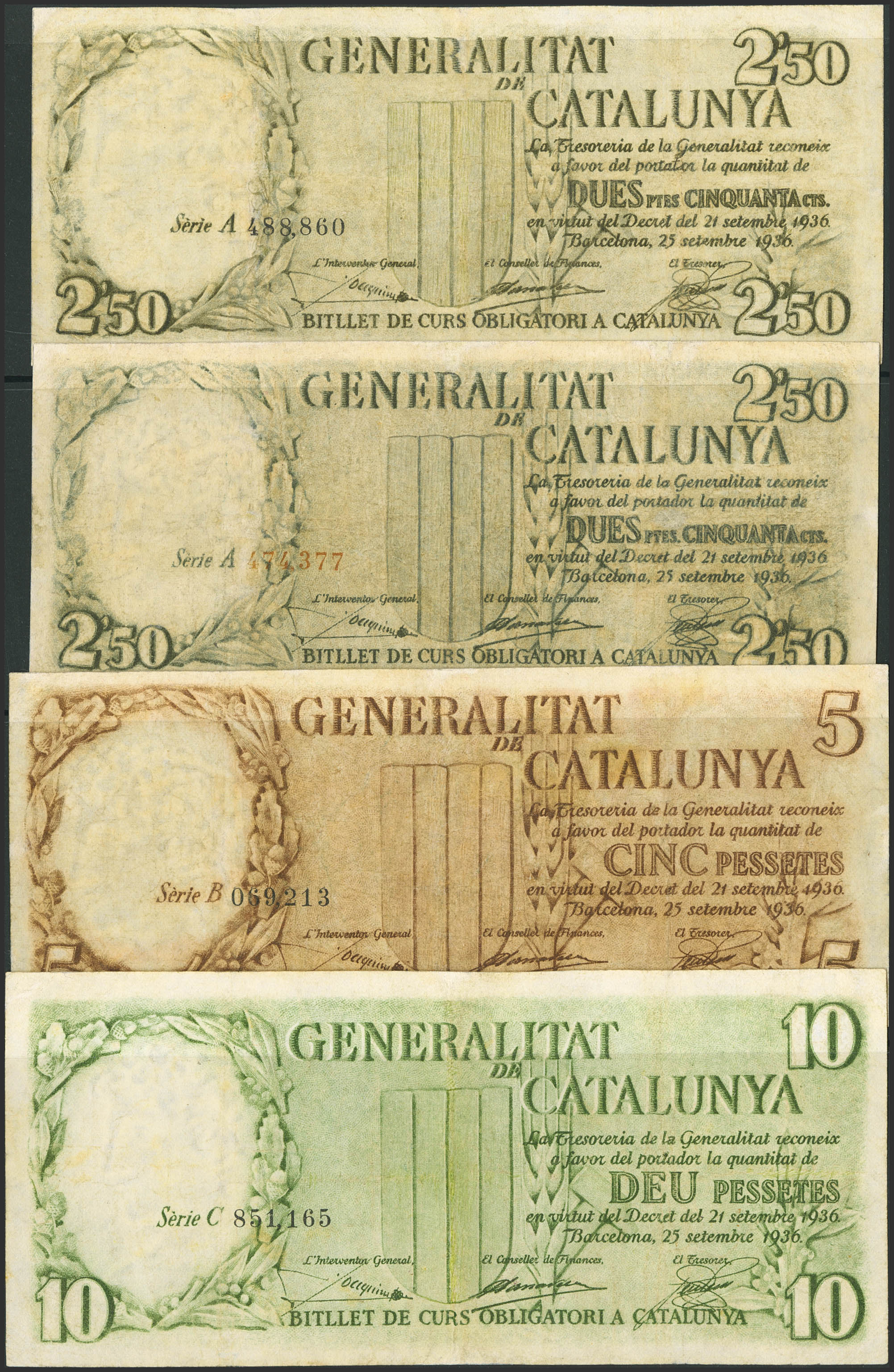 Complete set of four banknotes issued by the Generalitat de Catalunya (Catalan government), including the 2.50 Pesetas (including red and black numbering), 5 Pesetas, and 10 Pesetas, issued on September 25, 1936, in series A (red and black numbering), B, and C, respectively. (Edifil 2023: 372/74, 372a). Repaired. VF+.