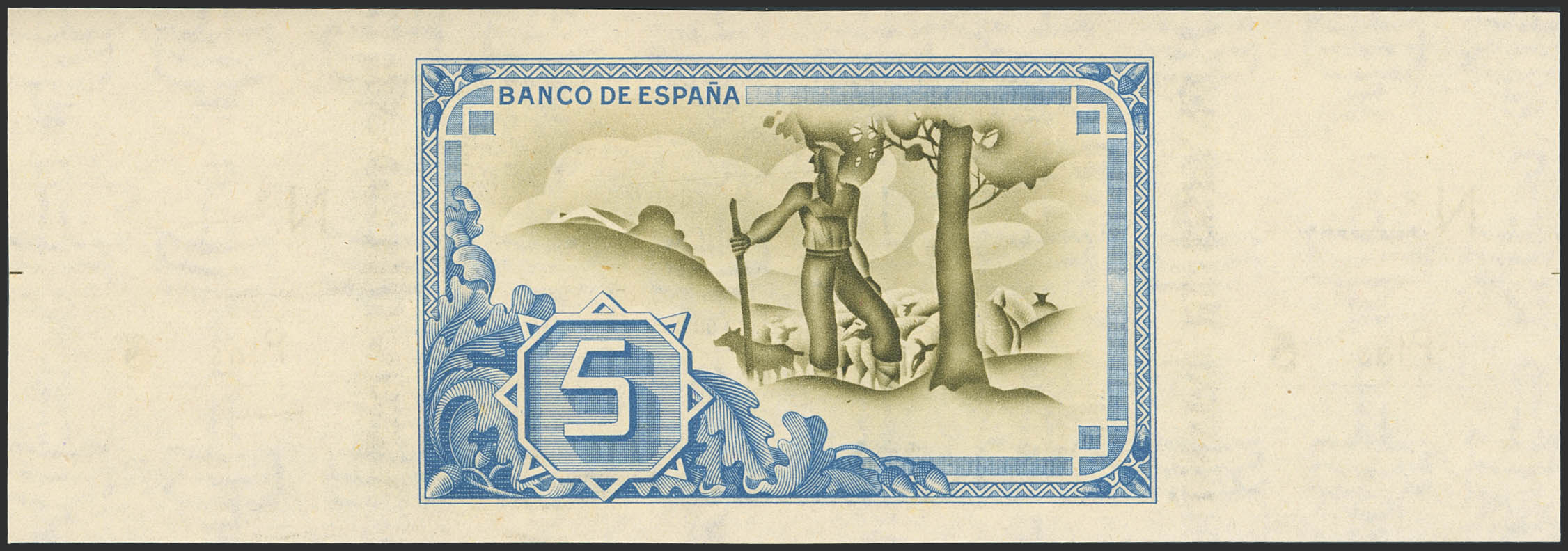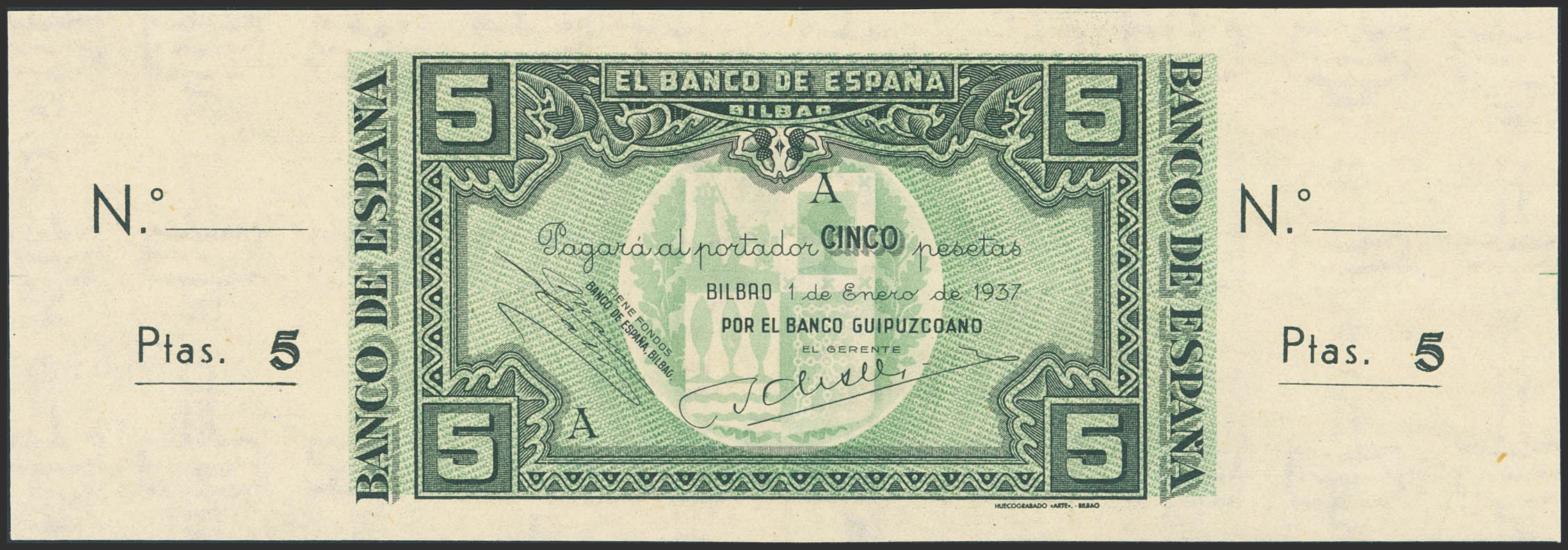 5 Pesetas. January 1, 1937. Bilbao branch, prefix Banco Guipuzcoano. Series A and unnumbered, with both matrices. (Edifil 2023: 386c). Original size. Uncirculated.