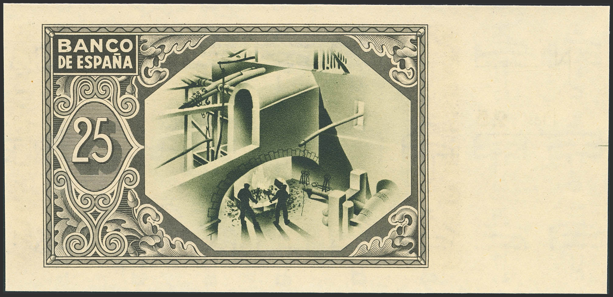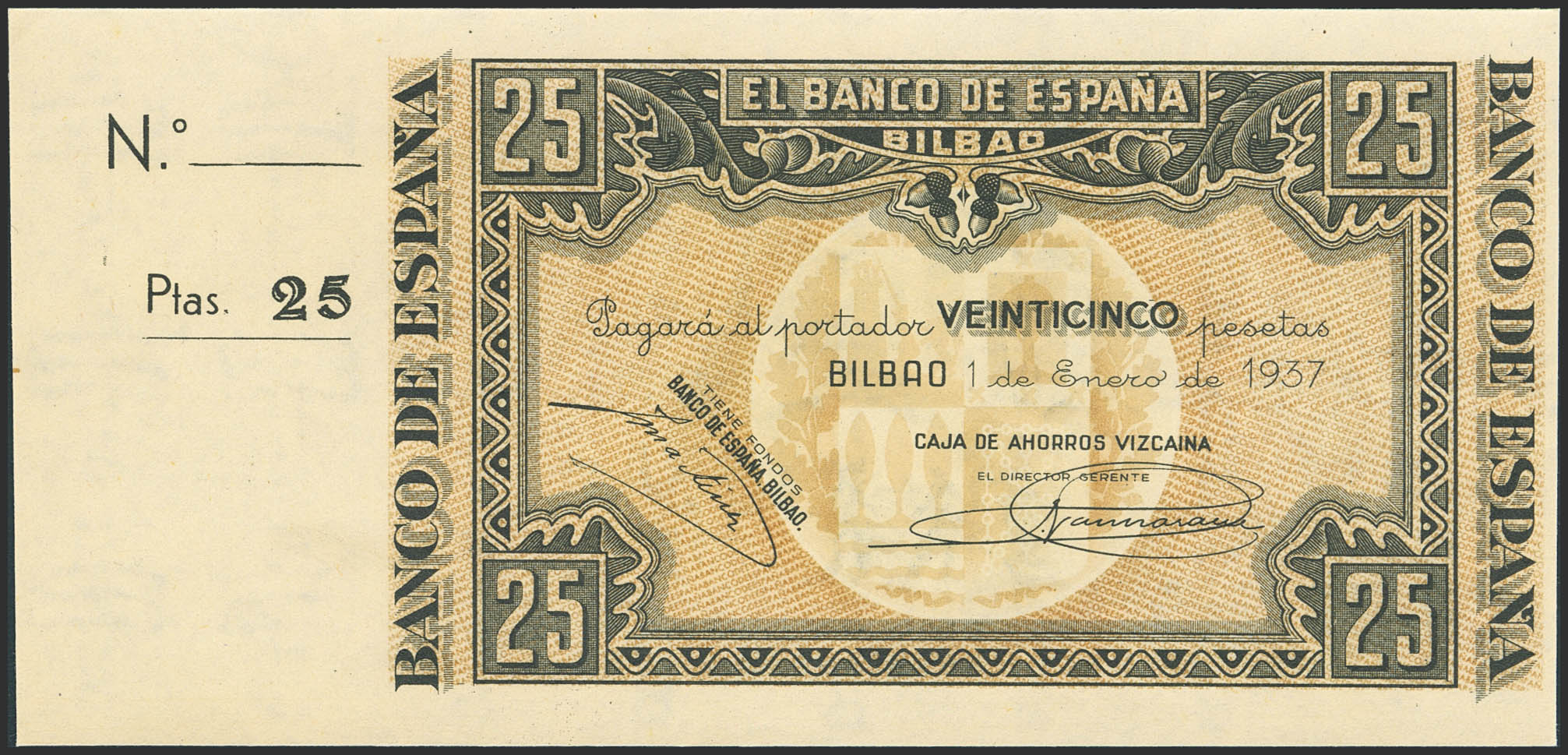 25 Pesetas. January 1, 1937. Bilbao branch, prefix: Caja de Ahorros Vizcaína. No series or numbering, die on the left. (Edifil 2023: 388a). Original size. Uncirculated-.
