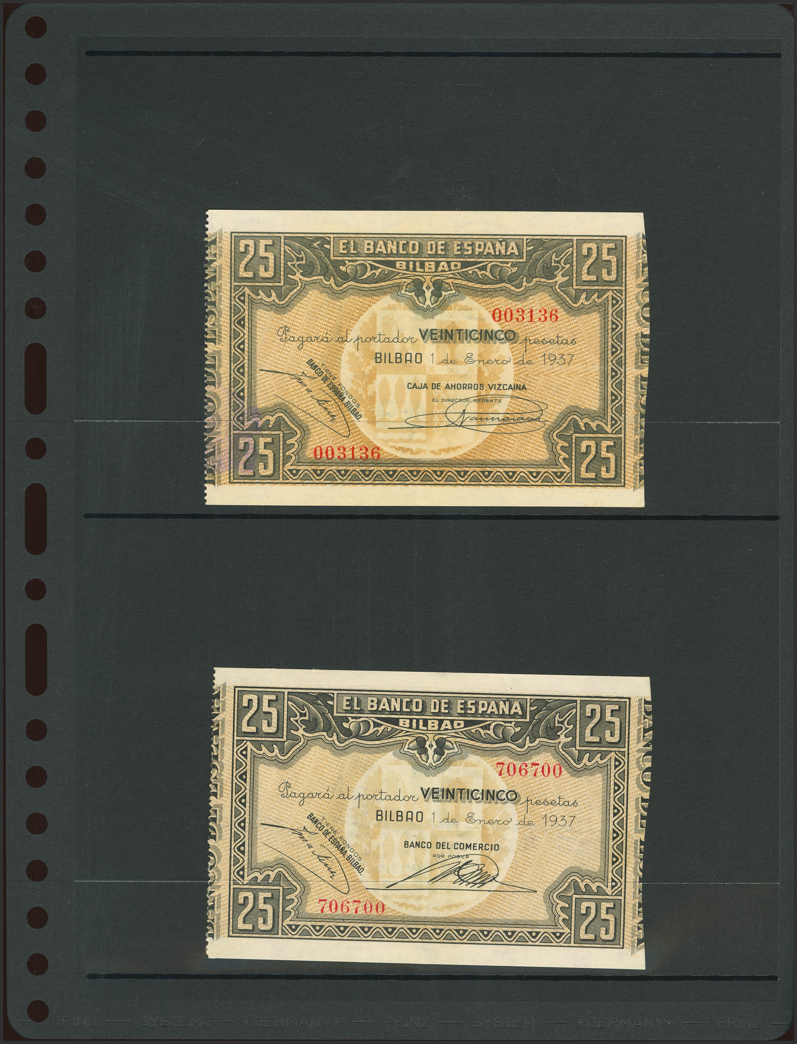 Set of four 25-peseta banknotes issued by the Bank of Spain at its Bilbao branch on January 1, 1937, including the four known signatures, without series, with numbering, and without dies. (Edifil 2023: 388a/f). E1/E2+.