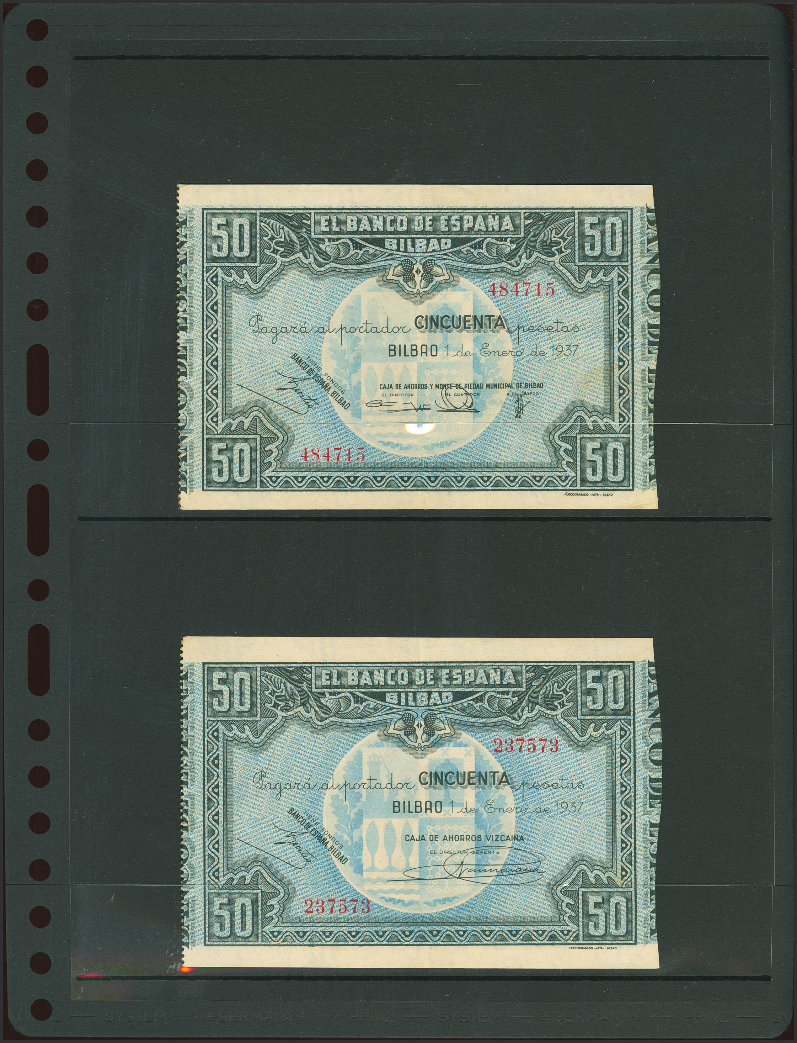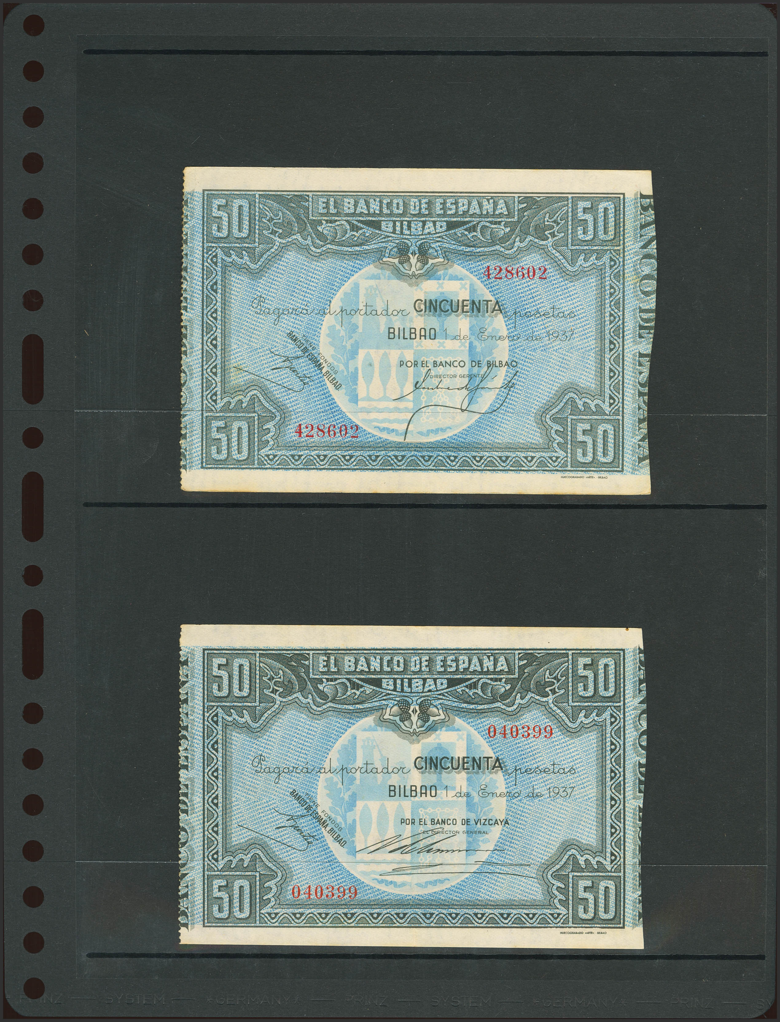 English Set of four 50-peseta banknotes issued by the Bank of Spain at its Bilbao branch on January 1, 1937, including the four known signatures, without series, with numbering, and without dies. (Edifil 2023: 389a/f). E1/E2+.