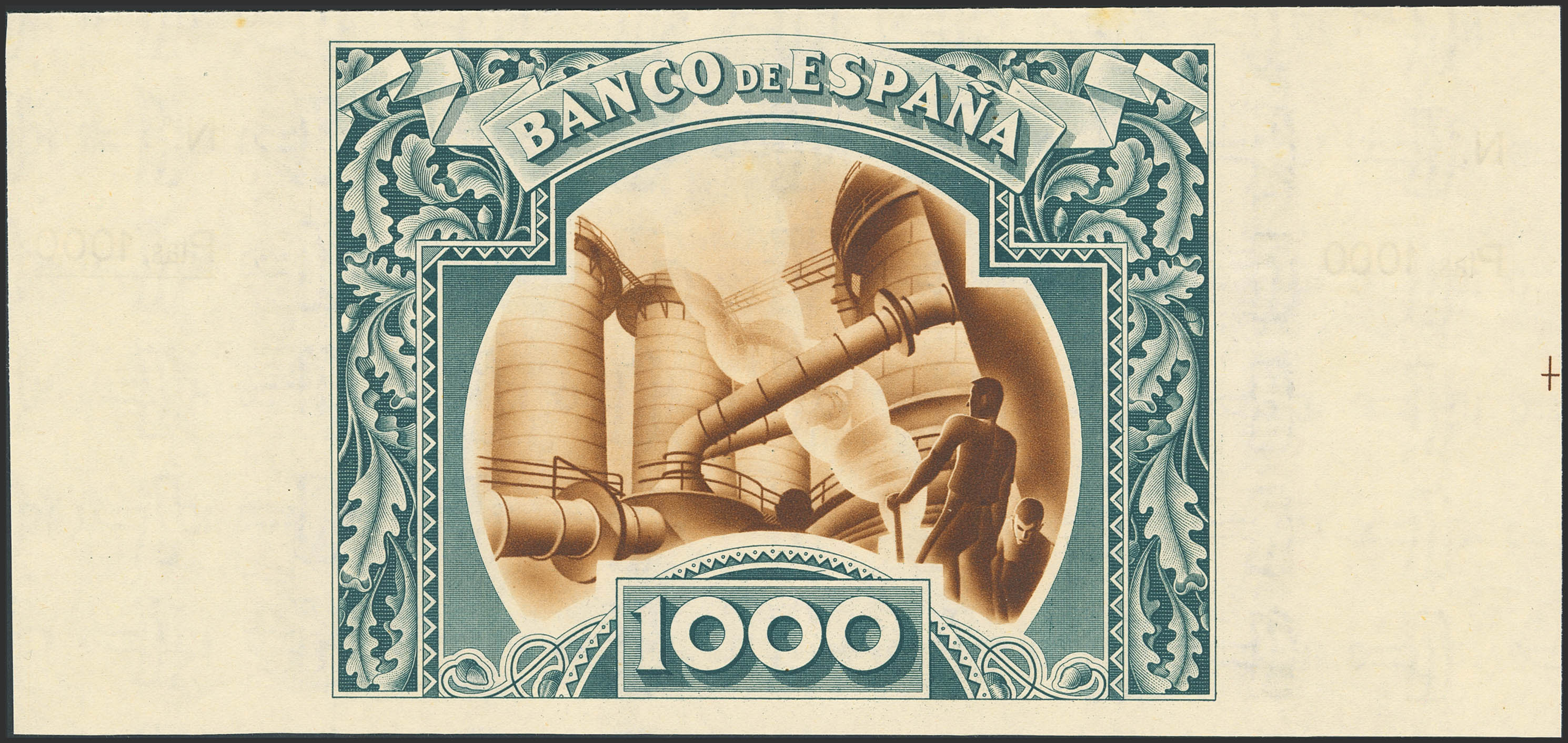 1000 Pesetas. January 1, 1937. Bilbao branch, Banco de Comercio countersigned. Unissued, unserialized, unnumbered, with both dies. (Edifil 2023: NE27c). Original finish, slight age stains. Uncirculated-.