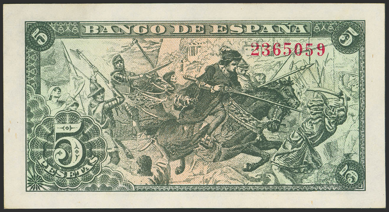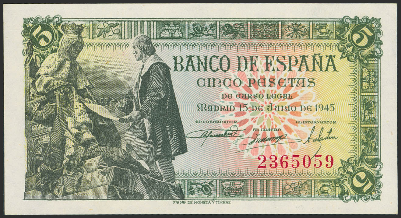 5 Pesetas. June 15, 1945. No series. (Edifil 2023: 449). Original size. Unused.