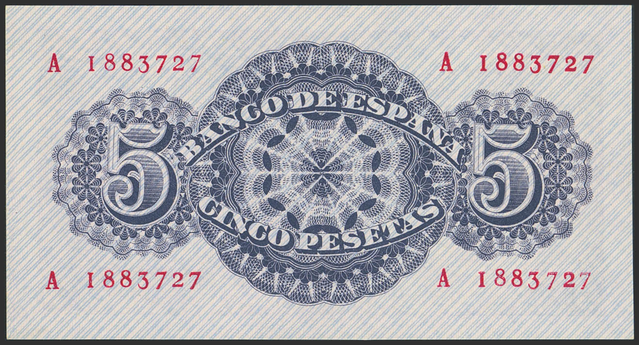 5 Pesetas. April 12, 1947. Series A. (Edifil 2023: 454a). Part of the original size is retained. Unused.