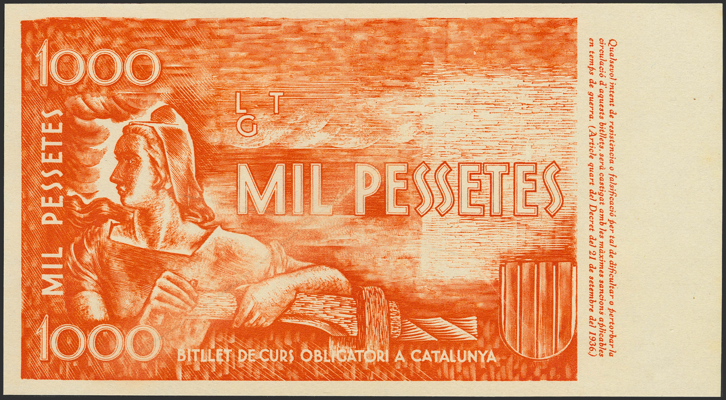 Orange reverse proof of an unissued 1000-peseta banknote issued by the Generalitat de Catalunya (privately issued banknote, without legal backing). Uncirculated-.