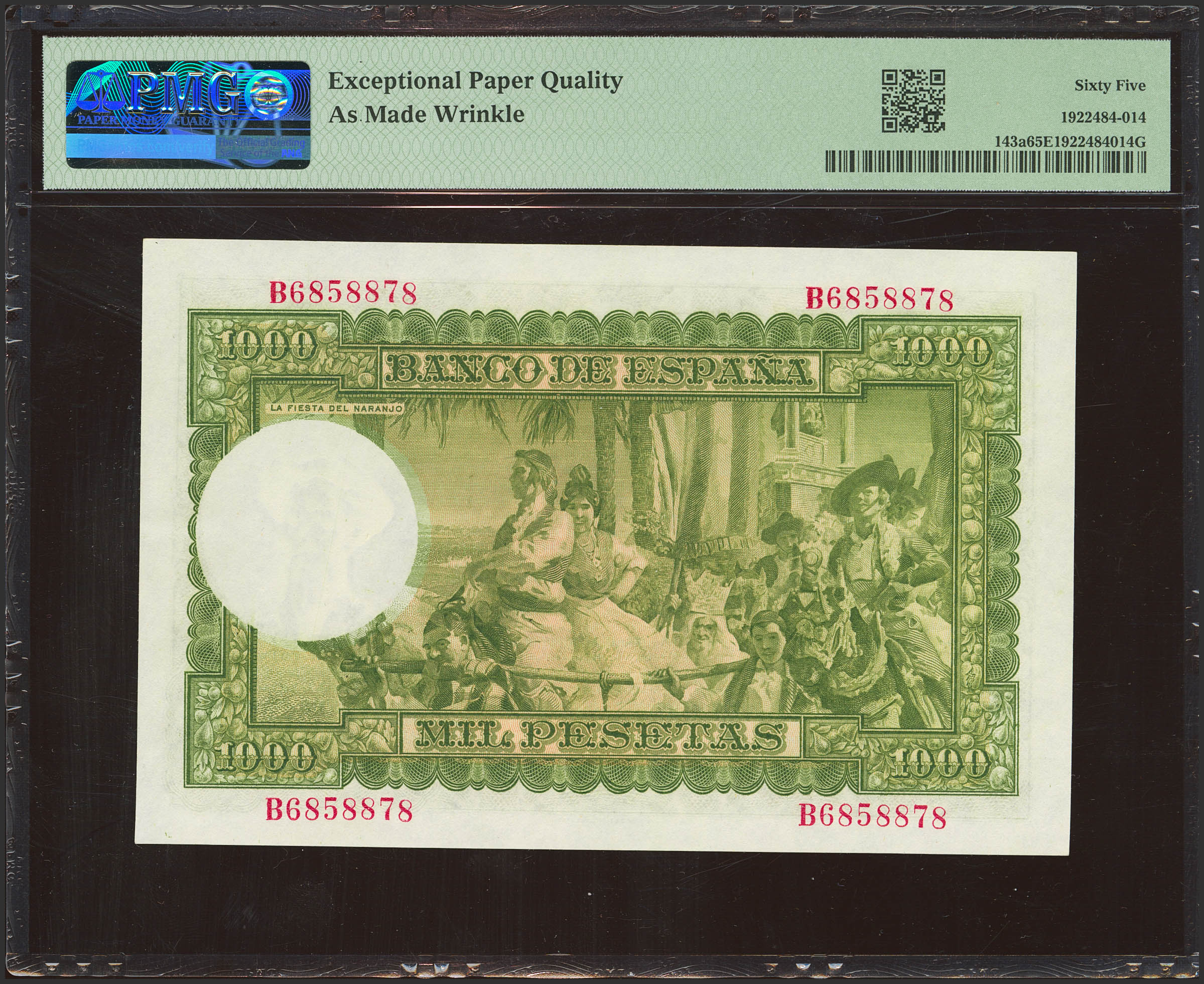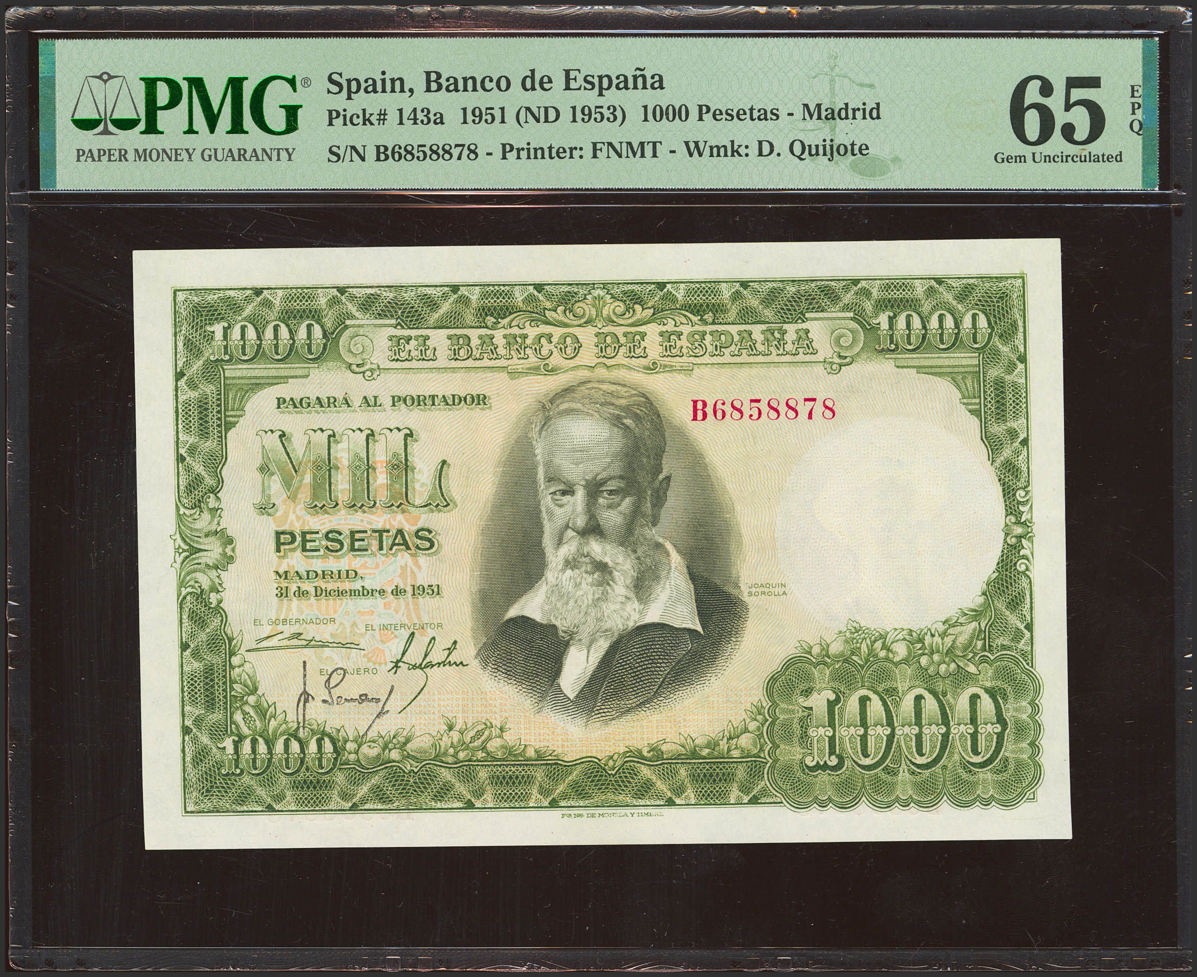 1000 Pesetas. December 31, 1951. Series B. (Edifil 2021: 463a, Pick: 143a). Unusual in this exceptional quality, original finish. Uncirculated. Encapsulated PMG65EPQ.