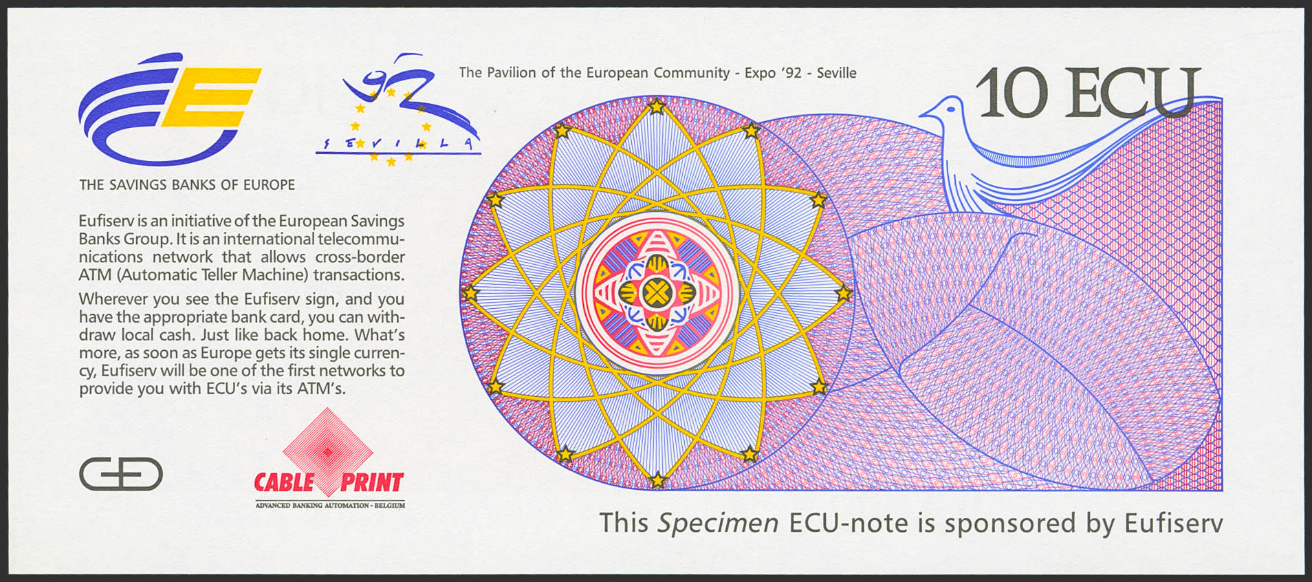 10 Ecu. 1992. Specimen. Promotional banknote of the single European currency, the Ecu, displayed in the European Community Pavilion at the Universal Exposition in Seville. Very rare. Unused.