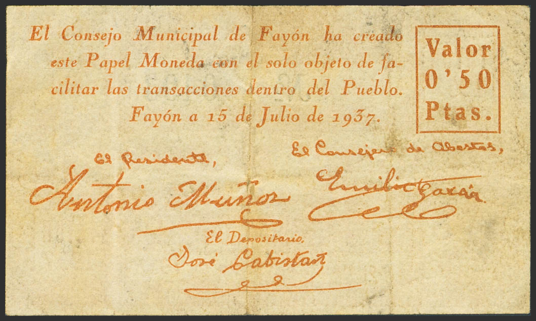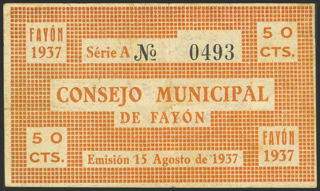 English FAYON (ZARAGOZA). 50 Cents. August 15, 1937. Series A. (González: 2420). Queer. Good Very Fine.