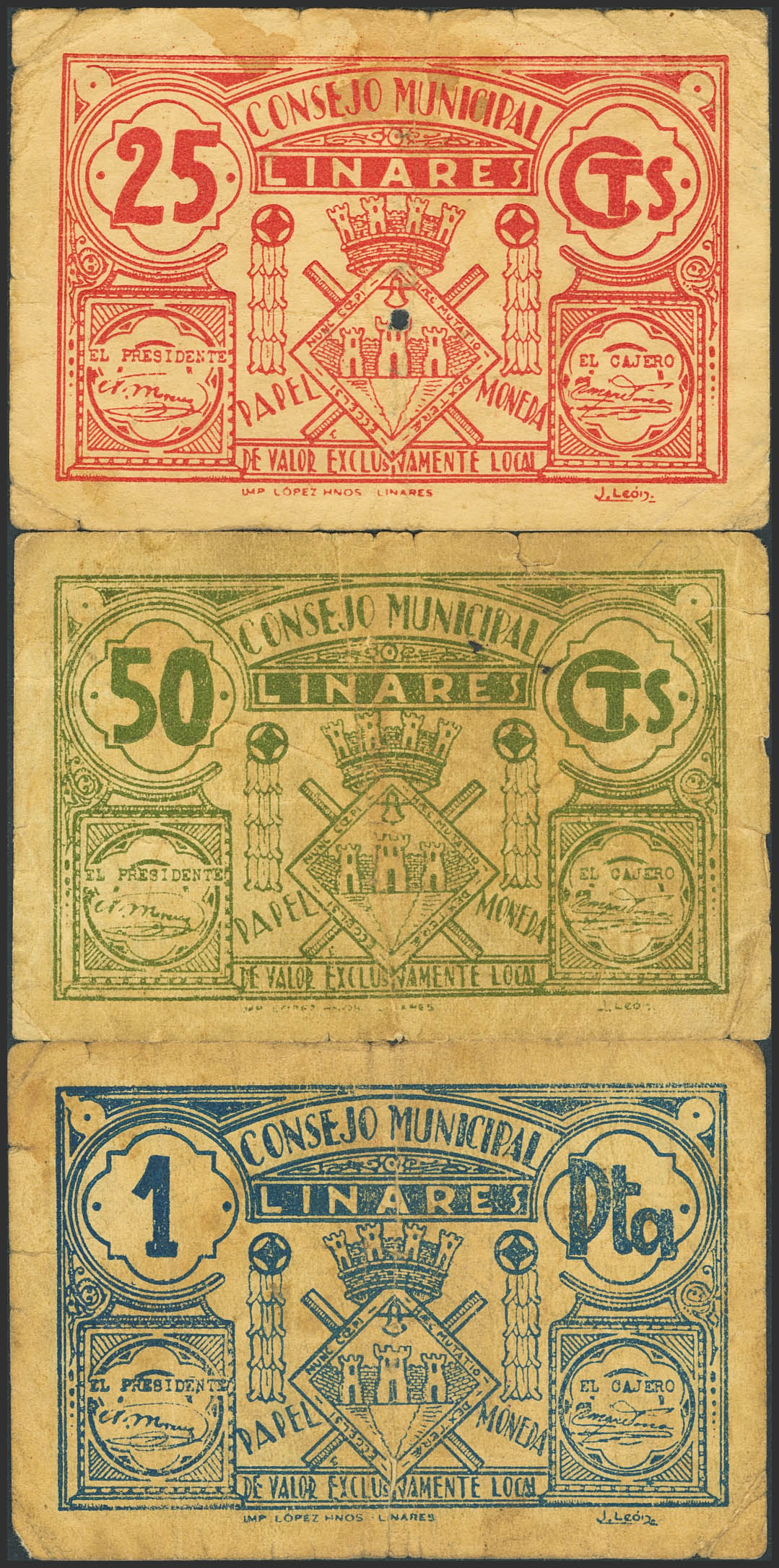 LINARES (JAEN). 25 Cents, 50 Cents, and 1 Peseta. (1937ca). (González: 3161/63). Complete set. Fine-.