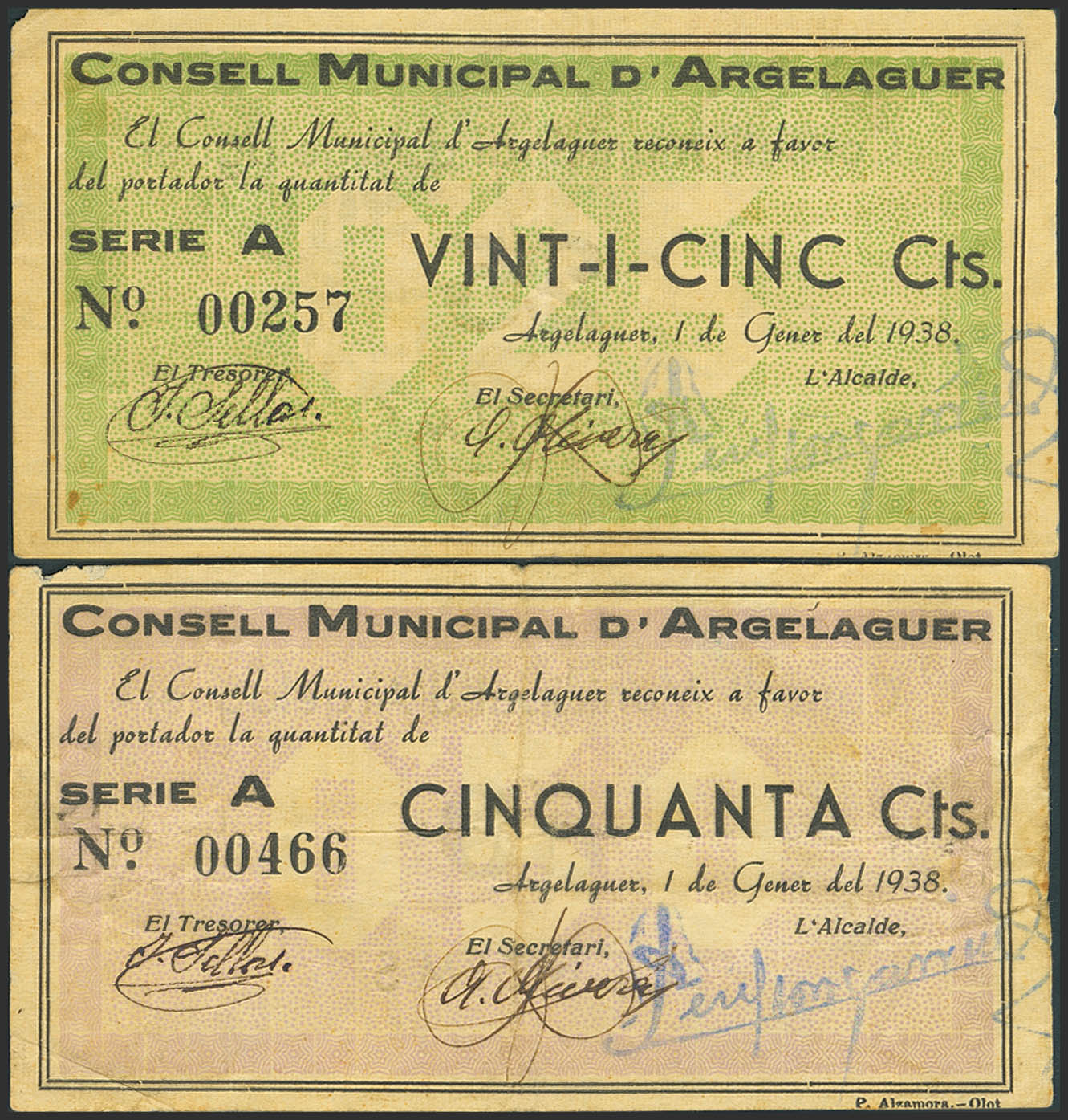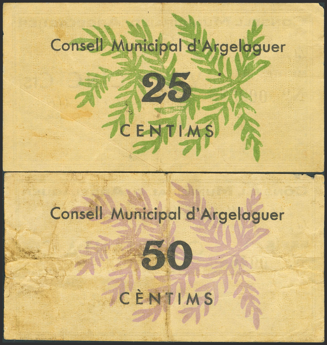 ARGELAGER (GERONA). 25 and 50 cent coins. January 1, 1938. Series A, both. (González: 6379/80). Very rare complete set. VF-.