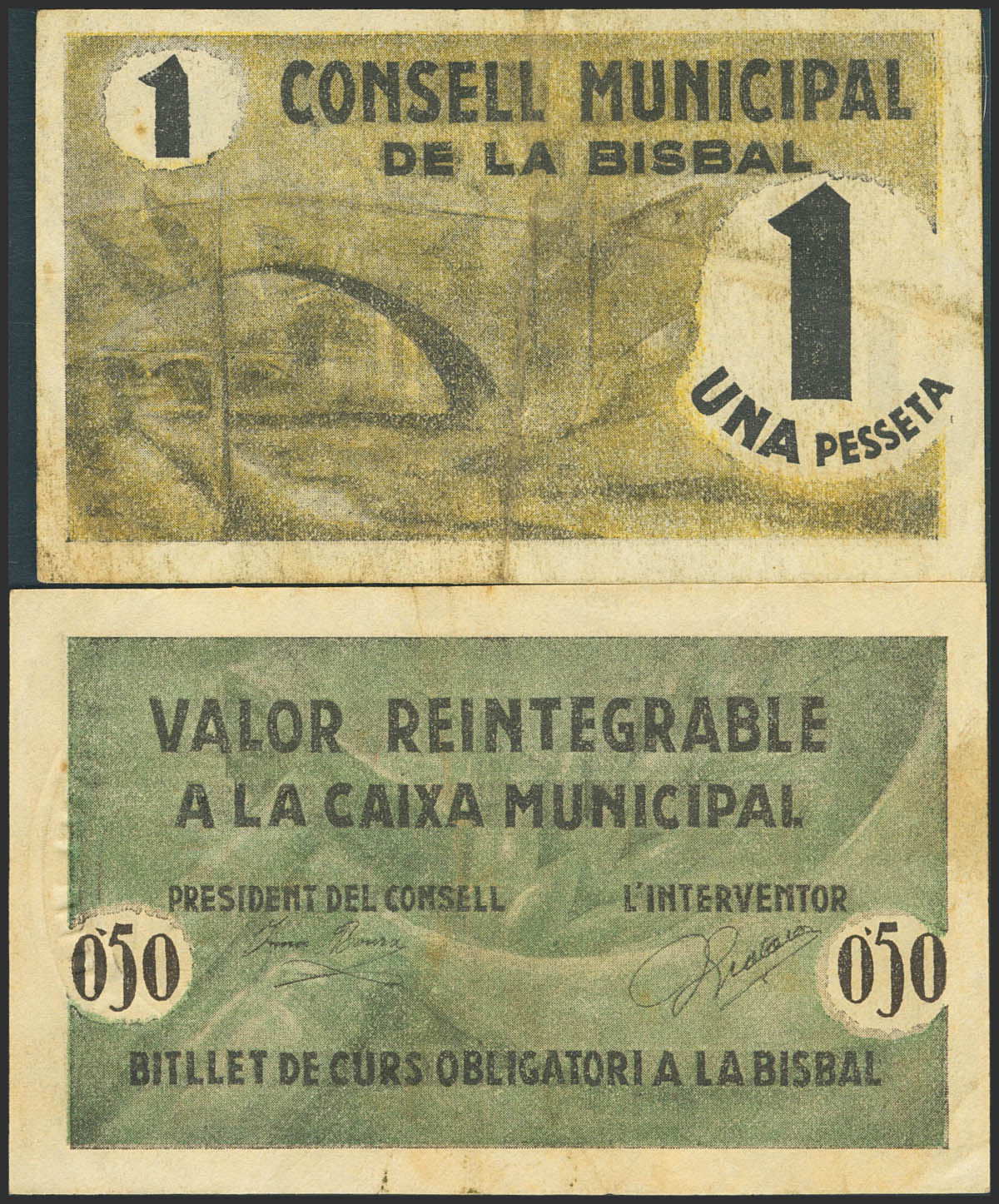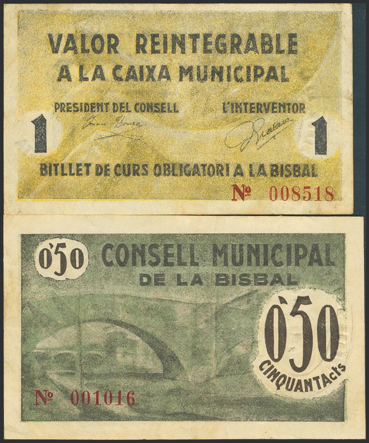 BISBAL DE EMPORDA (GERONA). 50 Cents and 1 Peseta. (1937ca). (González: 7062/63). Complete series. Very Fine.