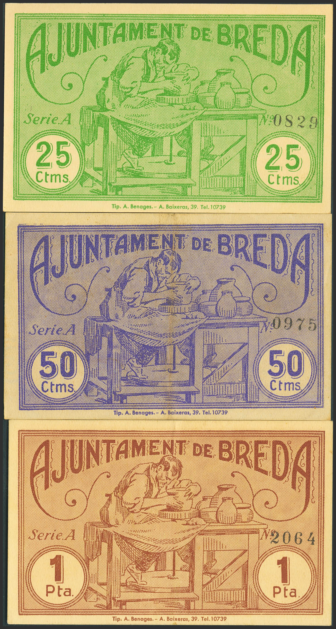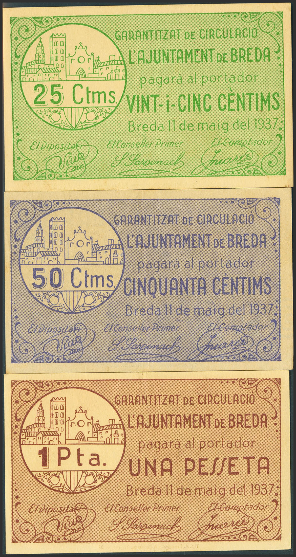 English BREDA (GERONA). 25 Cents, 50 Cents, and 1 Peseta. May 11, 1937. Series A, all. (González: 7199/01). Rare complete set. UNC/Extremely Fine.